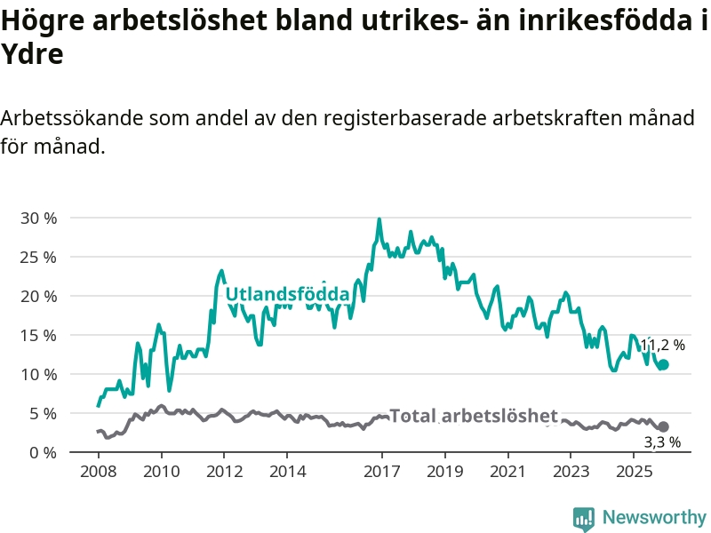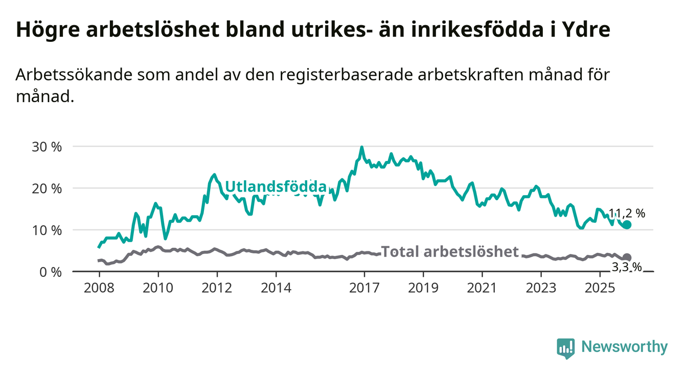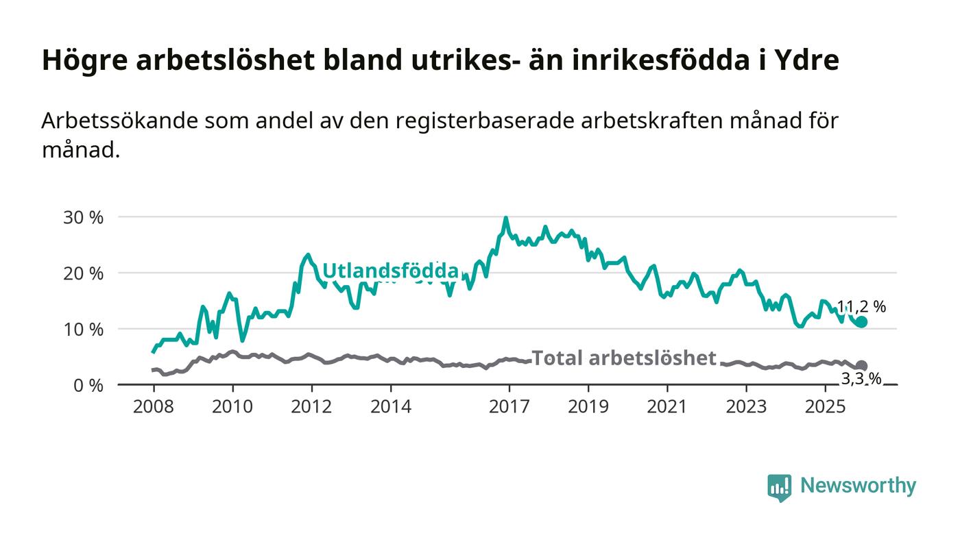 Arbetslösheten bland utlandsfödda var 11,2 procent i Ydre under december månad, motsvarande 20 av 179 personer. Det är 3,7 procentenheter färre än vid samma tidpunkt i fjol (−6 om man räknar personer).