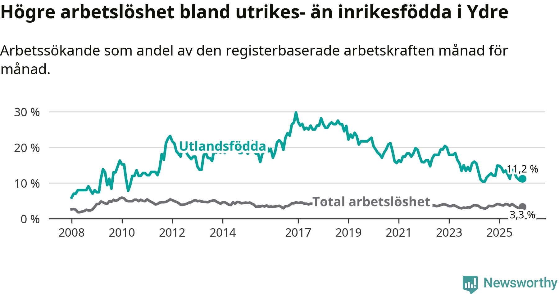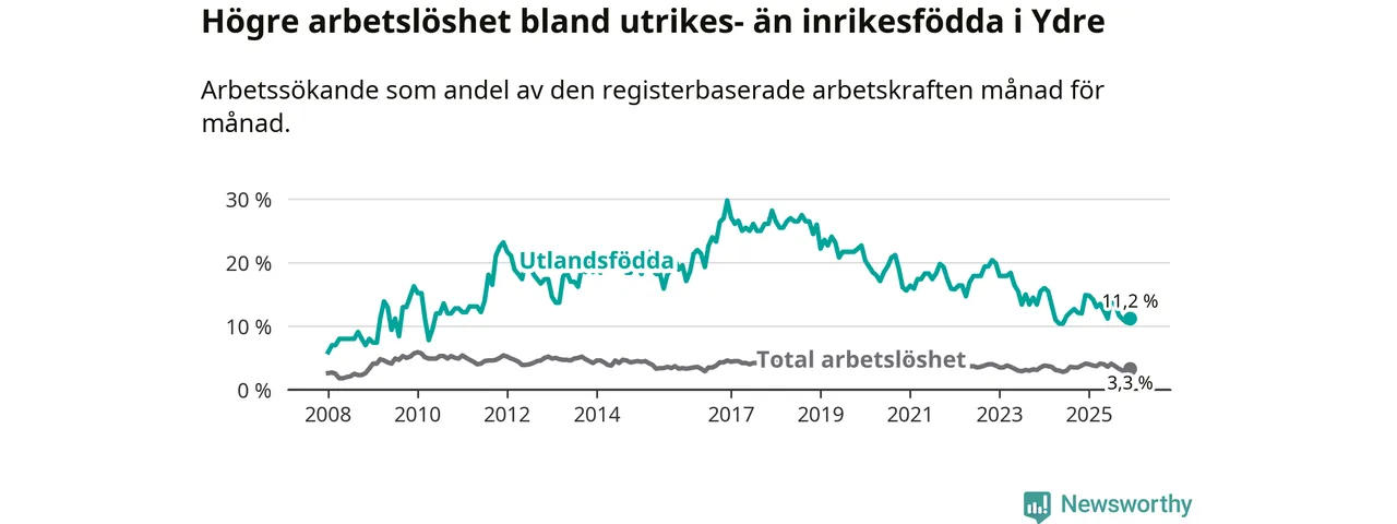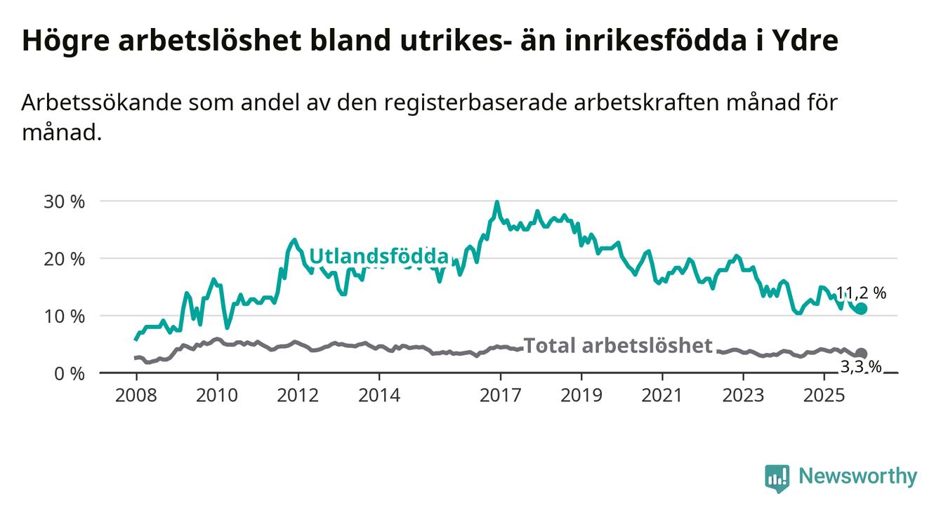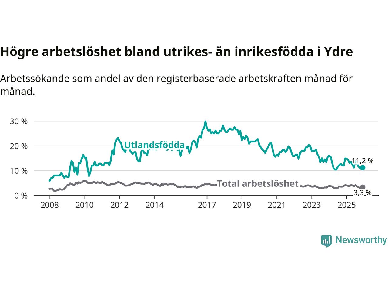 Skillnaden i arbetslöshet mellan utrikesfödda och hela befolkningen är 7,9 procentenheter i Ydre. Det är en betydligt mindre skillnad än för ett år sedan (−2,9 procentenheter).