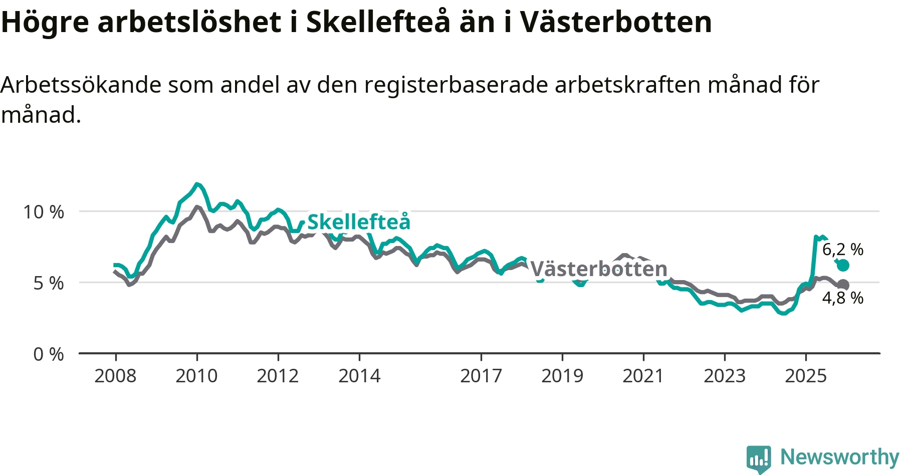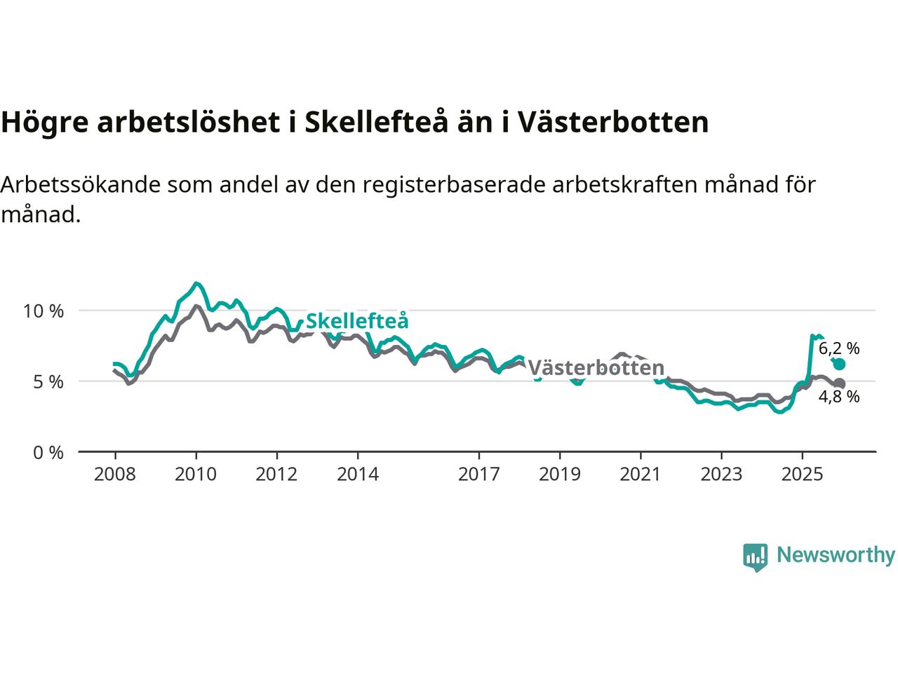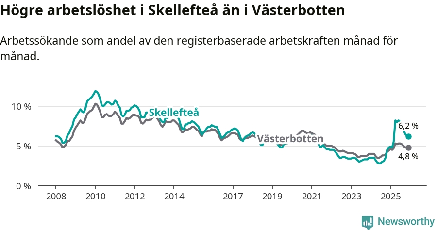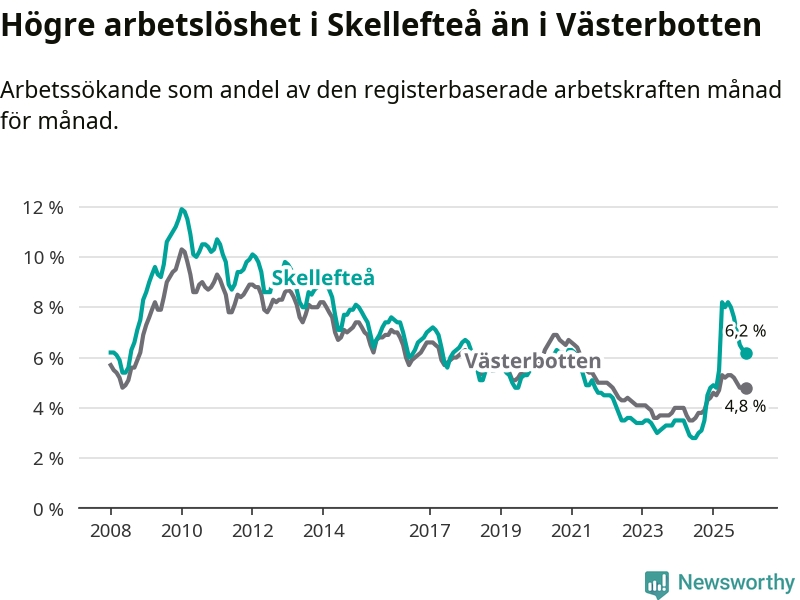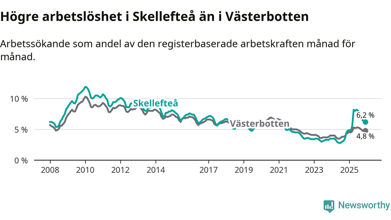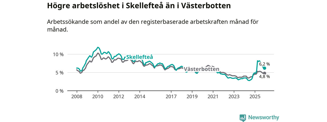 Skellefteå hade redan tidigare högre arbetslöshet än snittet i hela Västerbottens län och nu växer klyftan (6,2 procent i kommunen, jämfört med 4,8 procent i hela länet). Skellefteå har därmed även den högsta arbetslöshetsnivån i länet. Sorsele har den lägsta (2,6 procent). För att Skellefteå skulle komma ner i samma arbetslöshetsnivå som Sorsele skulle 1 413 personer behöva sysselsättas.