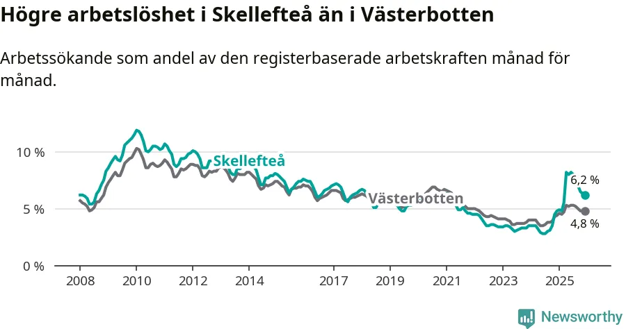 Det är 15:e månaden i följd som arbetslösheten i Skellefteå är högre än den var under samma tidpunkt året innan. Sedan september 2024 har arbetslösheten gått upp från 3,1 till 6,2 procent.