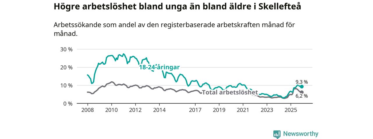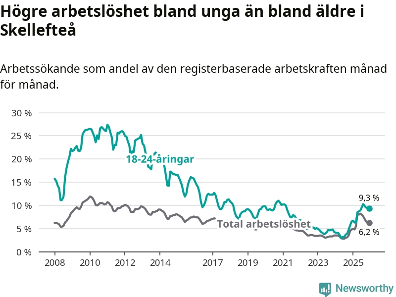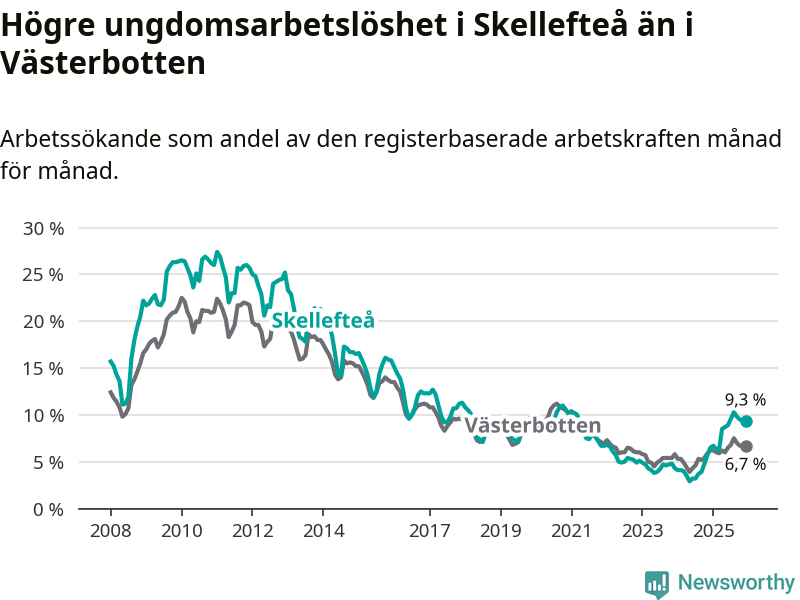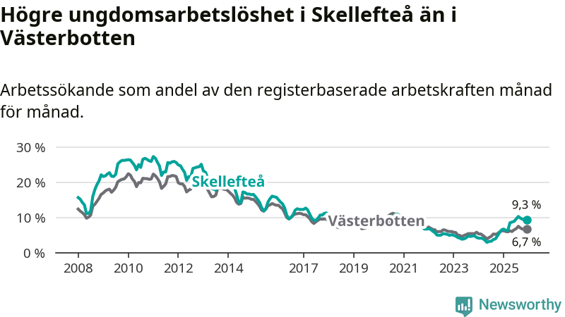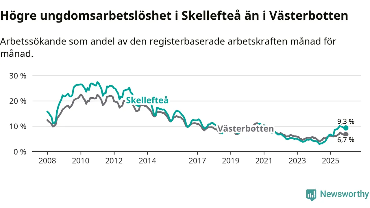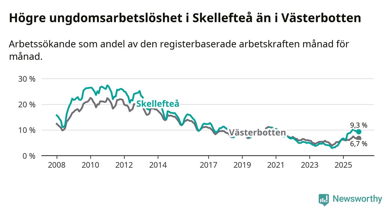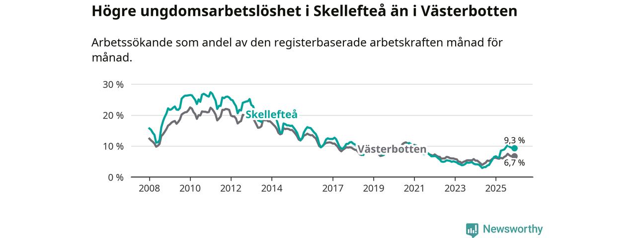 Precis som den totala arbetslösheten ligger ungdomsarbetslösheten i Skellefteå högre än i Västerbotten som helhet. Skillnaden mellan kommunen och länet är 2,6 procentenheter.