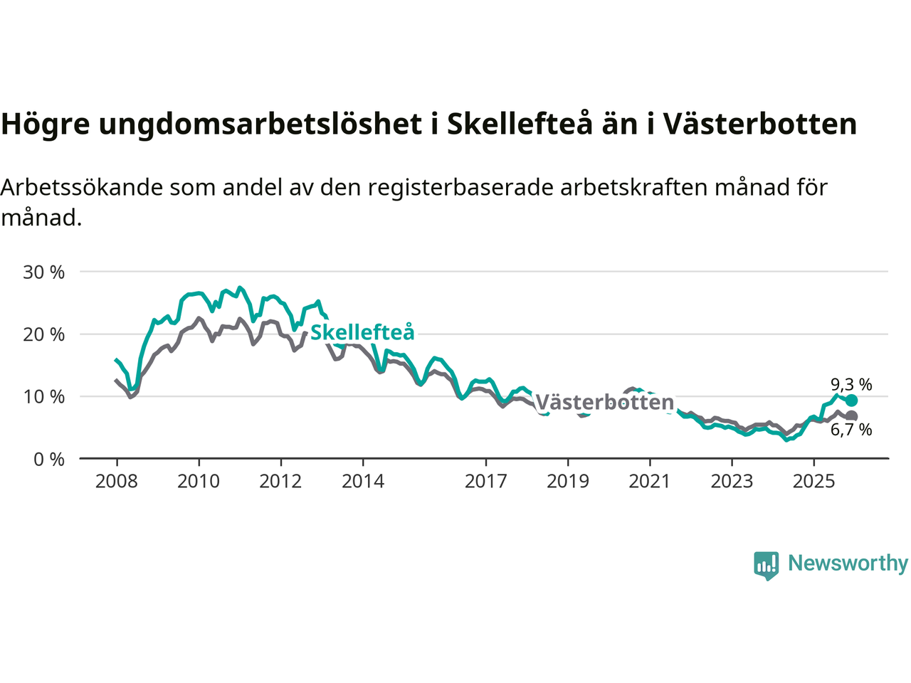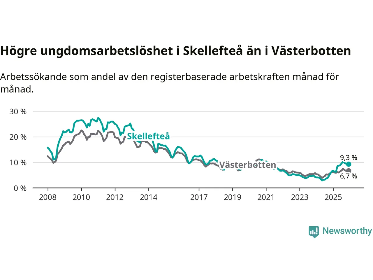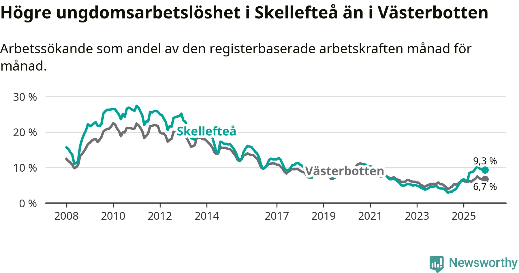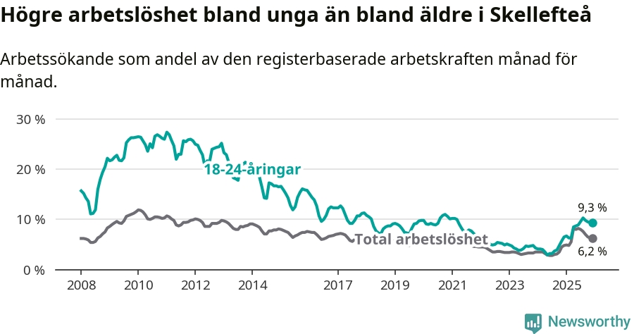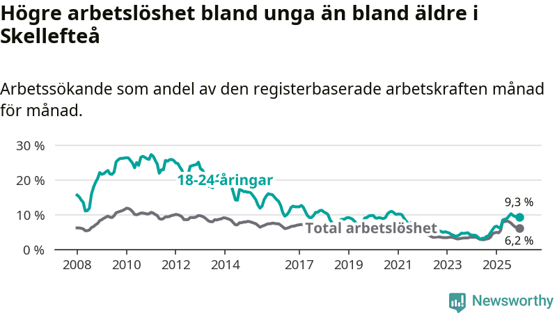 Precis som den totala arbetslösheten ligger ungdomsarbetslösheten i Skellefteå högre än i Västerbotten som helhet. Skillnaden mellan kommunen och länet är 2,6 procentenheter.