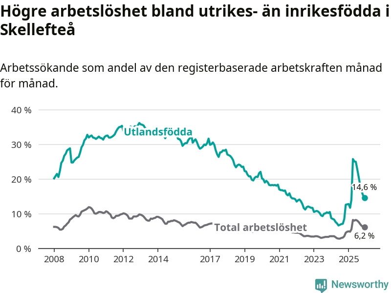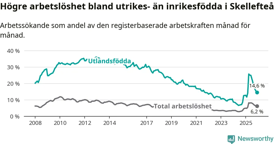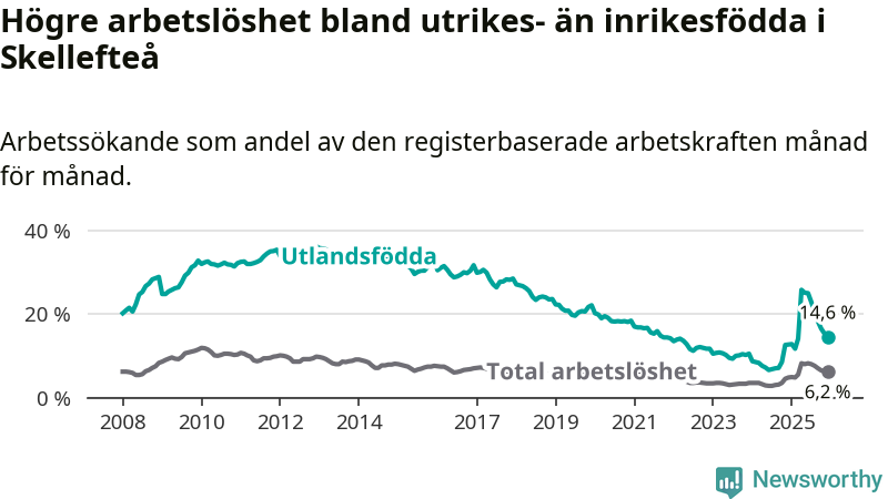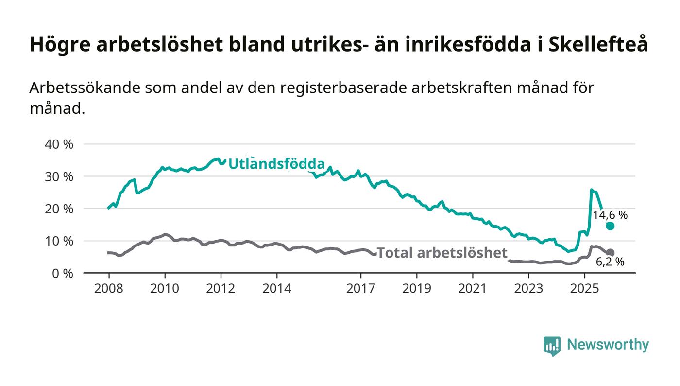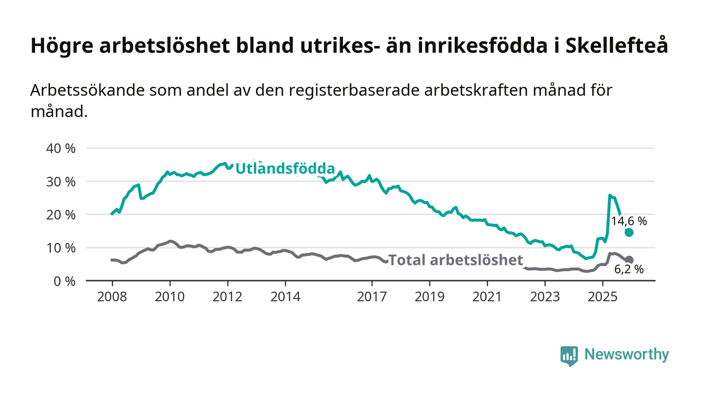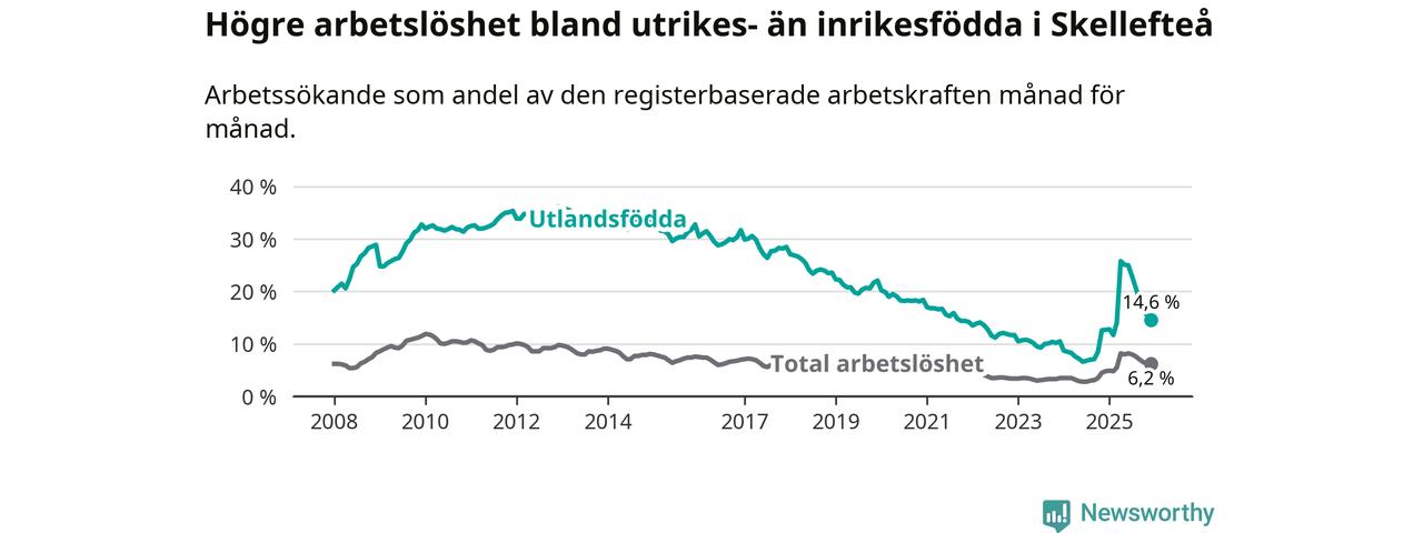Arbetslösheten bland utlandsfödda var 14,6 procent i Skellefteå under december månad, motsvarande 1 057 av 7 240 personer. Det är 1,9 procentenheter fler än vid samma tidpunkt i fjol (+165 om man räknar personer). Därmed är de utlandsföddas arbetslöshet högre än vid samma tidpunkt i fjol för 14:e månaden i följd. Sedan oktober 2024 har arbetslösheten bland utlandsfödda ökat från 8,5 till 14,6 procent.