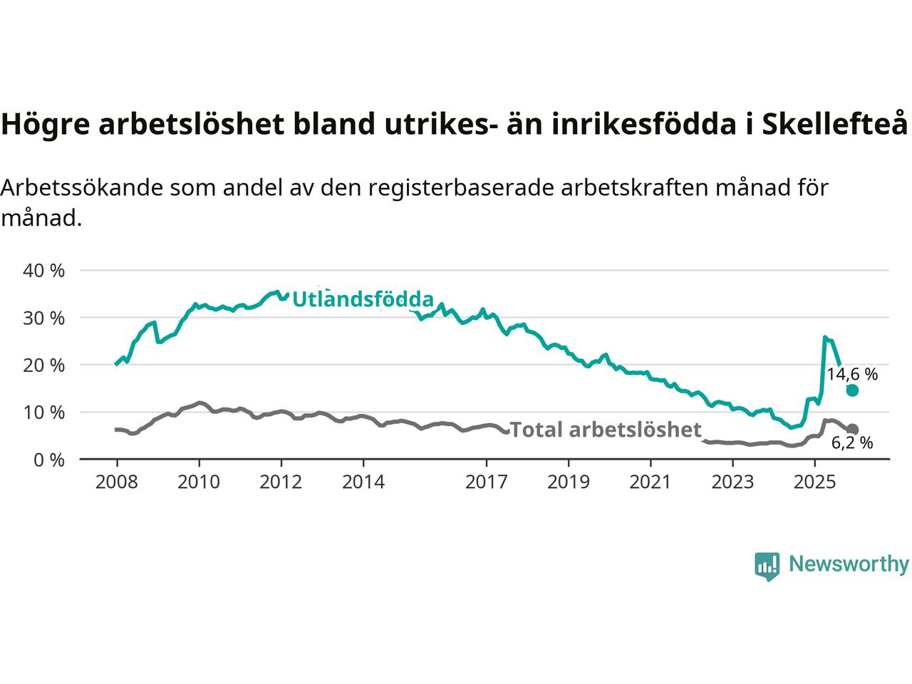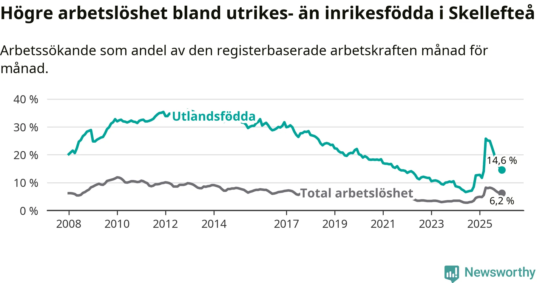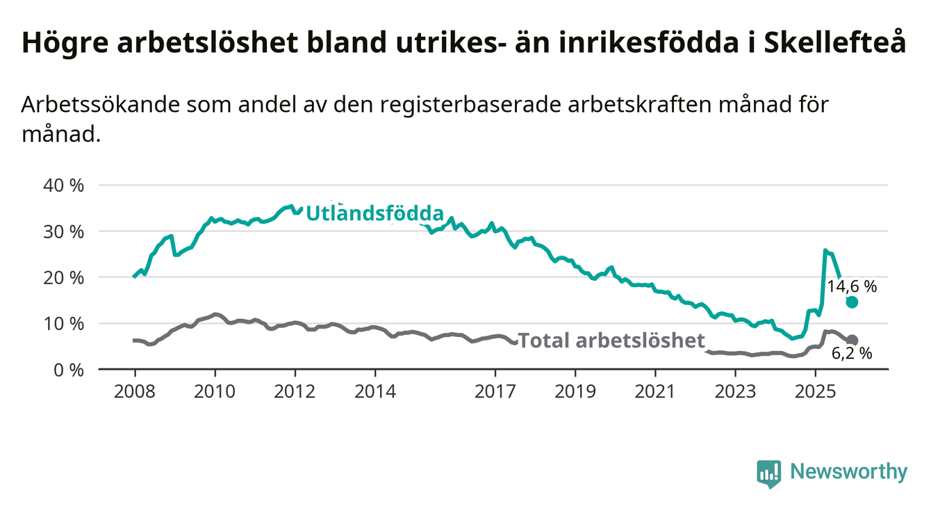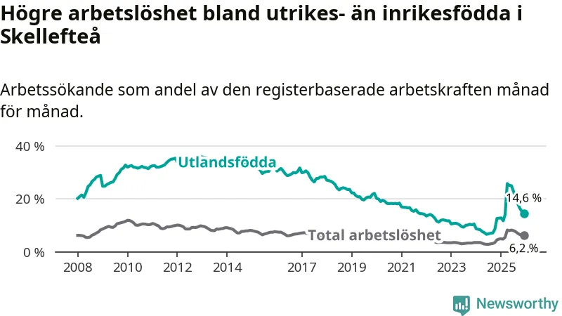 Arbetslösheten bland utlandsfödda var 14,6 procent i Skellefteå under december månad, motsvarande 1 057 av 7 240 personer. Det är 1,9 procentenheter fler än vid samma tidpunkt i fjol (+165 om man räknar personer). Därmed är de utlandsföddas arbetslöshet högre än vid samma tidpunkt i fjol för 14:e månaden i följd. Sedan oktober 2024 har arbetslösheten bland utlandsfödda ökat från 8,5 till 14,6 procent.