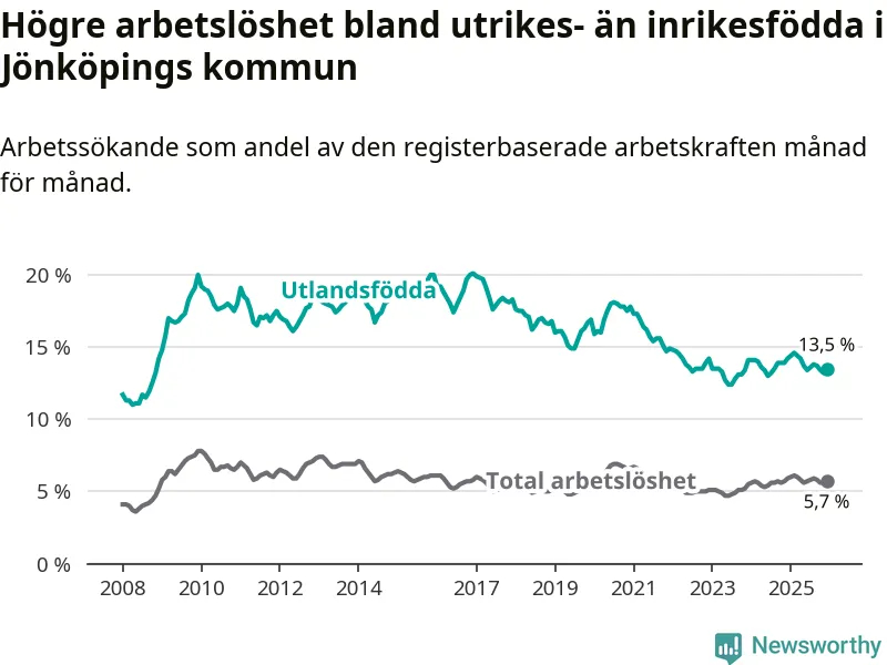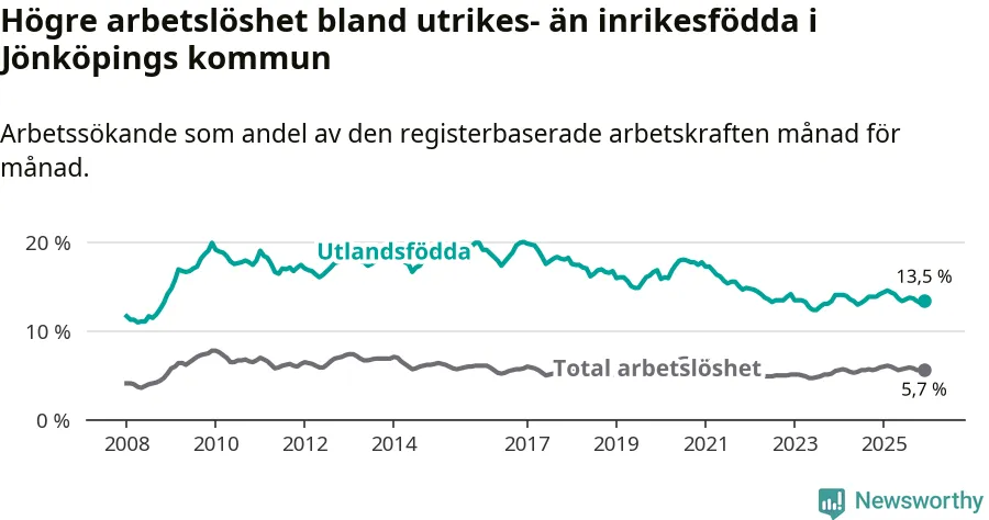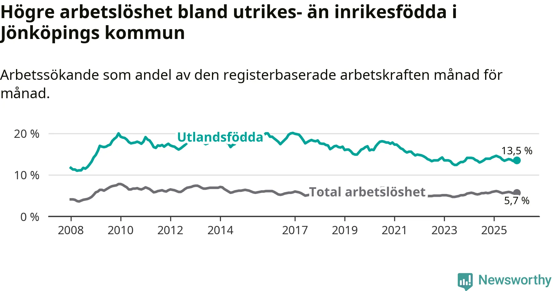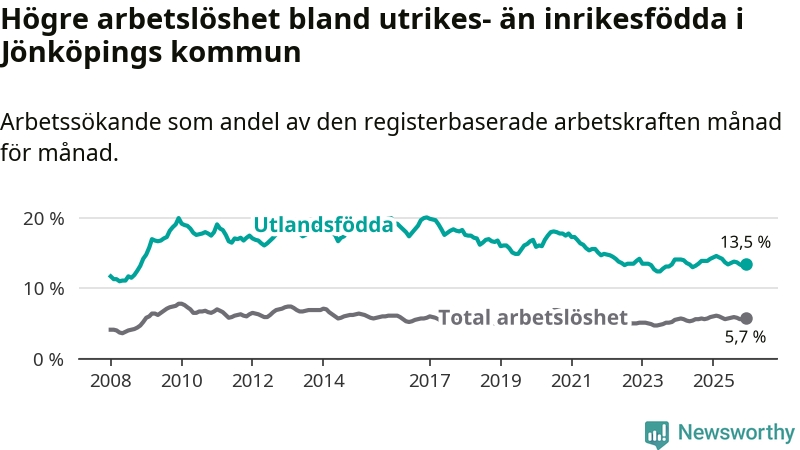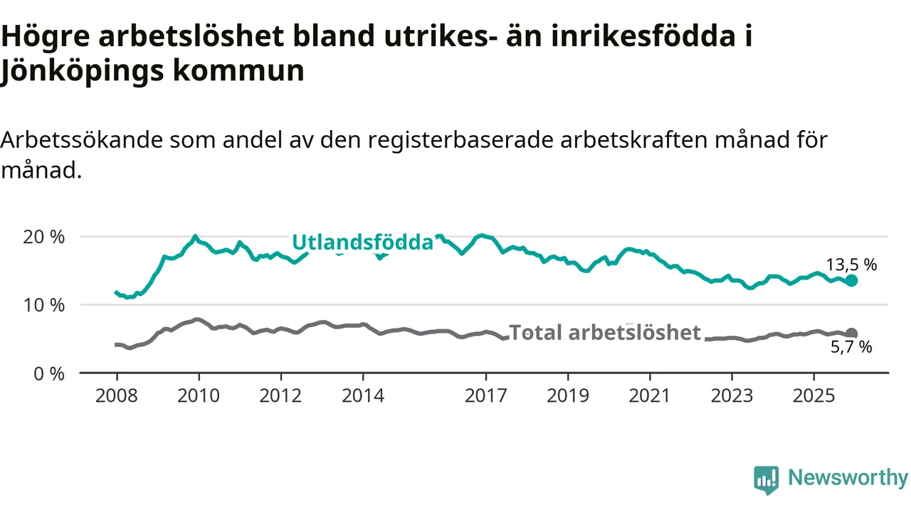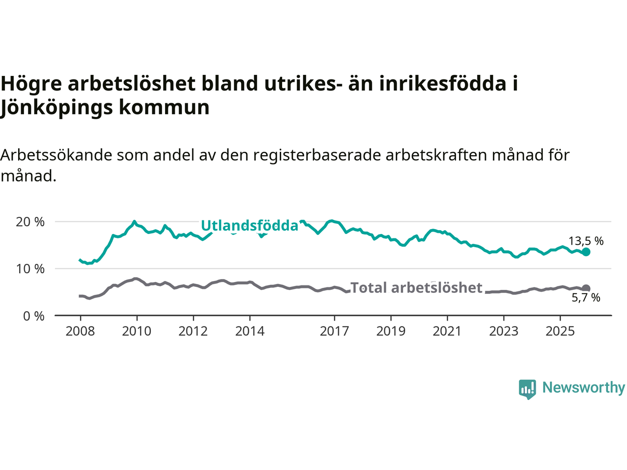 Arbetslösheten bland utlandsfödda var 13,5 procent i Jönköping under december månad, motsvarande 2 496 av 18 489 personer. Det är 0,7 procentenheter färre än vid samma tidpunkt i fjol (−78 om man räknar personer).