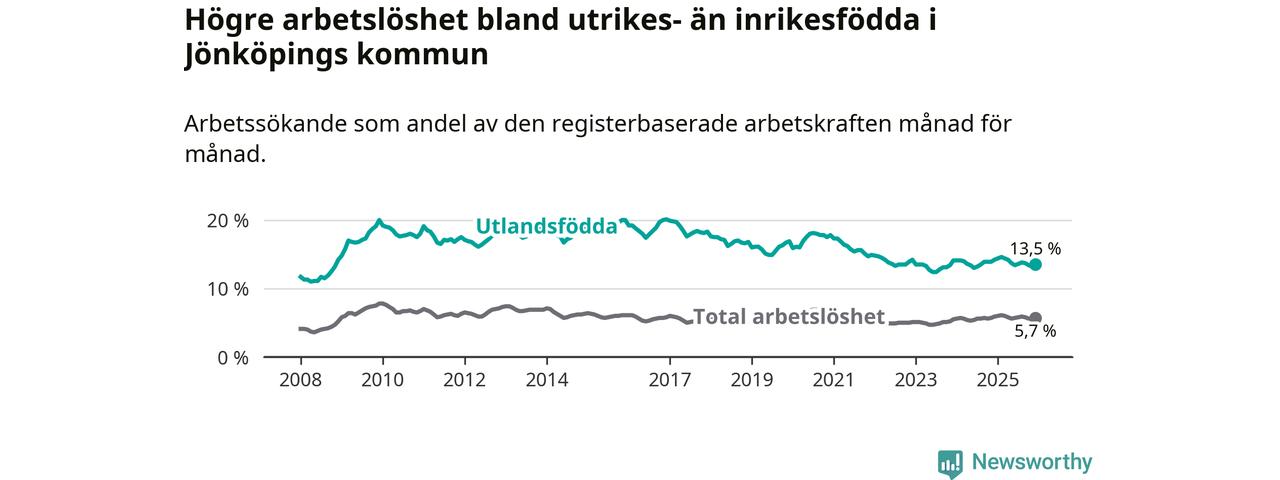 Skillnaden i arbetslöshet mellan utrikesfödda och hela befolkningen är 7,8 procentenheter i Jönköping. Det är en mindre skillnad än för ett år sedan (−0,5 procentenheter).