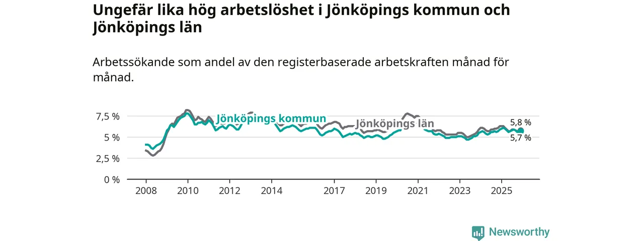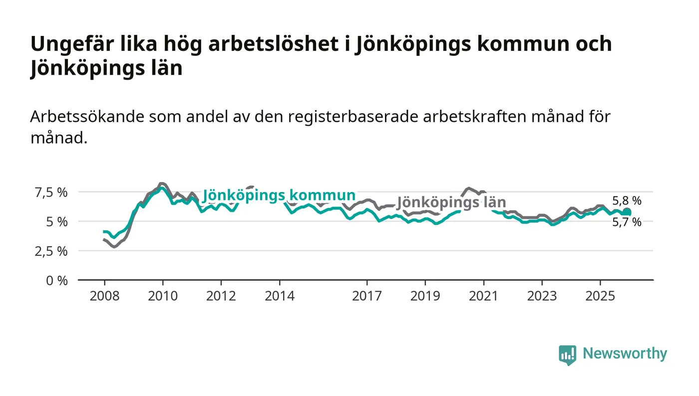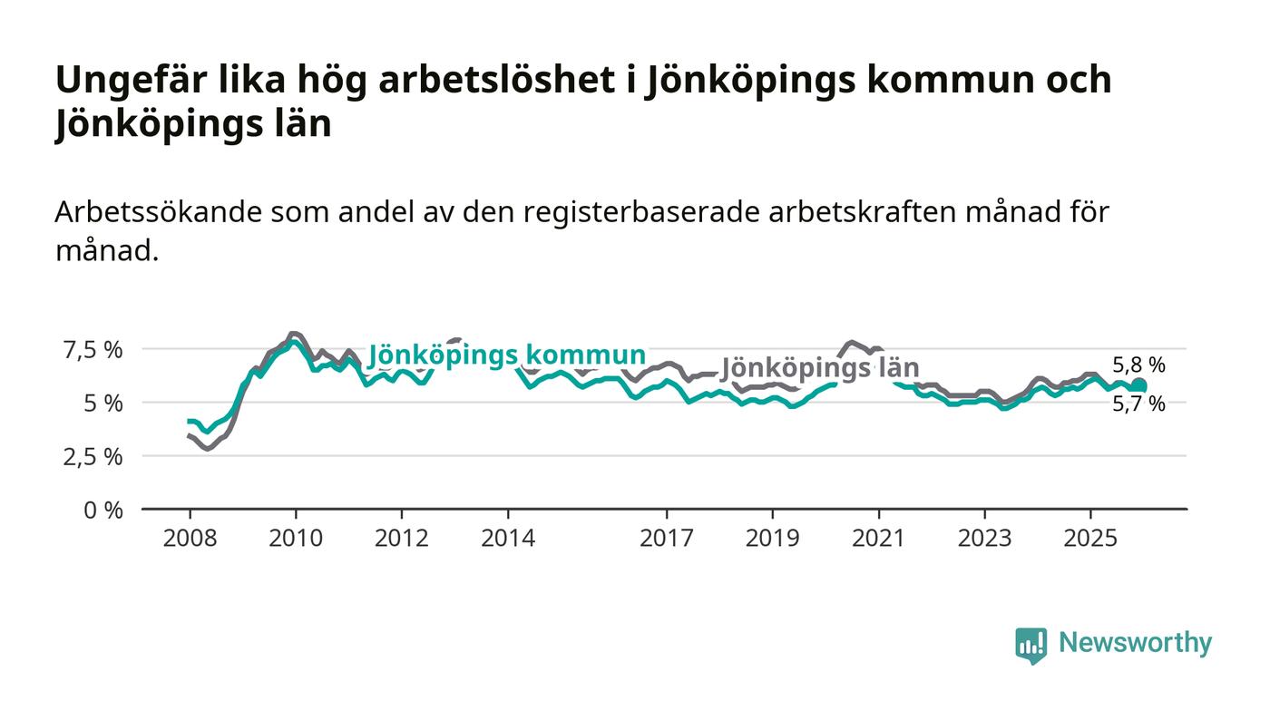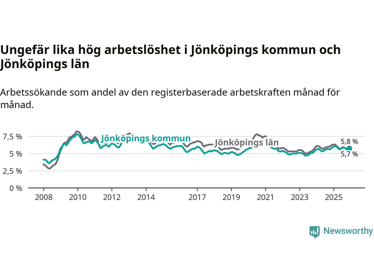 Under december månad rapporterade Jönköpings kommun en total arbetslöshet på 5,7 procent. Det är en minskning jämfört med samma tidpunkt i fjol (−0,2 procentenheter). Även i Jönköpings län sjunker arbetslösheten .