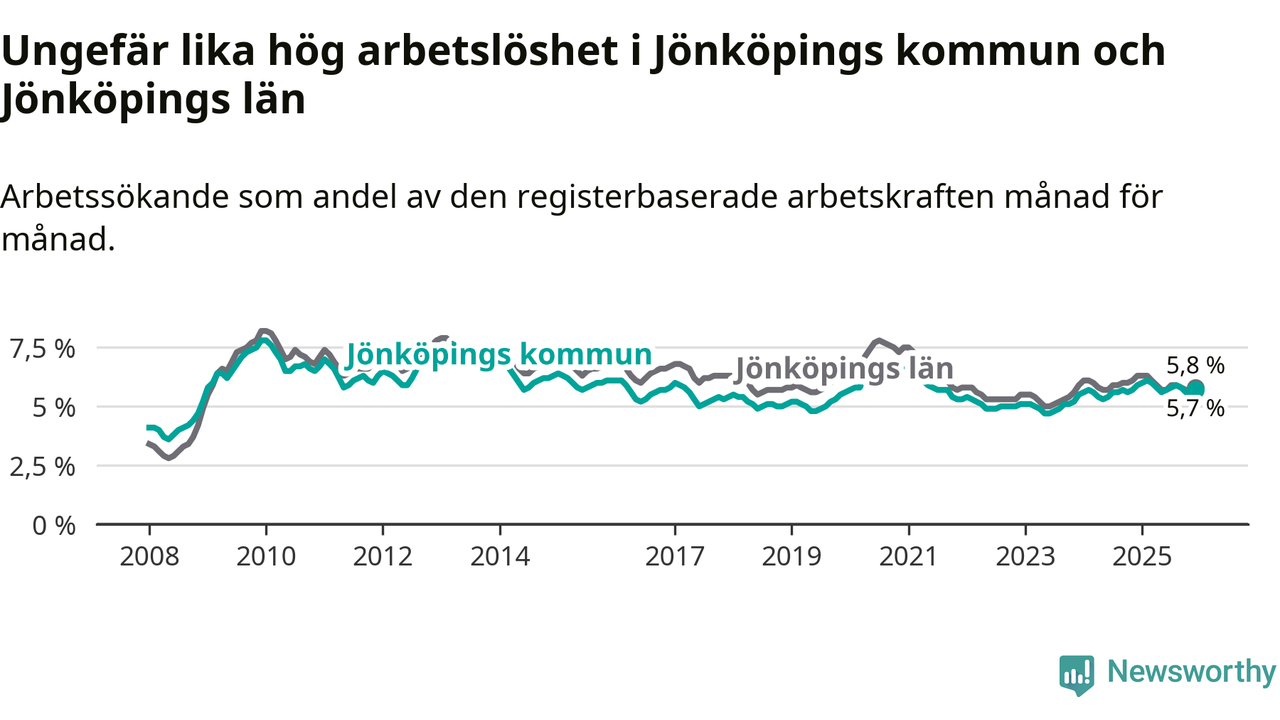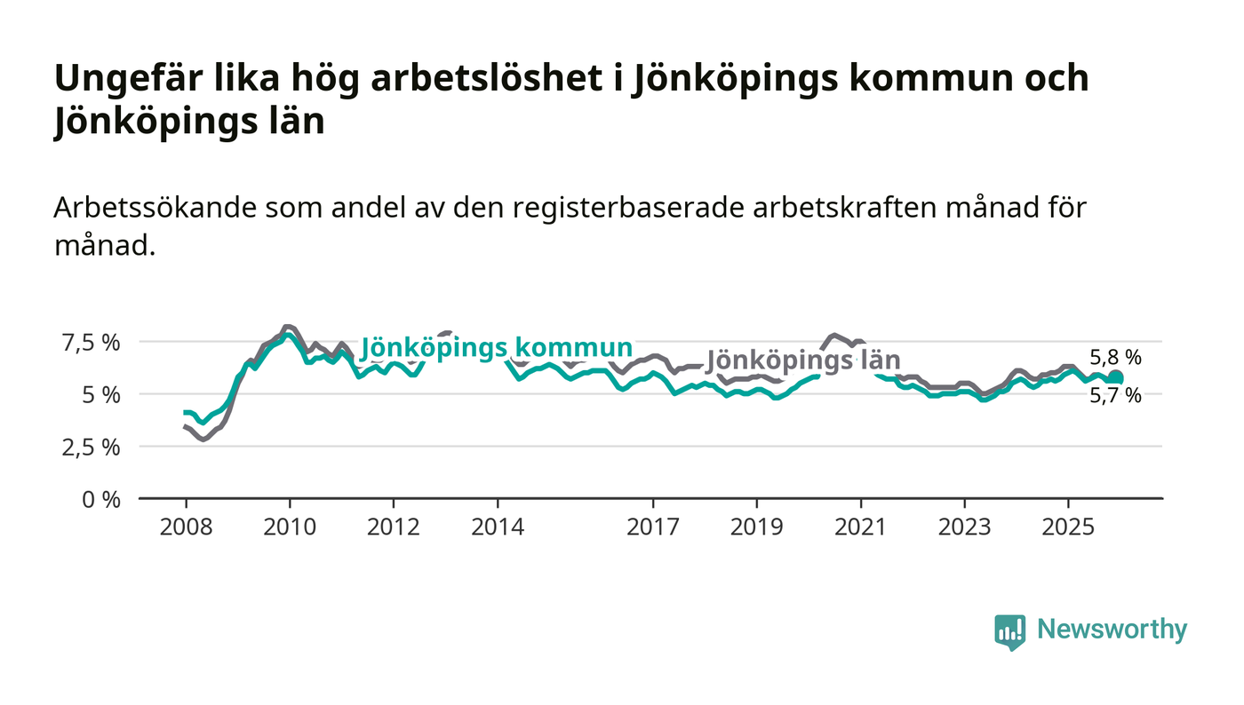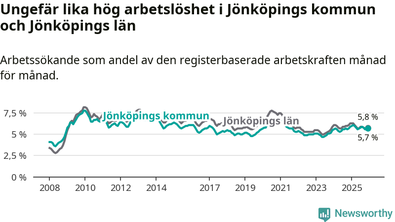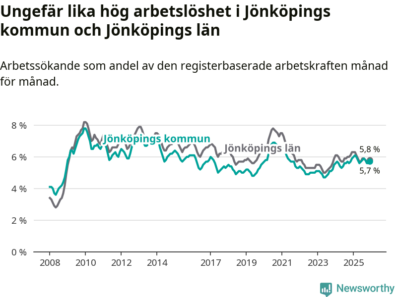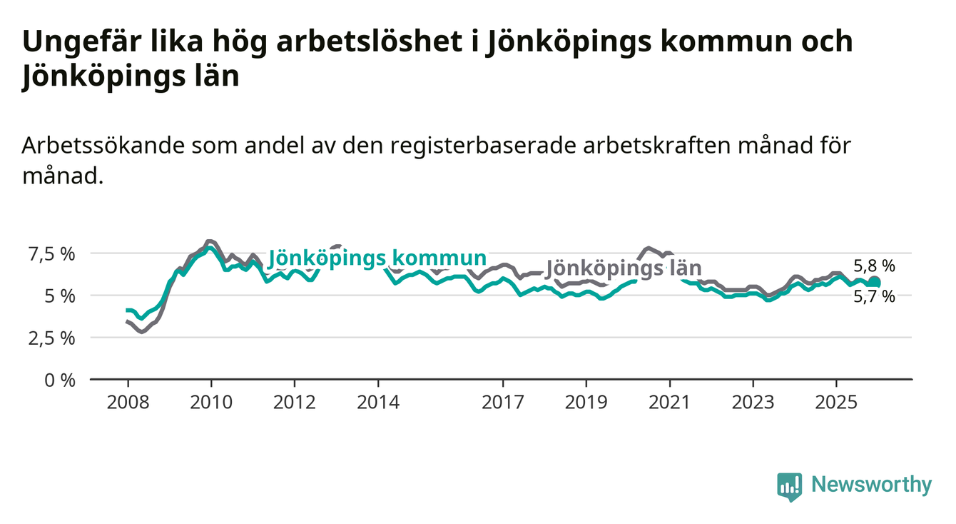 Under december månad rapporterade Jönköpings kommun en total arbetslöshet på 5,7 procent. Det är en minskning jämfört med samma tidpunkt i fjol (−0,2 procentenheter). Även i Jönköpings län sjunker arbetslösheten .
