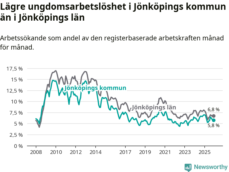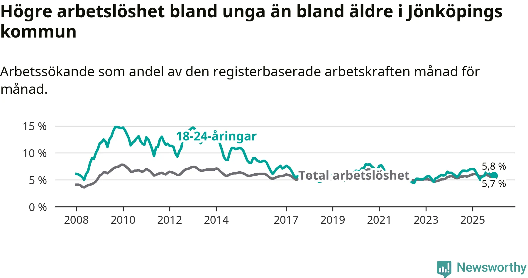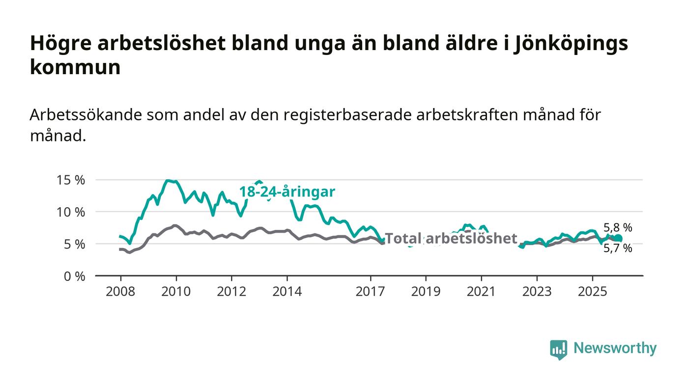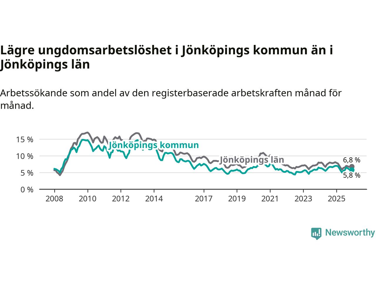 I och med den senaste månadens nedgång har de ungas arbetslöshet i Jönköping sjunkit nio månader i följd (ner från 6,3 procent i mars 2025 till 5,8 procent nu).