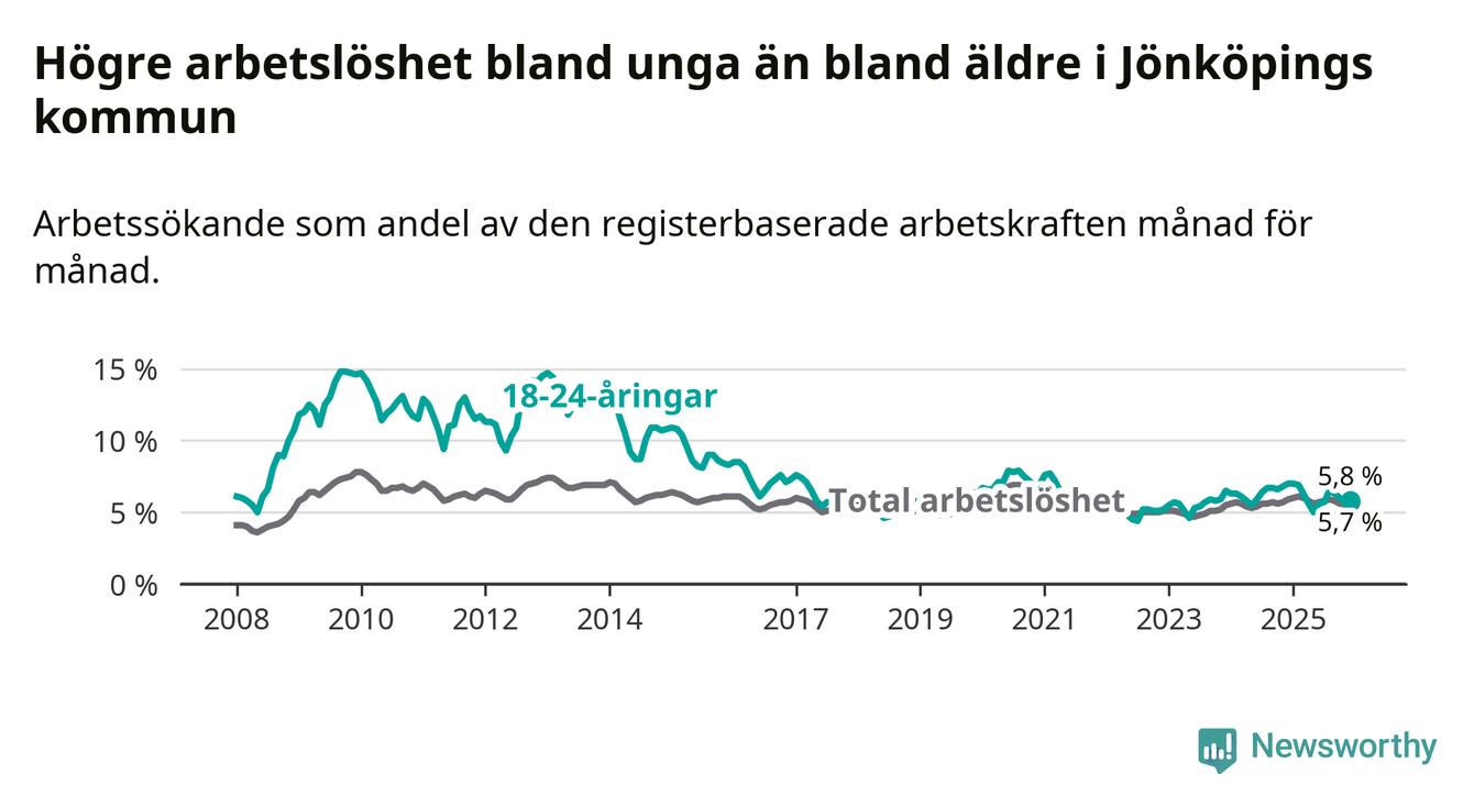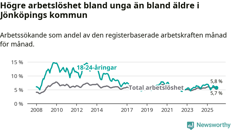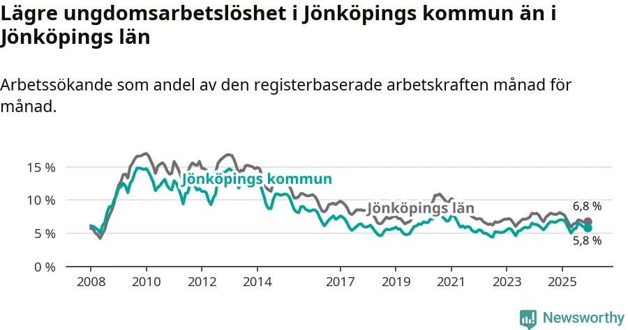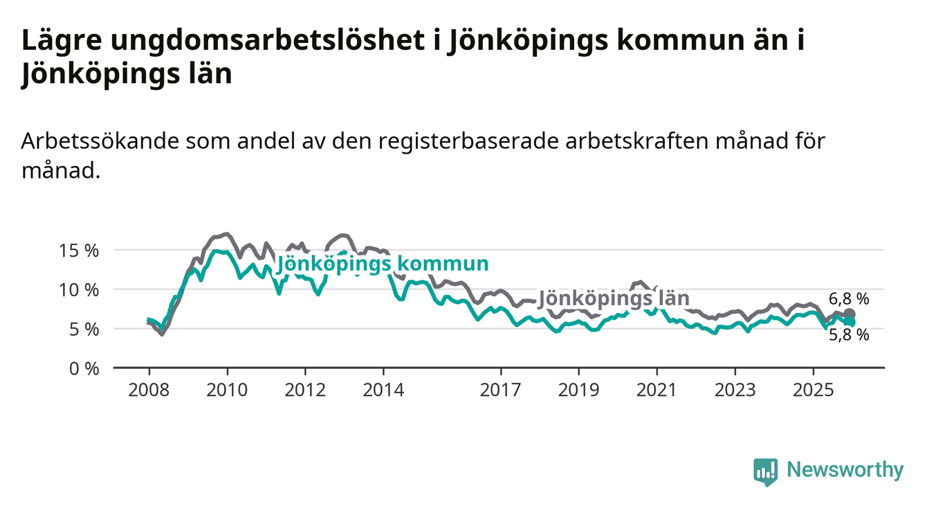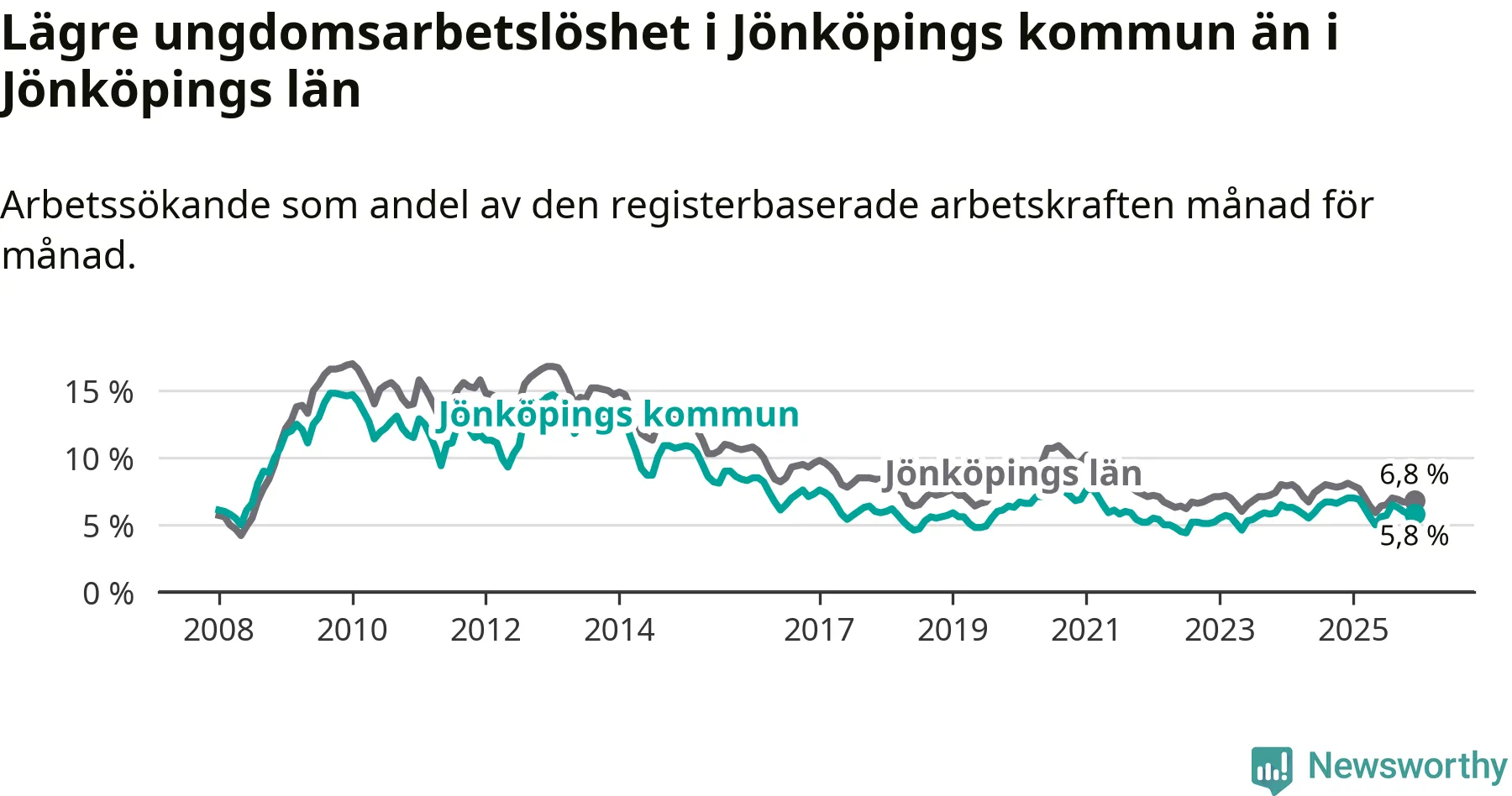 I och med den senaste månadens nedgång har de ungas arbetslöshet i Jönköping sjunkit nio månader i följd (ner från 6,3 procent i mars 2025 till 5,8 procent nu).