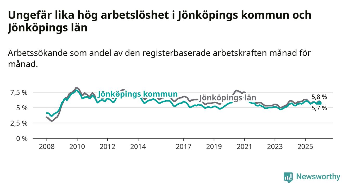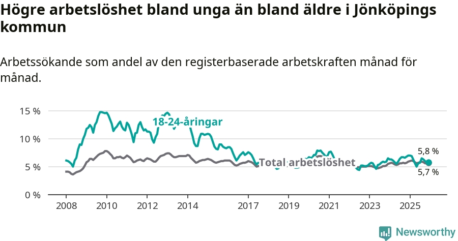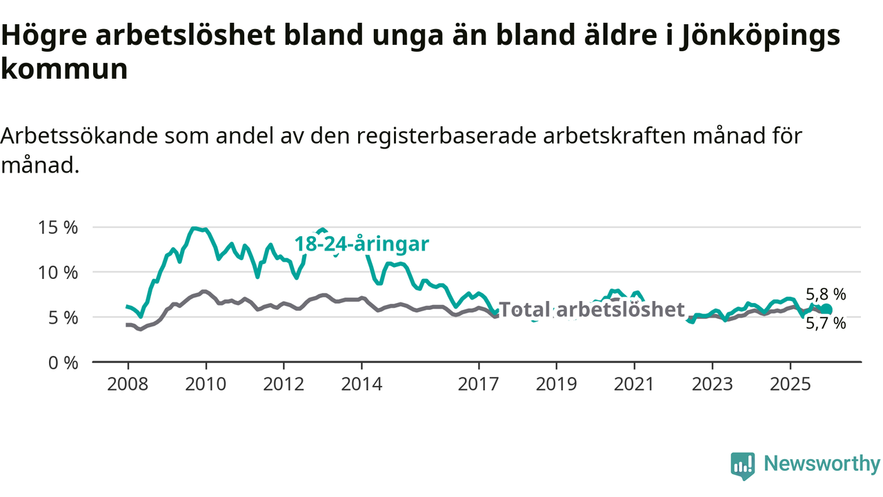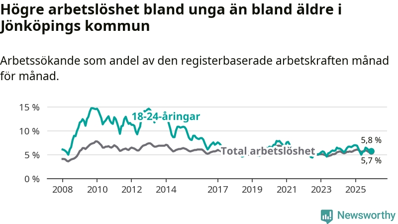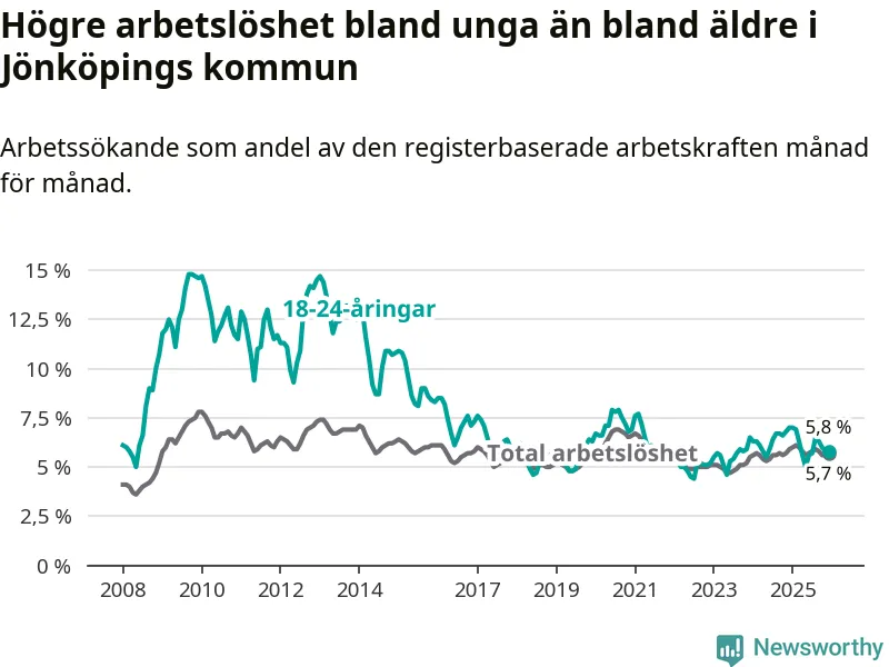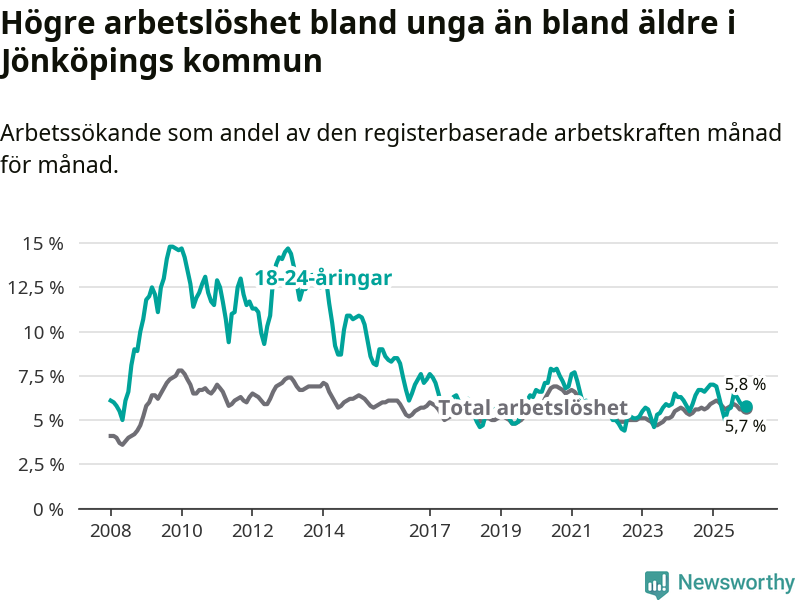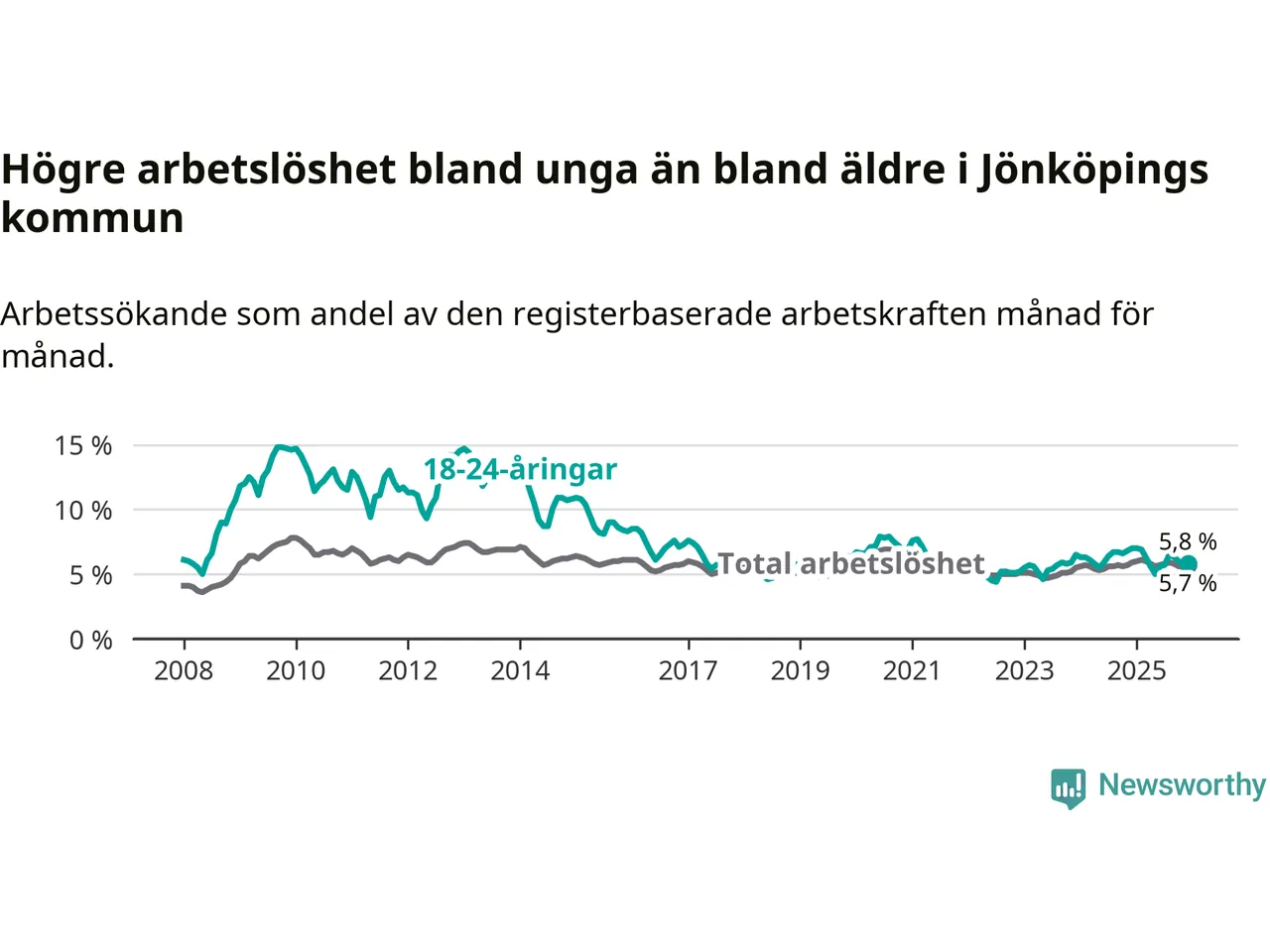 I och med den senaste månadens nedgång har de ungas arbetslöshet i Jönköping sjunkit nio månader i följd (ner från 6,3 procent i mars 2025 till 5,8 procent nu).
