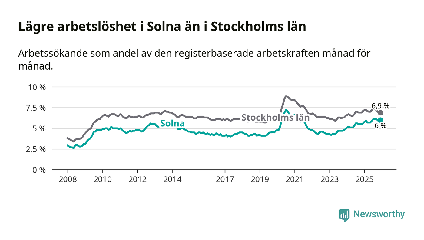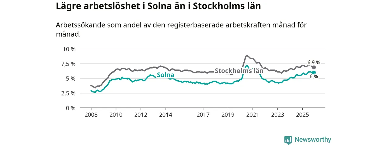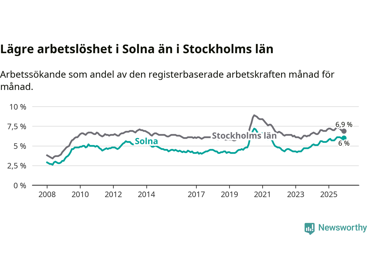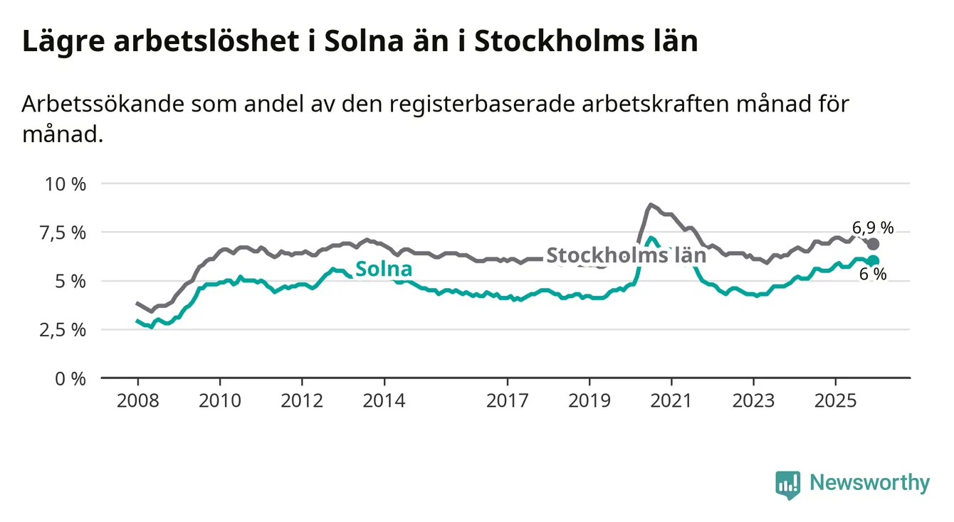 Det är 30:e månaden i följd som arbetslösheten i Solna är högre än den var under samma tidpunkt året innan. Sedan juni 2023 har arbetslösheten gått upp från 4,5 till 6,0 procent.
