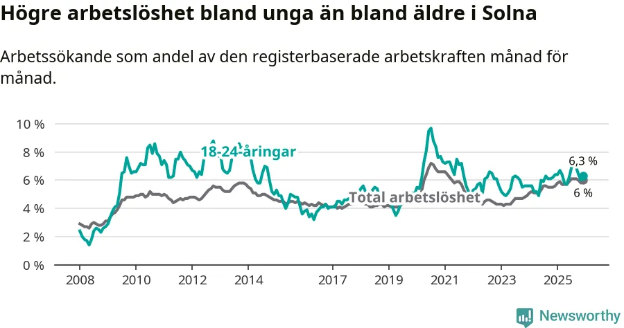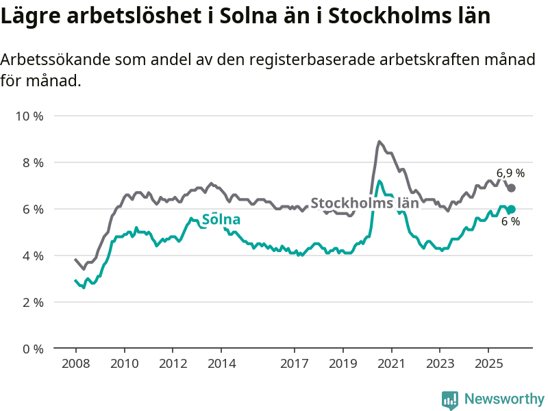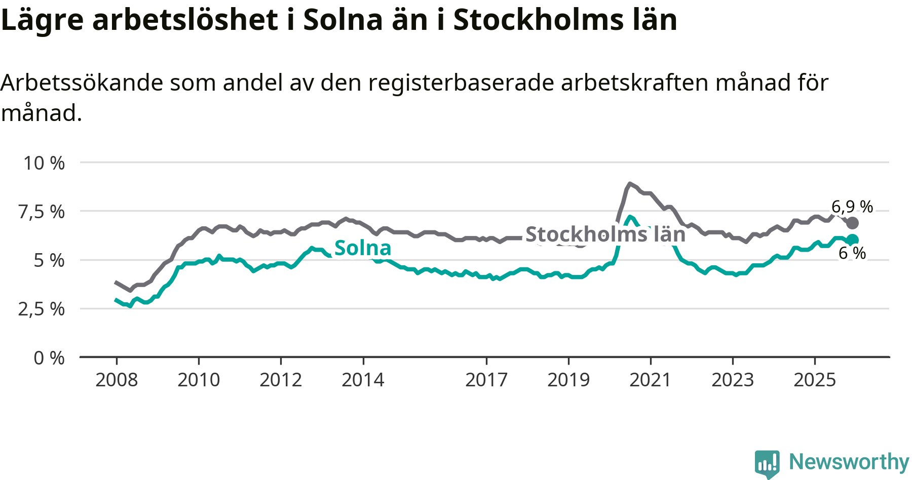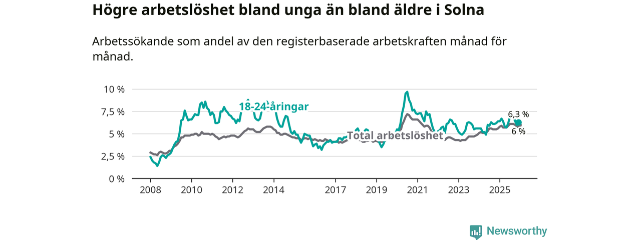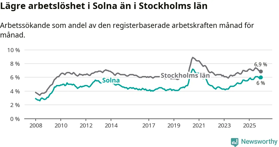Det är 30:e månaden i följd som arbetslösheten i Solna är högre än den var under samma tidpunkt året innan. Sedan juni 2023 har arbetslösheten gått upp från 4,5 till 6,0 procent.