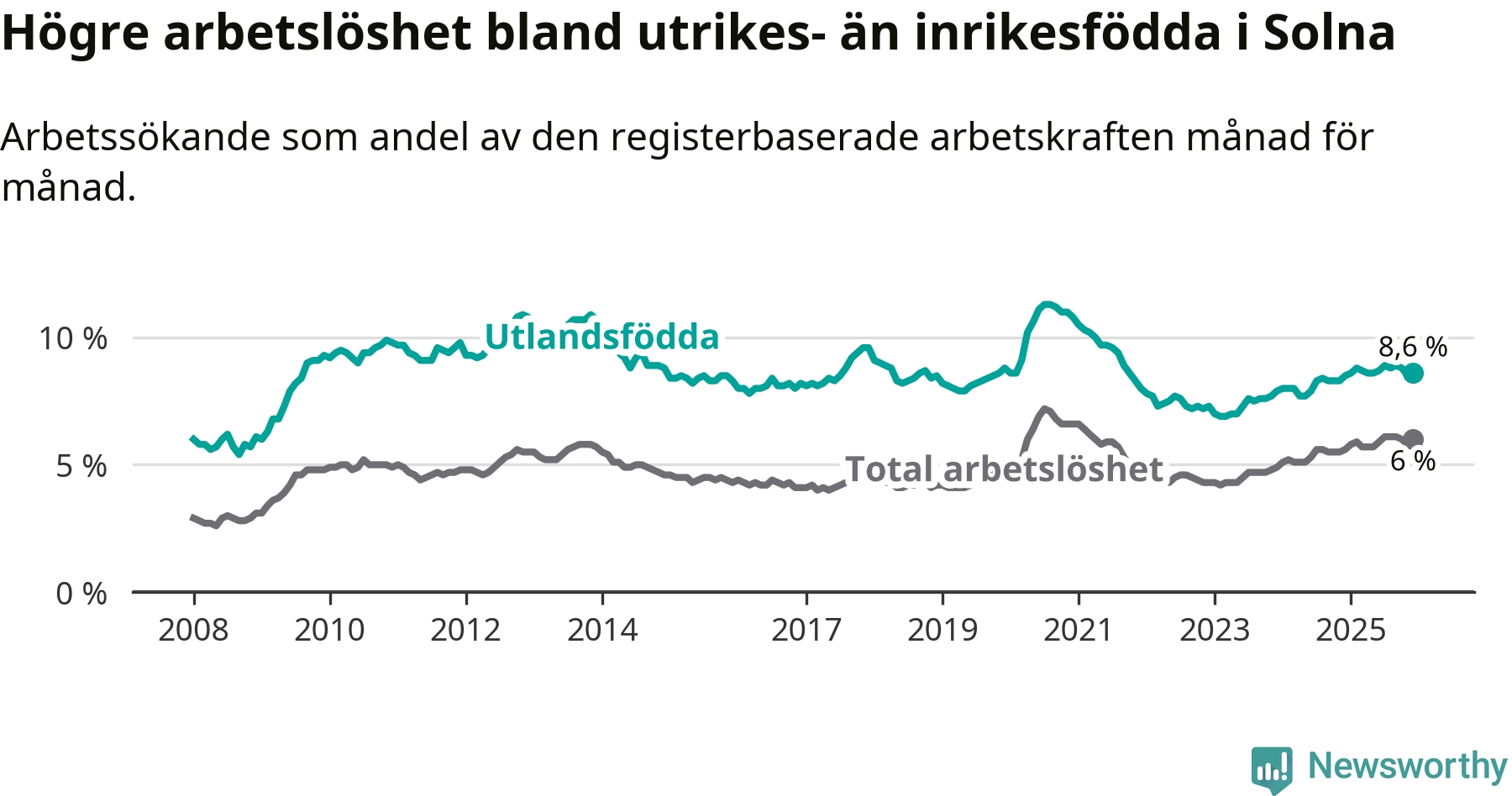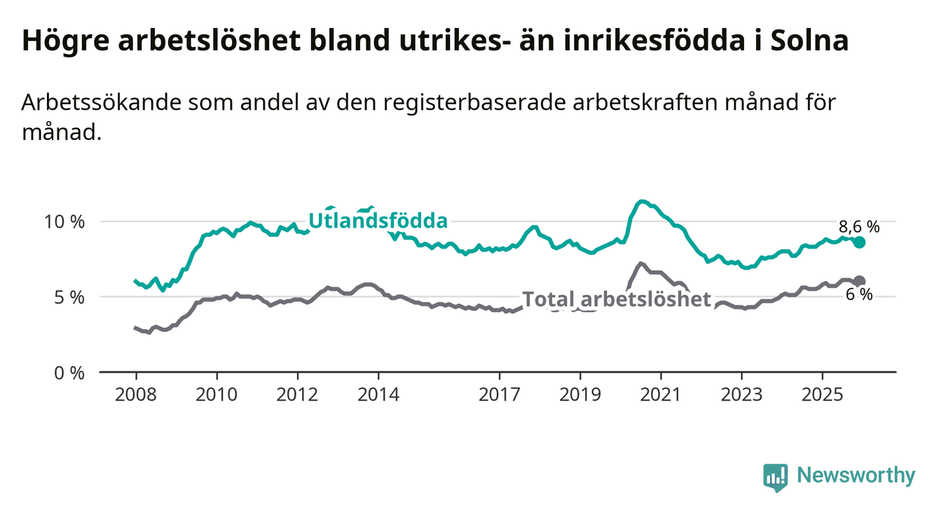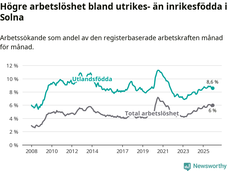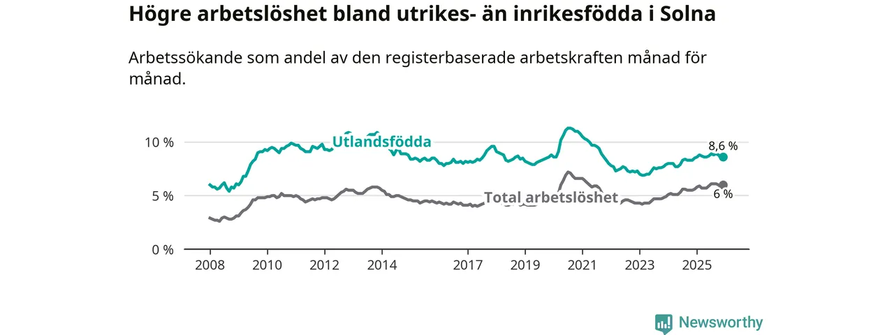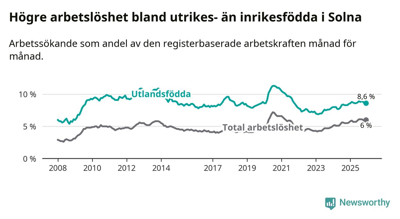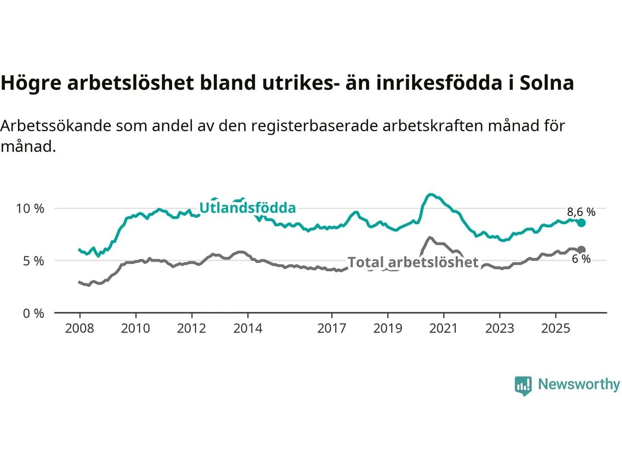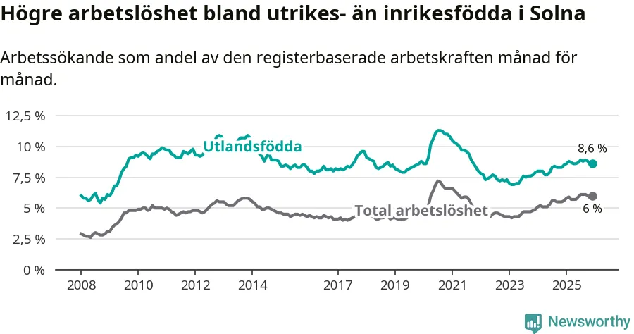 Arbetslösheten bland utlandsfödda var 8,6 procent i Solna under december månad, motsvarande 1 567 av 18 221 personer. Det är 0,1 procentenheter fler än vid samma tidpunkt i fjol (+43 om man räknar personer). Därmed har de utlandsföddas arbetslöshet varit högre än vid samma tidpunkt i fjol i över två år i sträck.