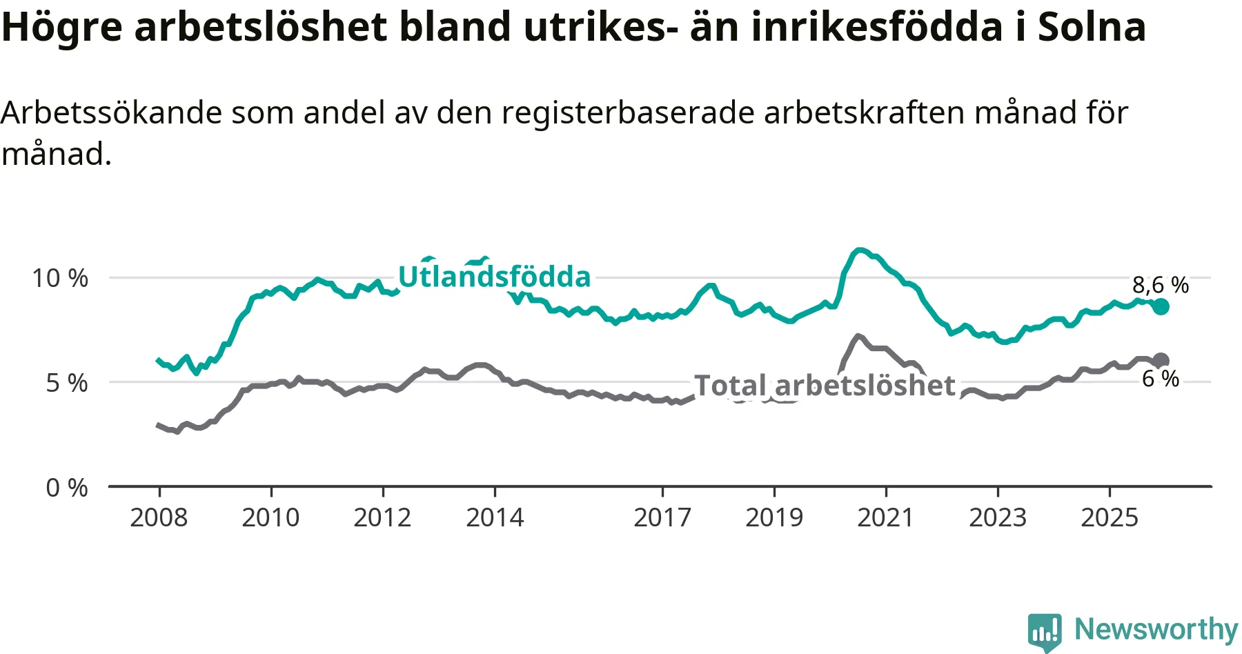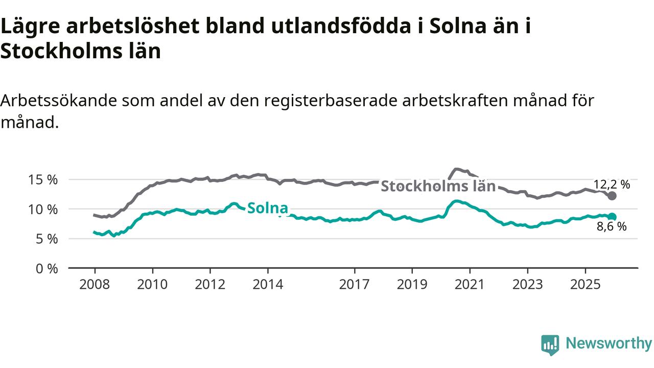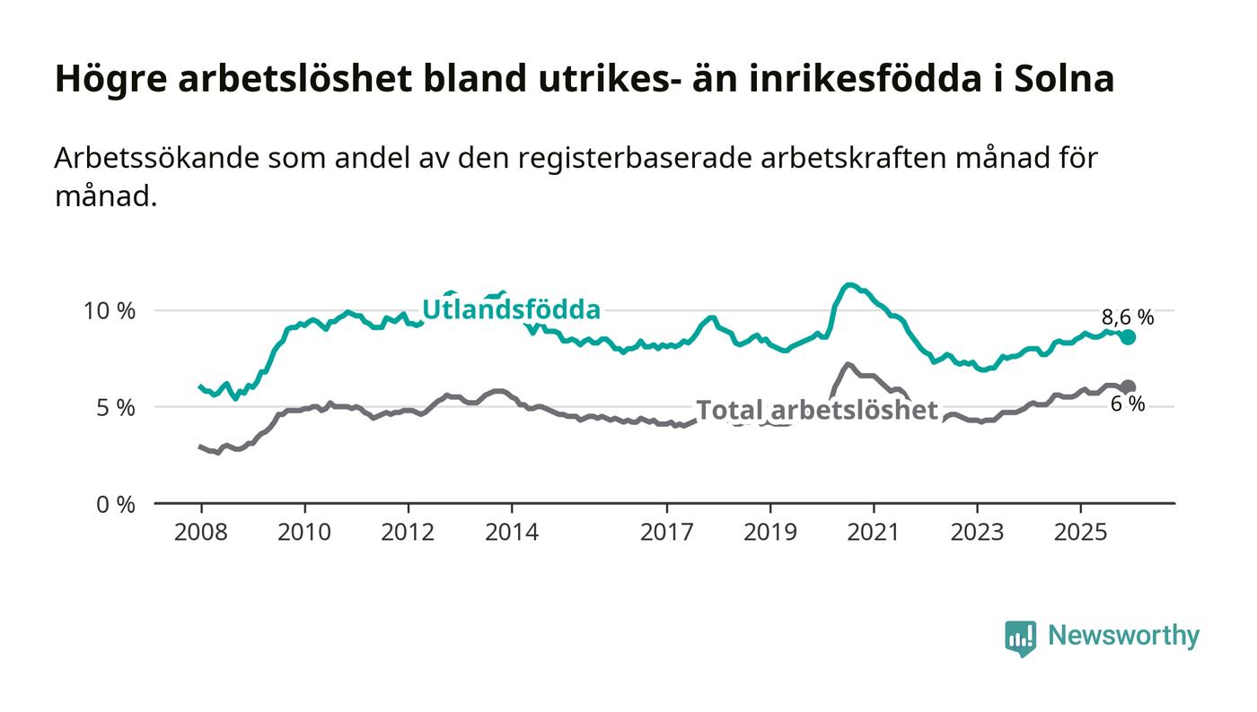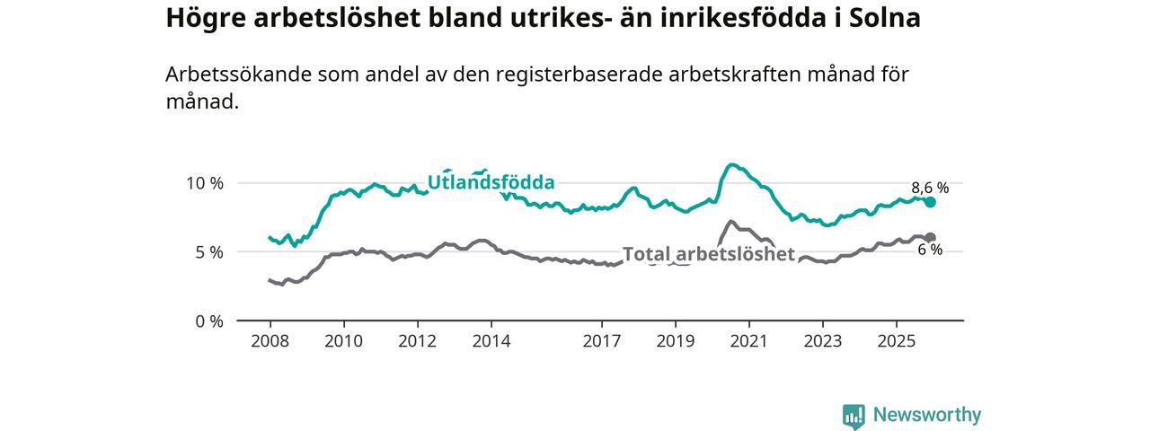Graf: Arbetslöshet bland utrikesfödda i Solna kommun och Stockholms län