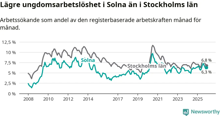 Precis som den totala arbetslösheten ligger ungdomsarbetslösheten i Solna lägre än i Stockholms län som helhet. Skillnaden mellan kommunen och länet är 0,5 procentenheter.