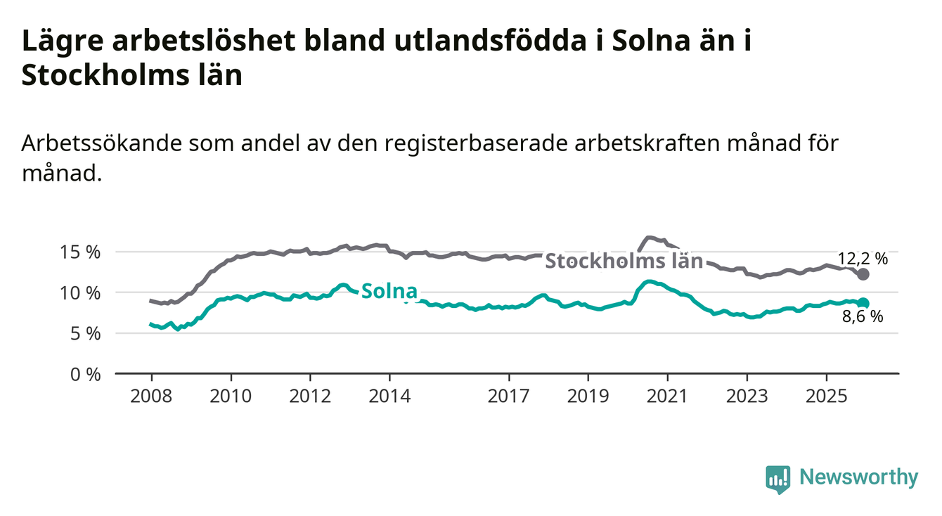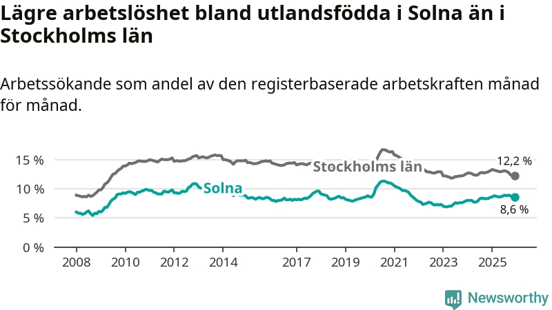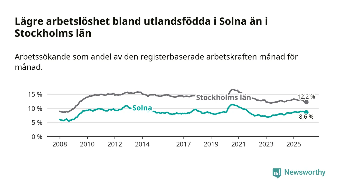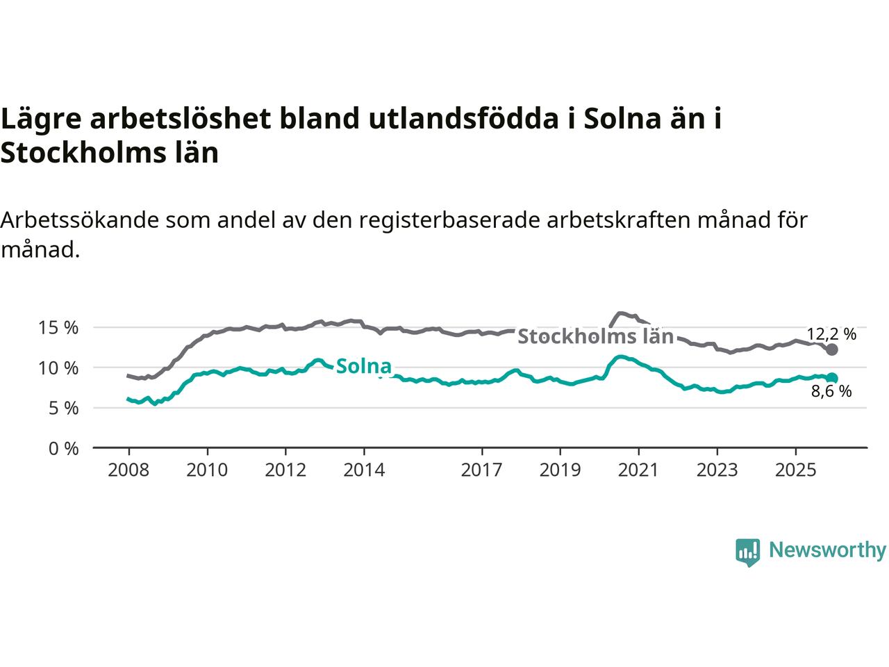 Medan arbetslösheten bland utlandsfödda alltså ökar i Solna så minskar den i Stockholms län. Jämfört med december förra året har andelen arbetslösa utlandsfödda i länet minskat med 0,9 procentenheter (till 12,2 procent). Trots den senaste uppgången har Solna med andra ord fortfarande lägre arbetslöshet bland utlandsfödda än Stockholms län.