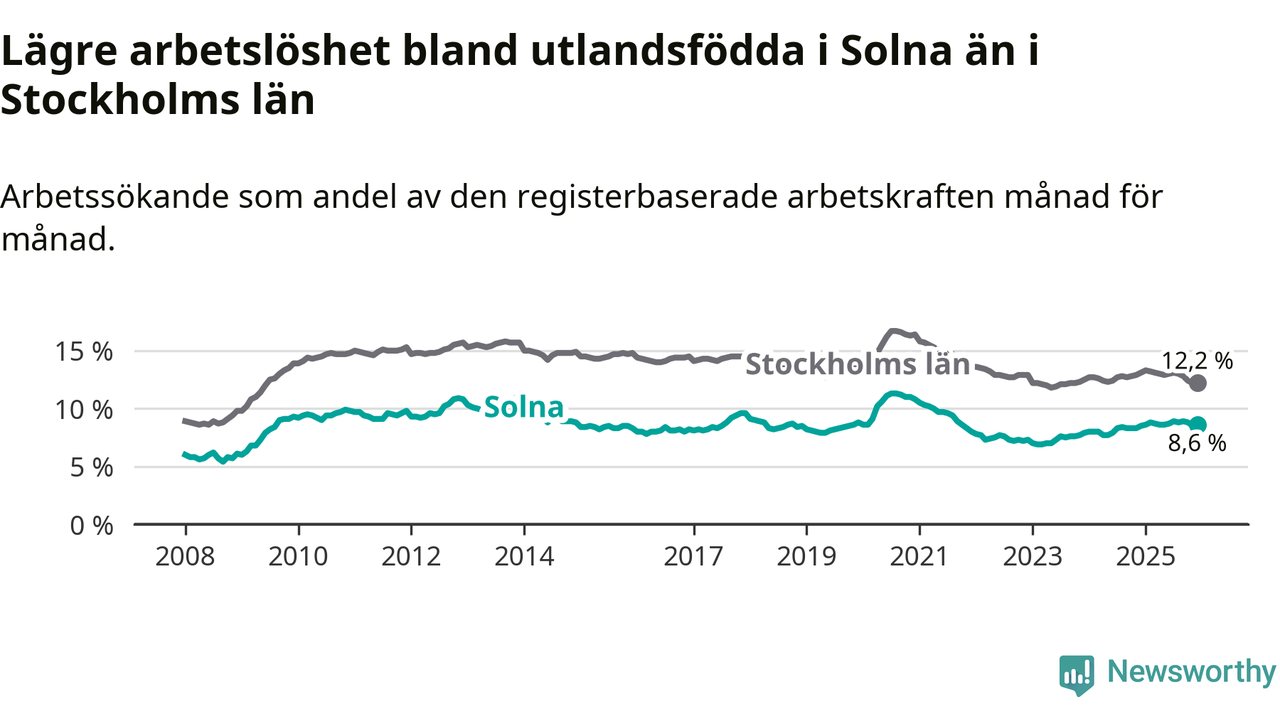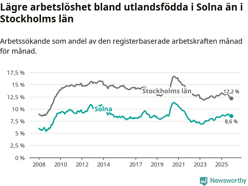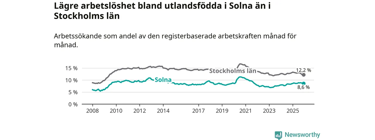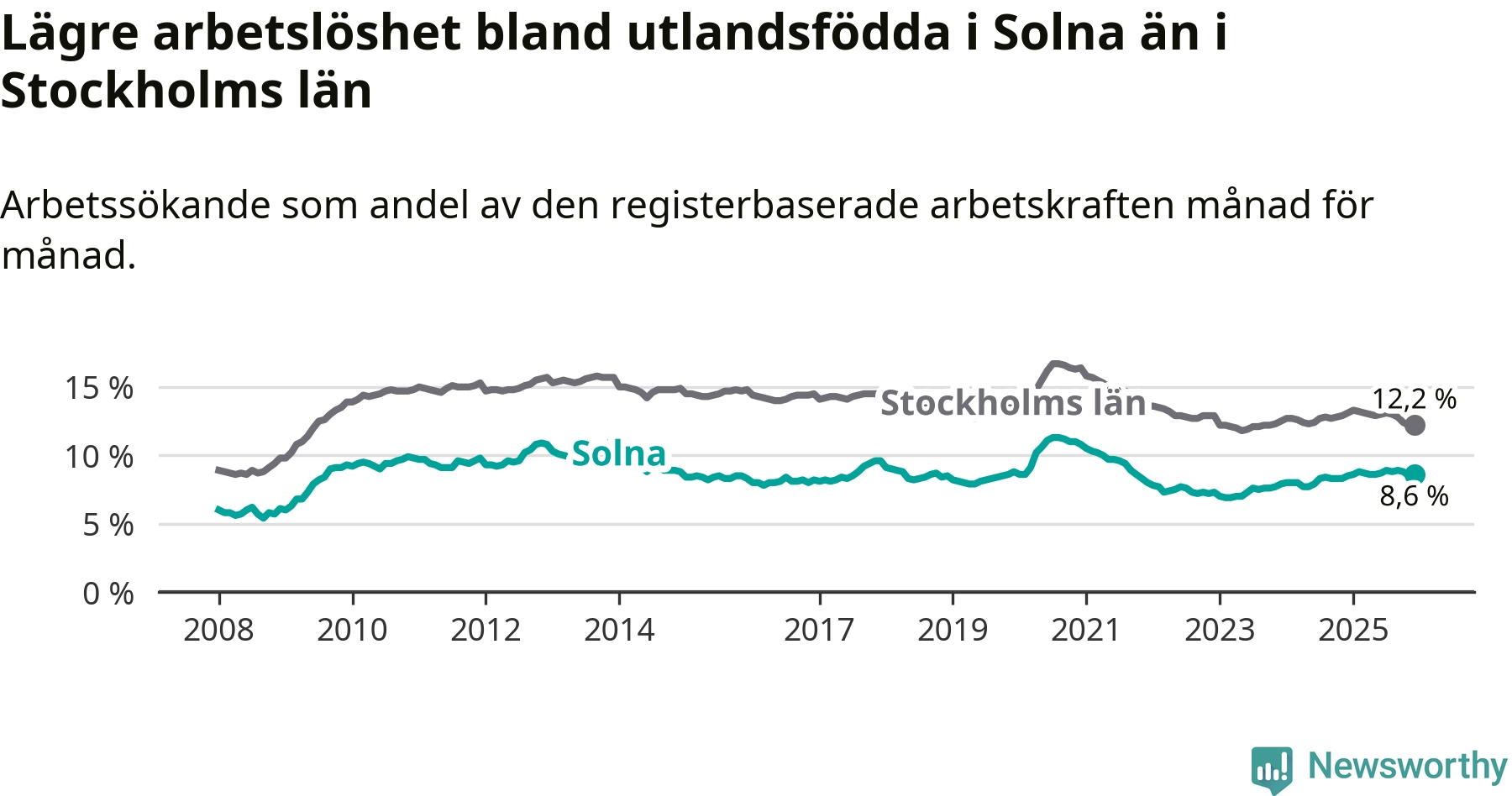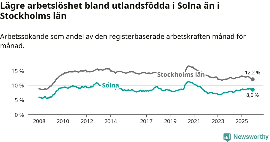Medan arbetslösheten bland utlandsfödda alltså ökar i Solna så minskar den i Stockholms län. Jämfört med december förra året har andelen arbetslösa utlandsfödda i länet minskat med 0,9 procentenheter (till 12,2 procent). Trots den senaste uppgången har Solna med andra ord fortfarande lägre arbetslöshet bland utlandsfödda än Stockholms län.
