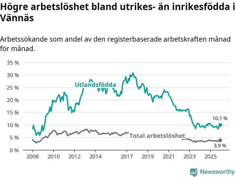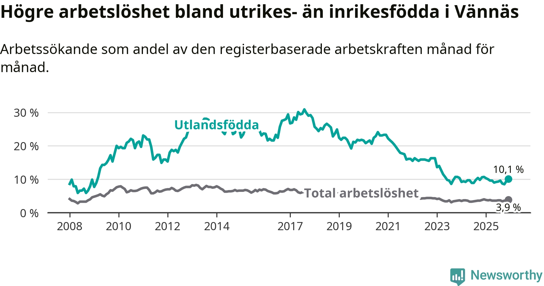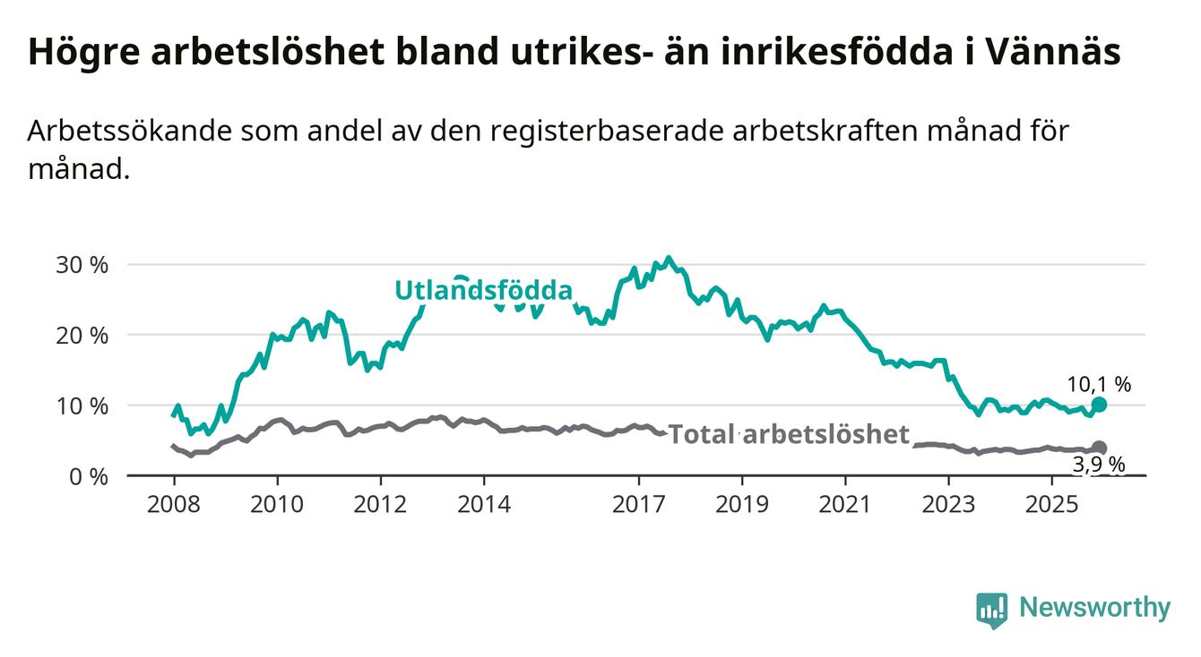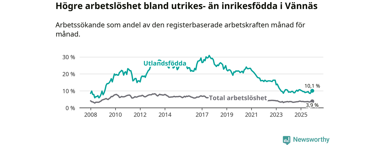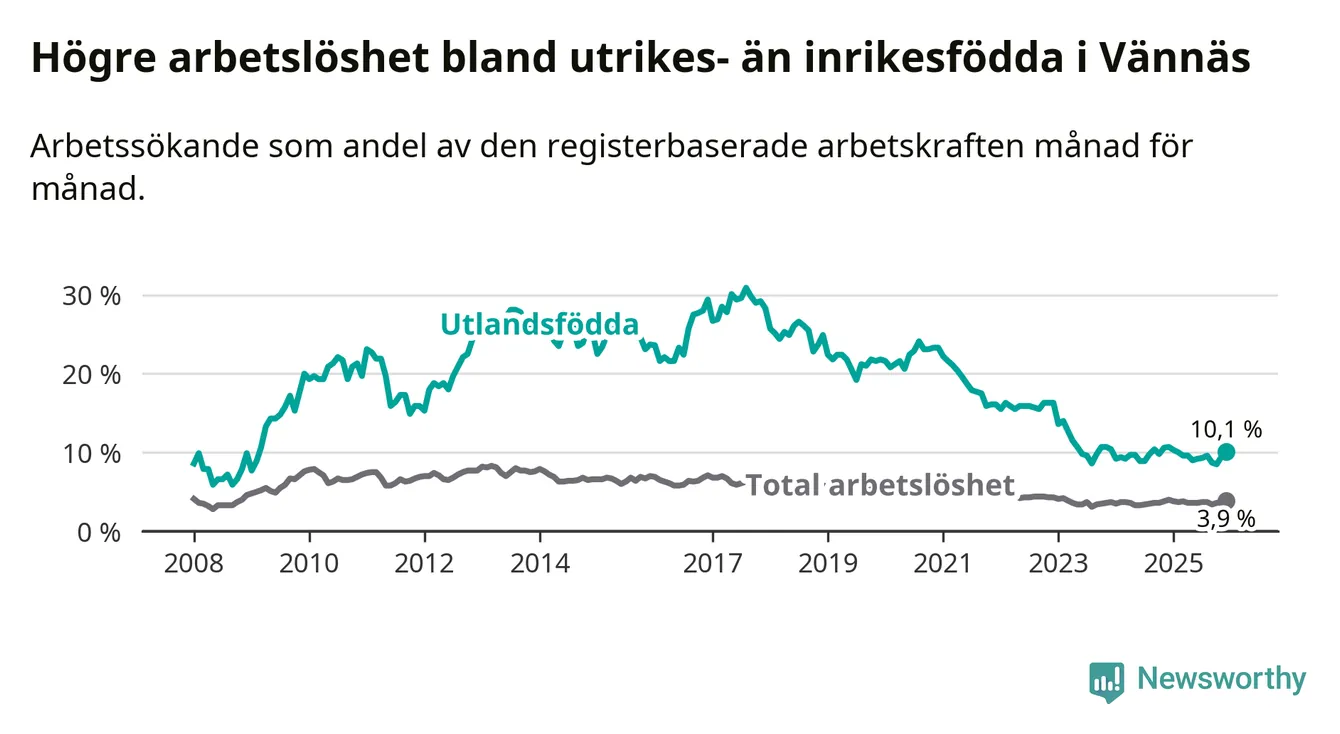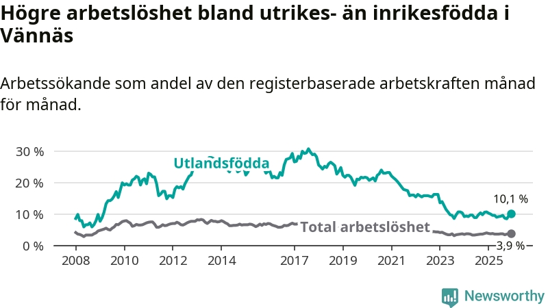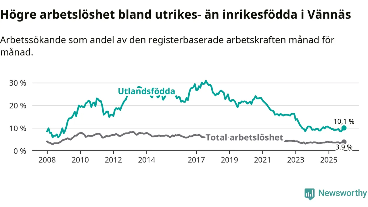 Skillnaden i arbetslöshet mellan utrikesfödda och hela befolkningen är 6,2 procentenheter i Vännäs. Det är en mindre skillnad än för ett år sedan (−0,5 procentenheter).