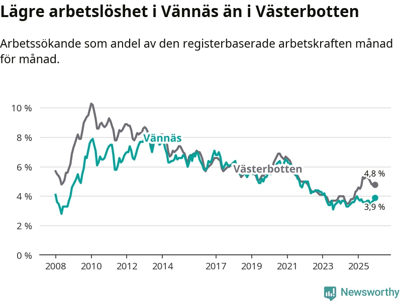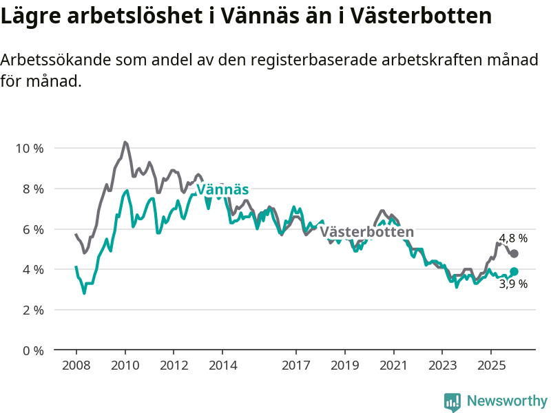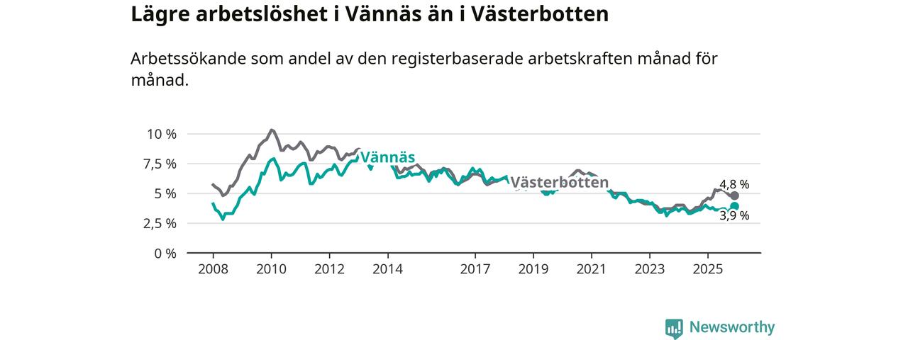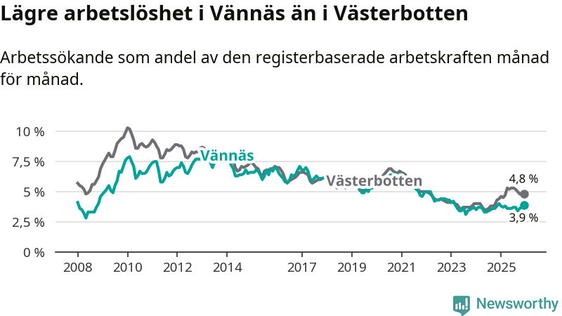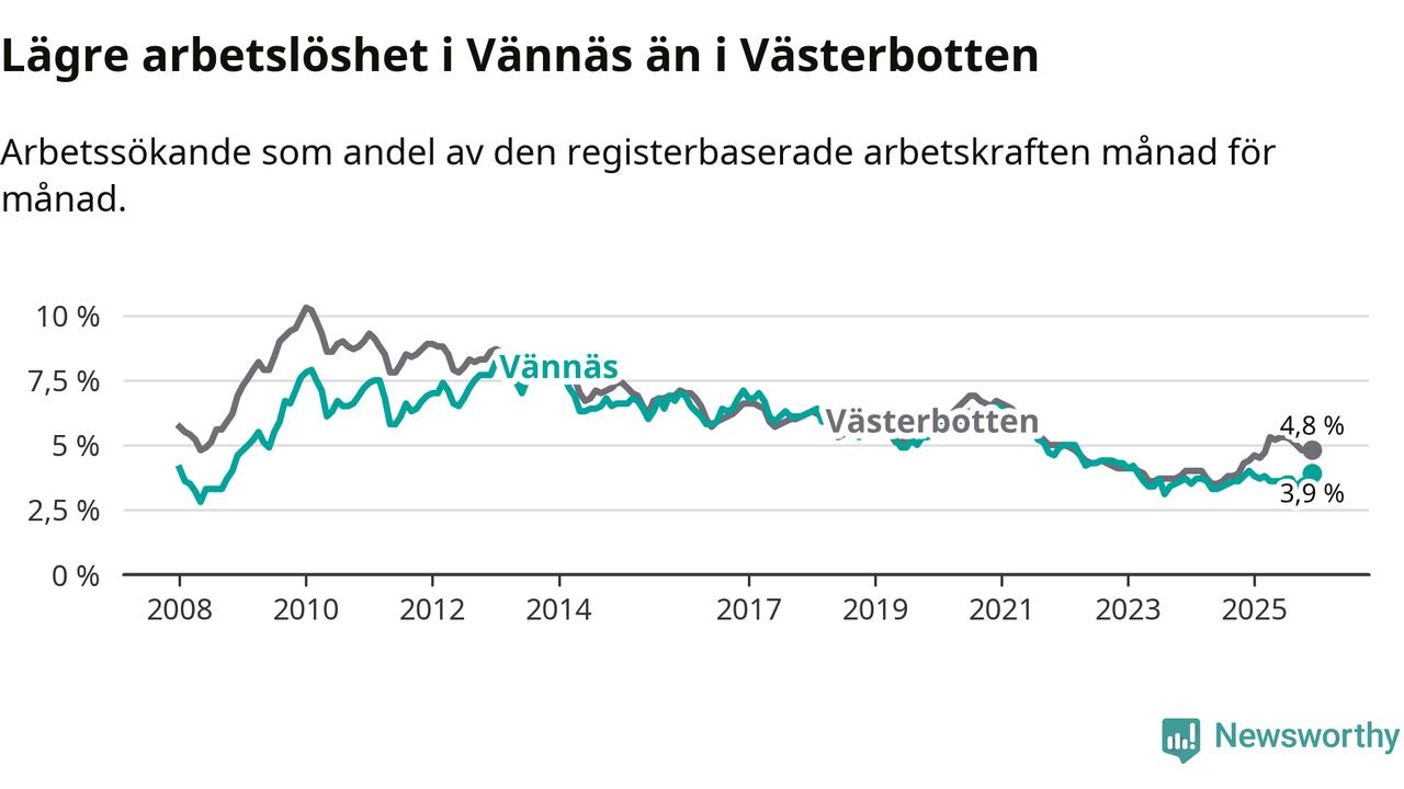 Vännäs hade redan tidigare lägre arbetslöshet än snittet i hela Västerbottens län och nu växer klyftan (3,9 procent i kommunen, jämfört med 4,8 procent i hela länet). Sorsele har den lägsta arbetslösheten i länet (2,6 procent), medan Skellefteå har den högsta (6,2 procent). För att Vännäs skulle komma ner i samma arbetslöshetsnivå som Sorsele skulle 59 personer behöva sysselsättas.