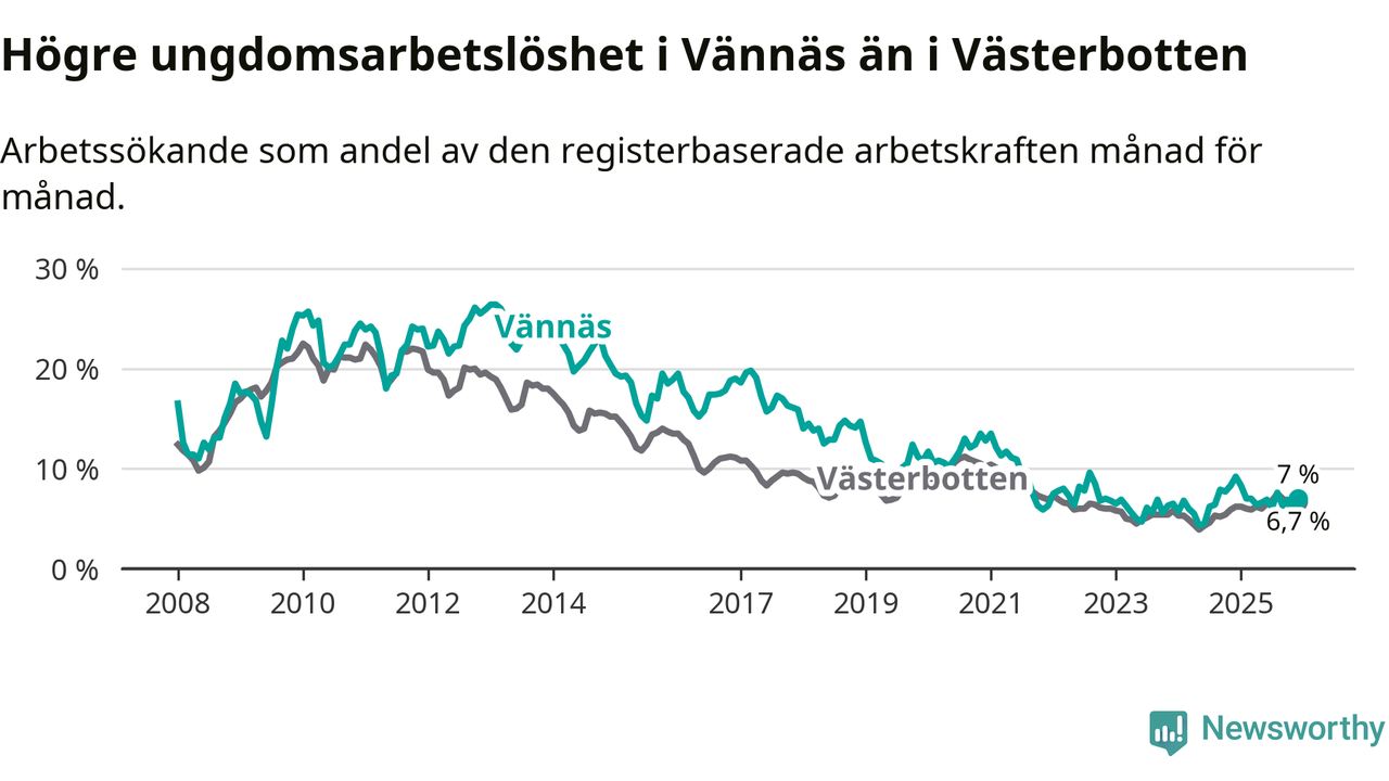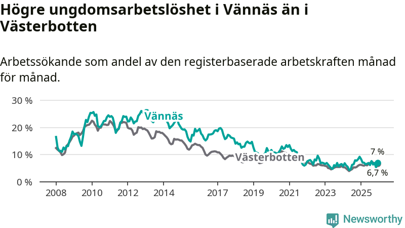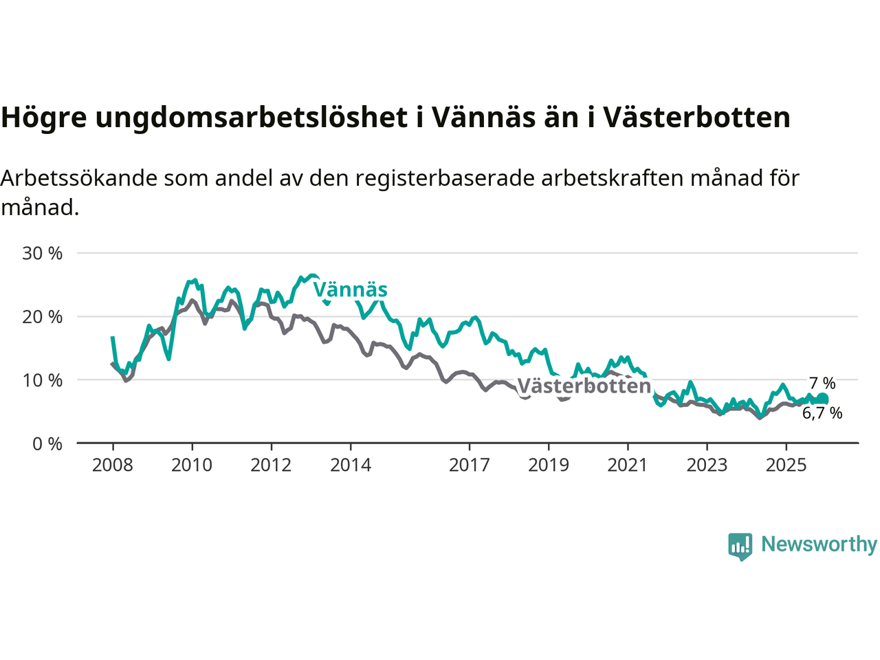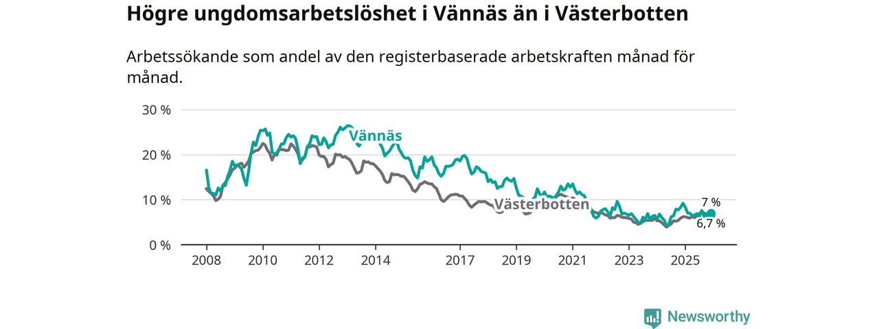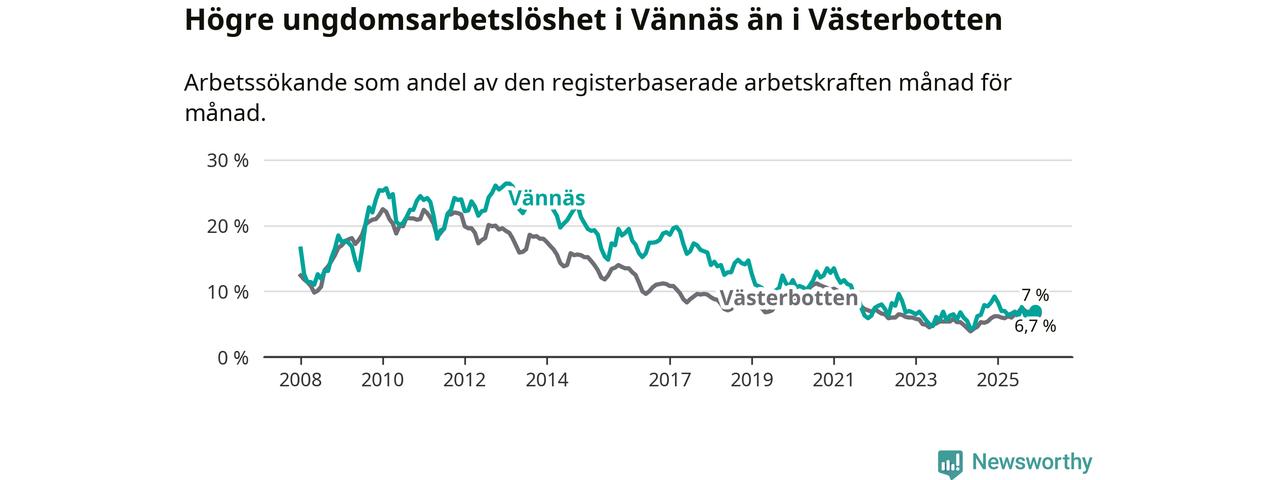 Medan Vännäs har lägre total arbetslöshet än Västerbotten, ligger ungdomsarbetslösheten 0,3 procentenheter högre i Vännäs.