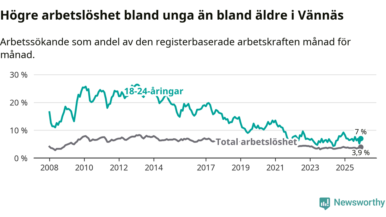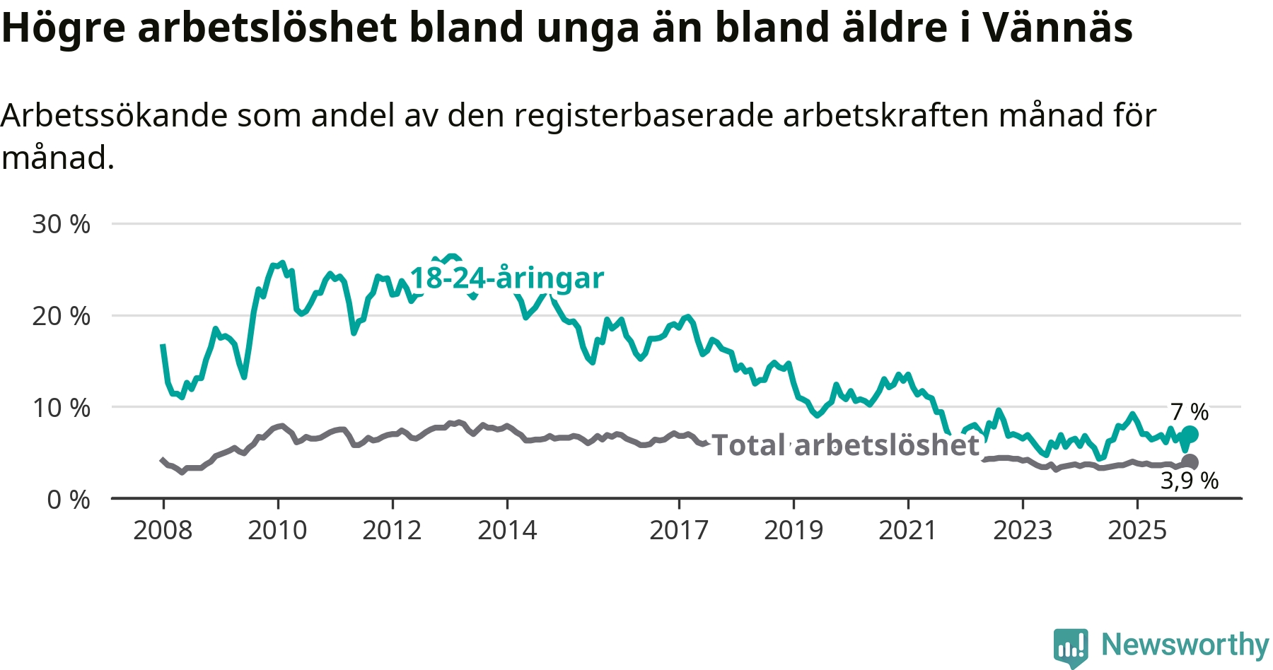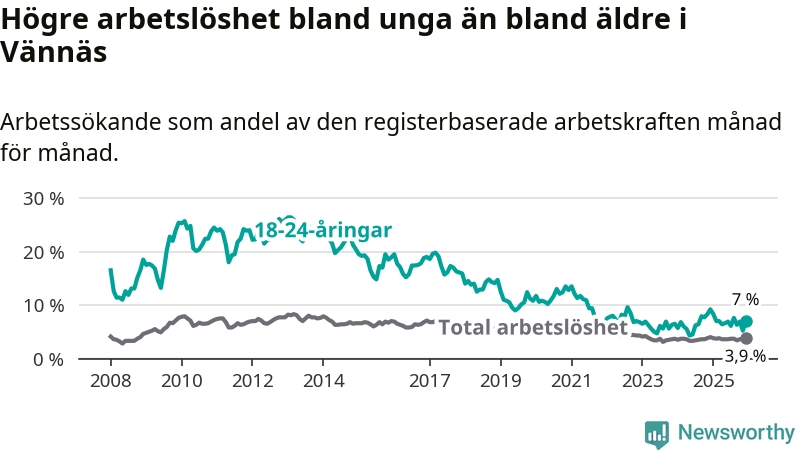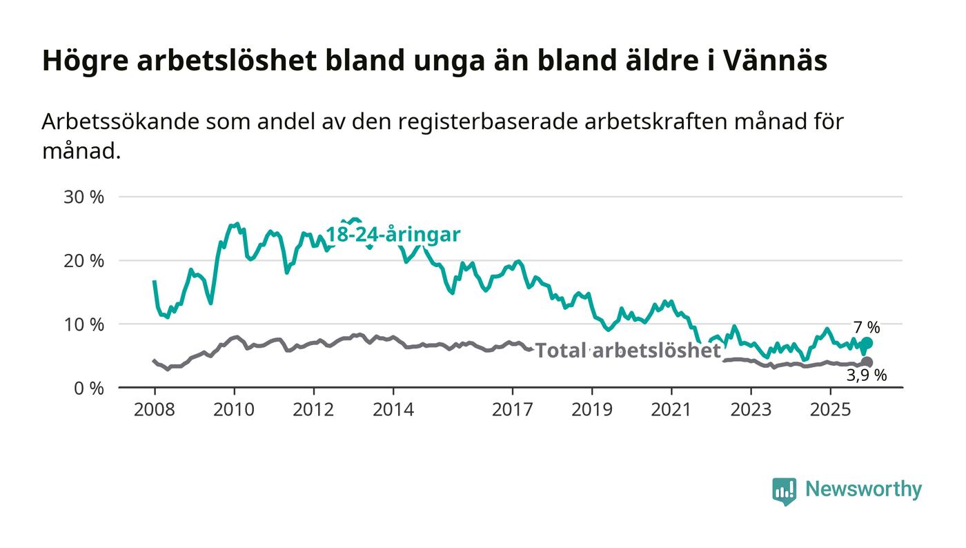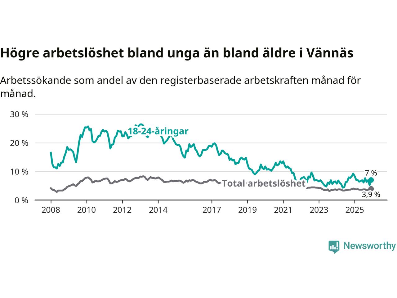 Medan Vännäs har lägre total arbetslöshet än Västerbotten, ligger ungdomsarbetslösheten 0,3 procentenheter högre i Vännäs.