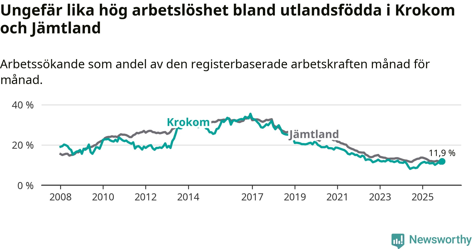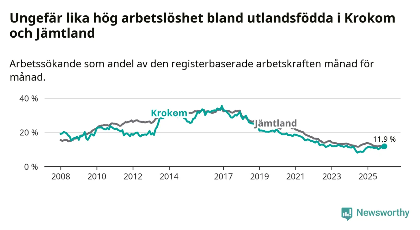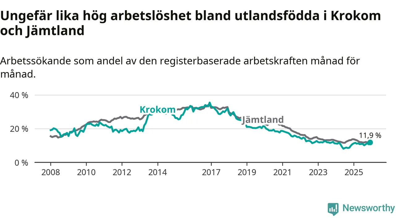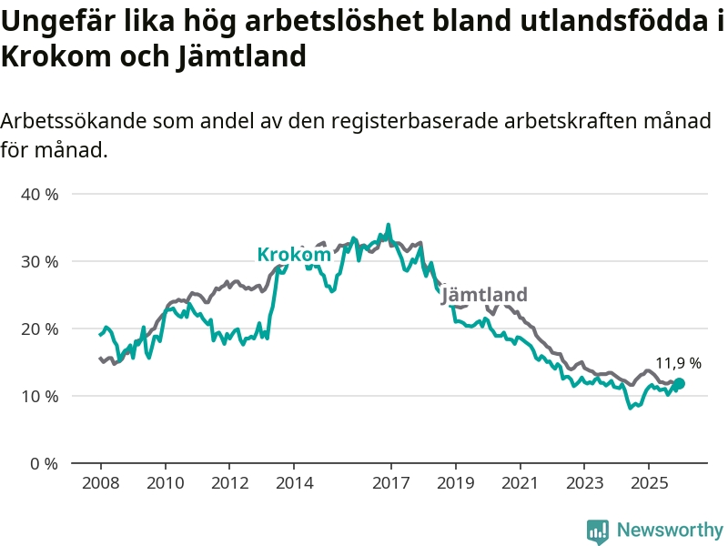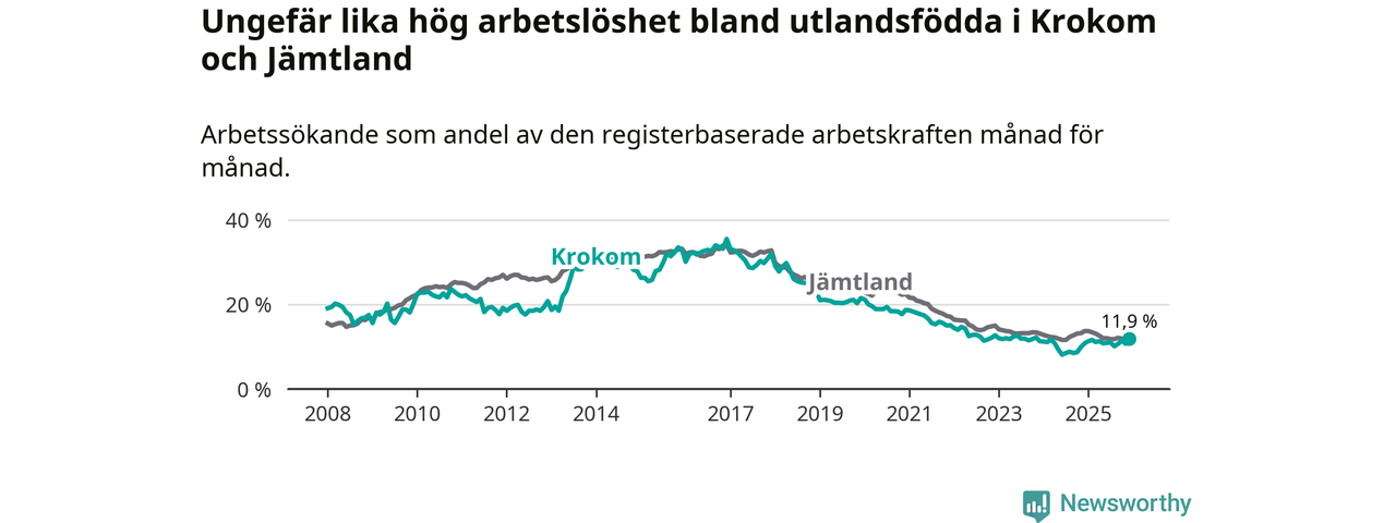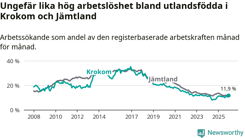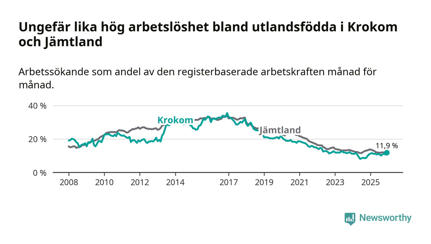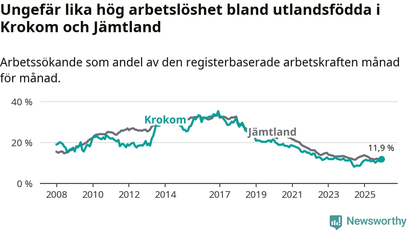 Medan arbetslösheten bland utlandsfödda alltså ökar i Krokom så minskar den i Jämtland. Jämfört med december förra året har andelen arbetslösa utlandsfödda i länet minskat med 1,8 procentenheter (till 11,9 procent).