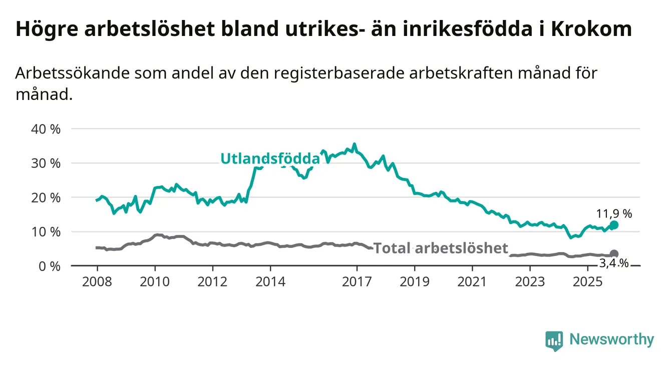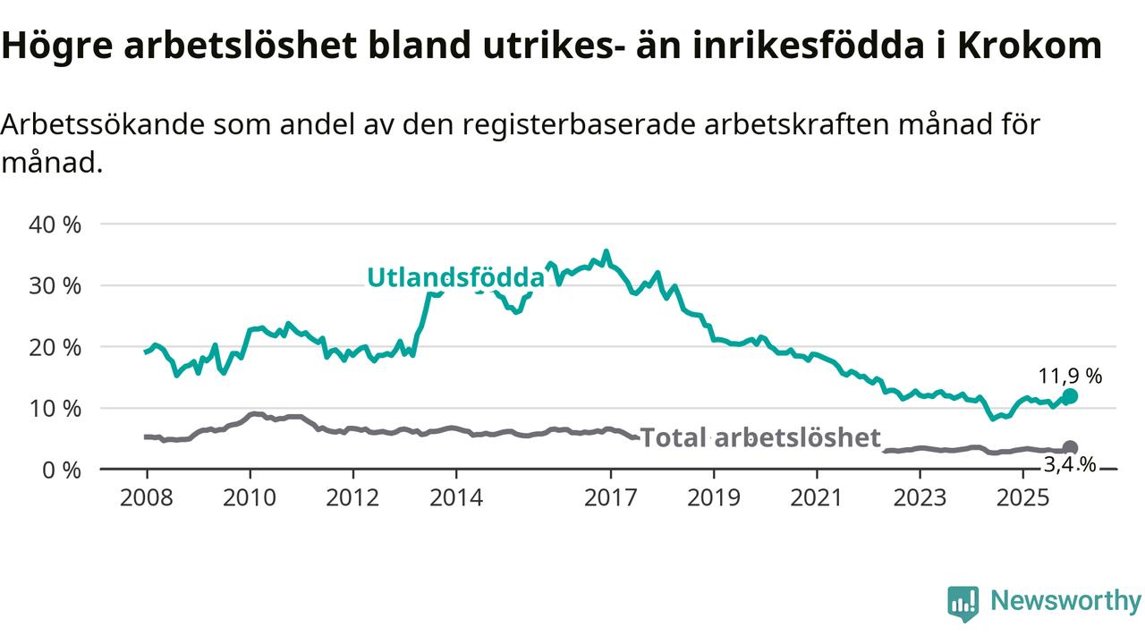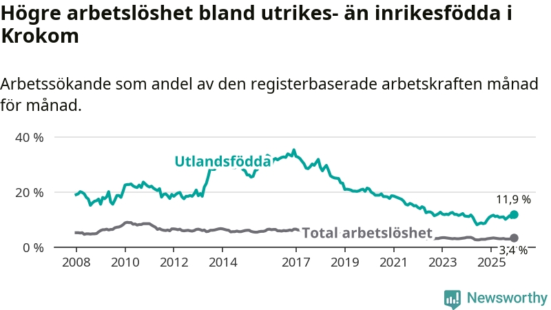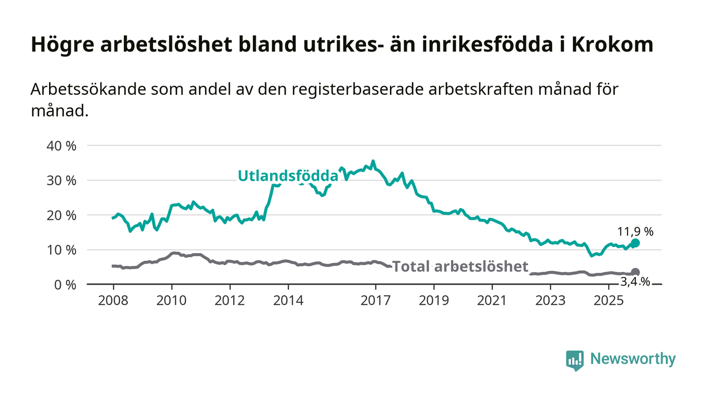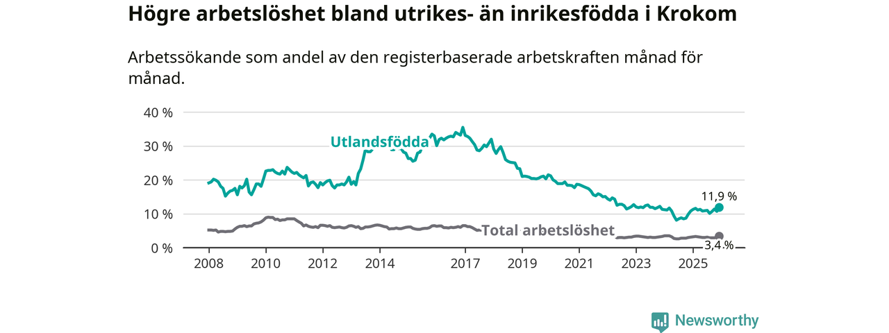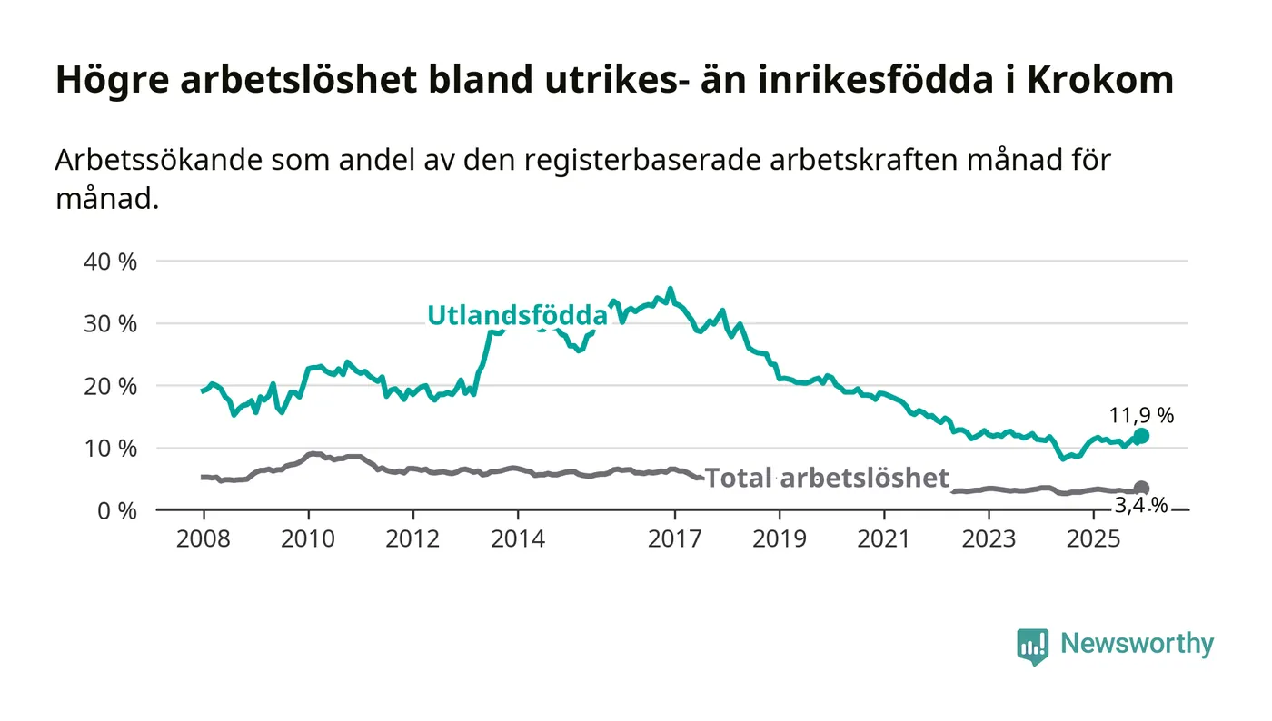 Skillnaden i arbetslöshet mellan utrikesfödda och hela befolkningen är 8,5 procentenheter i Krokom. Det är en större skillnad än för ett år sedan (+0,8 procentenheter).