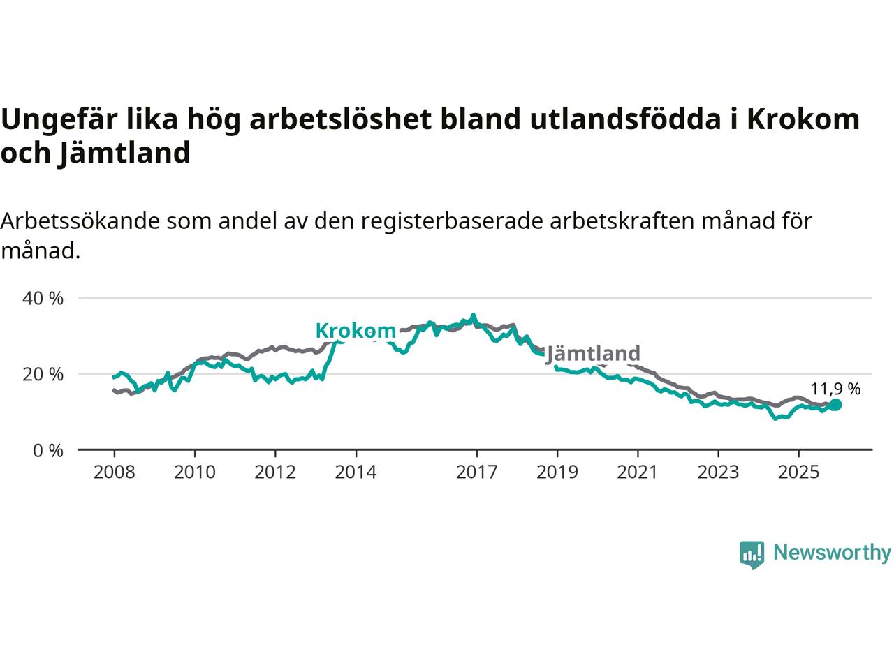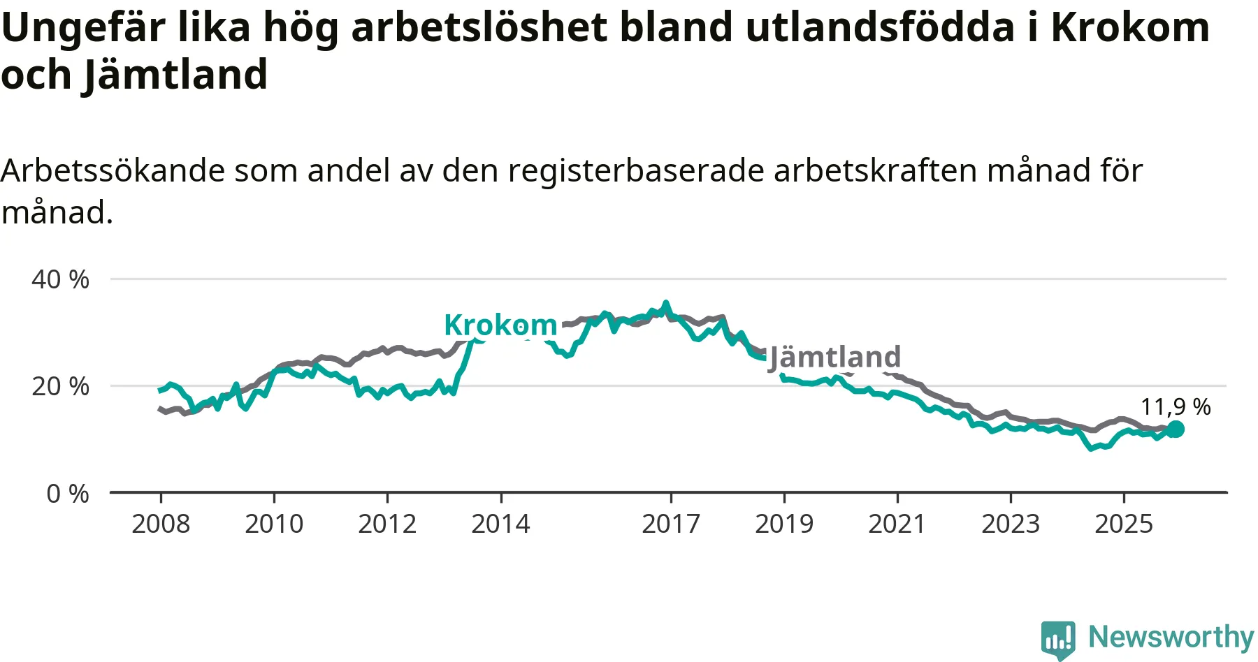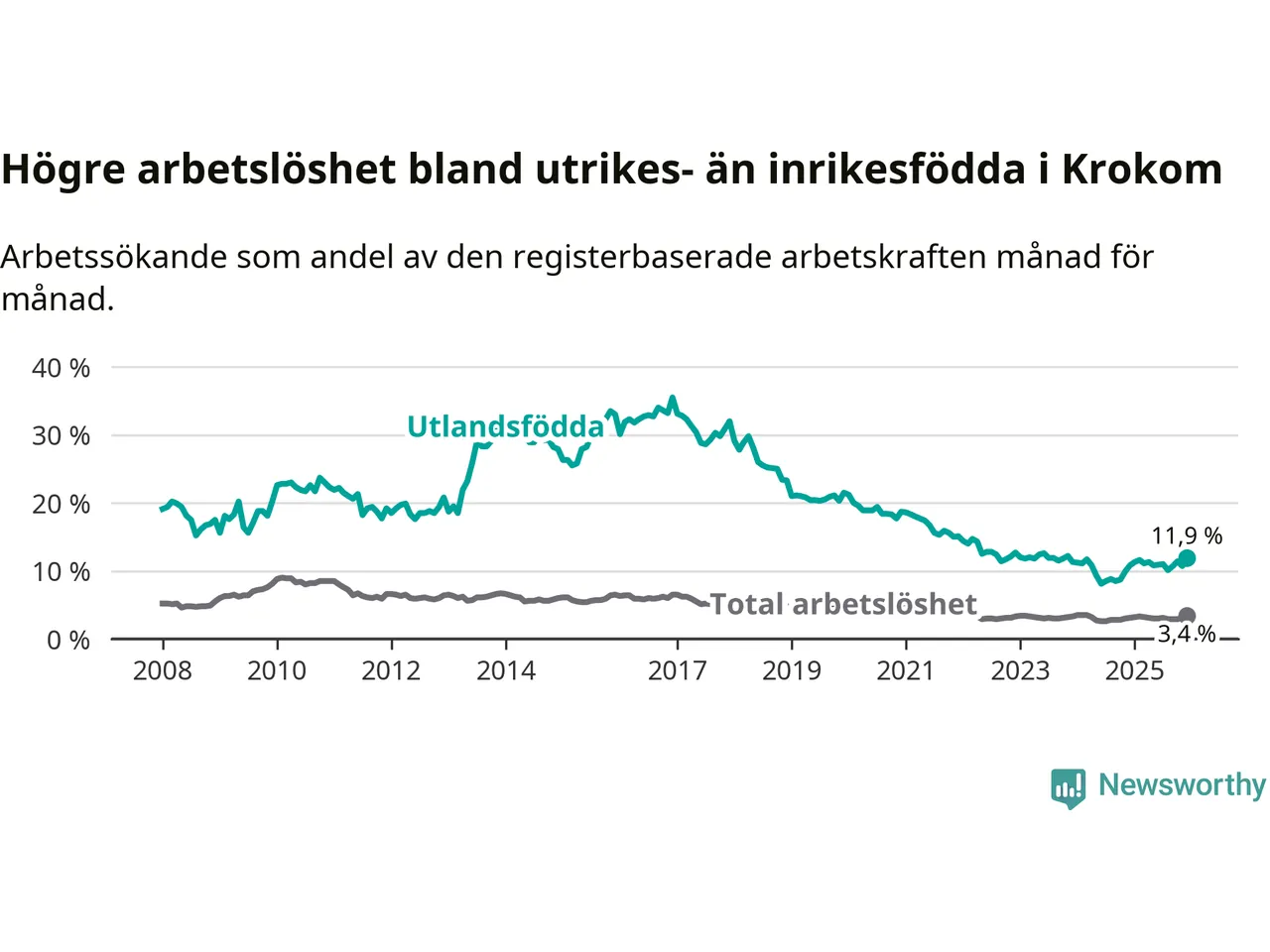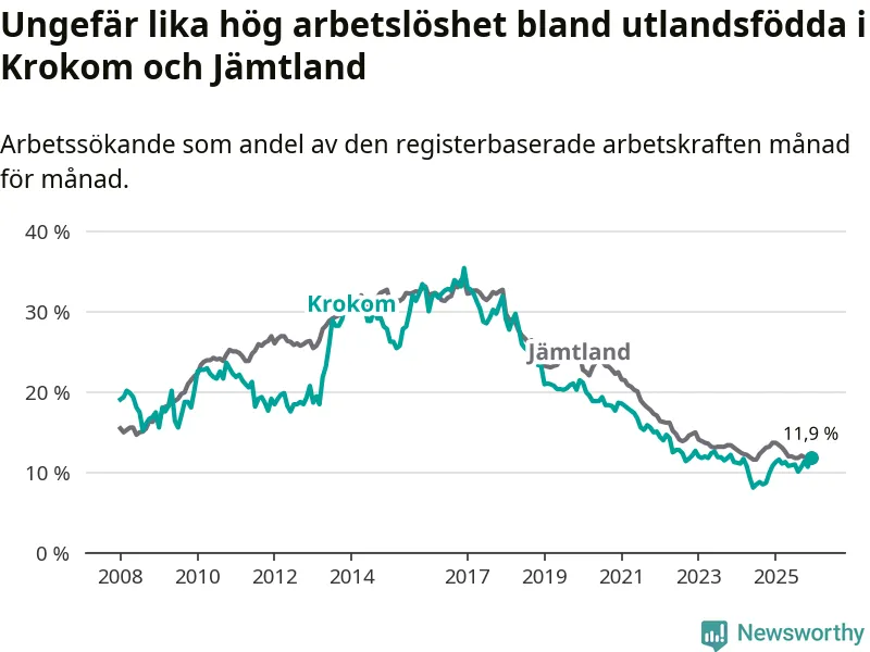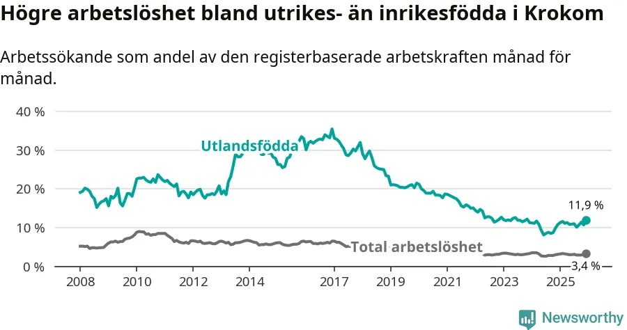 Skillnaden i arbetslöshet mellan utrikesfödda och hela befolkningen är 8,5 procentenheter i Krokom. Det är en större skillnad än för ett år sedan (+0,8 procentenheter).