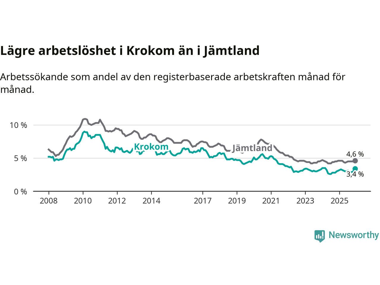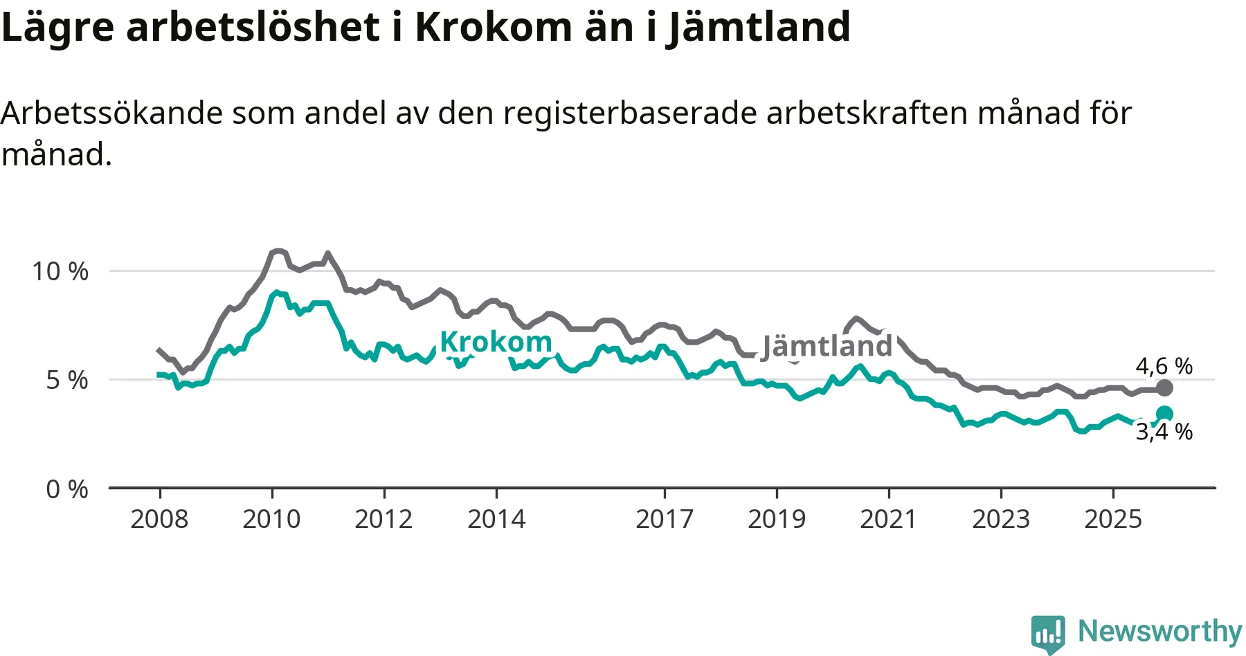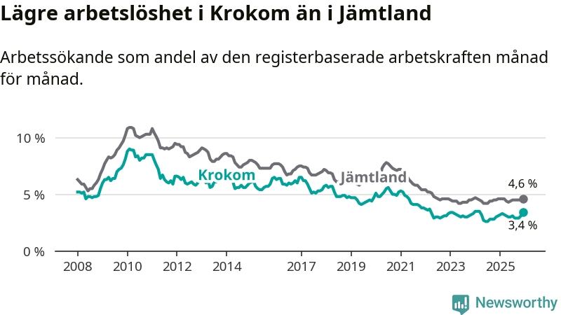 Krokom går därmed mot strömmen i förhållande till andra kommuner i Jämtlands län. I de flesta andra kommuner i länet går arbetslösheten nedåt. Störst är minskningen i Strömsund, där arbetslösheten sjunker med 0,7 procentenheter. I tabellen längre ner ser du utvecklingen i samtliga kommuner i länet.