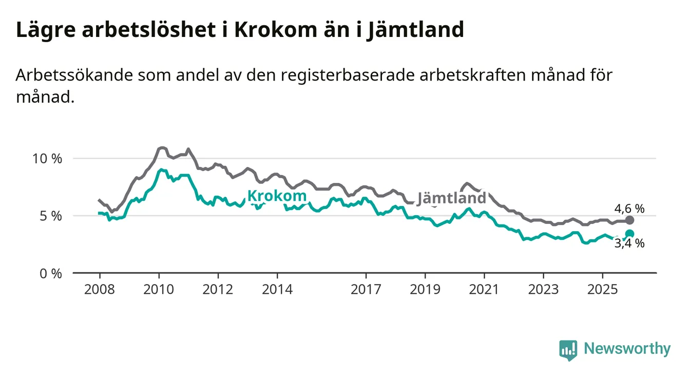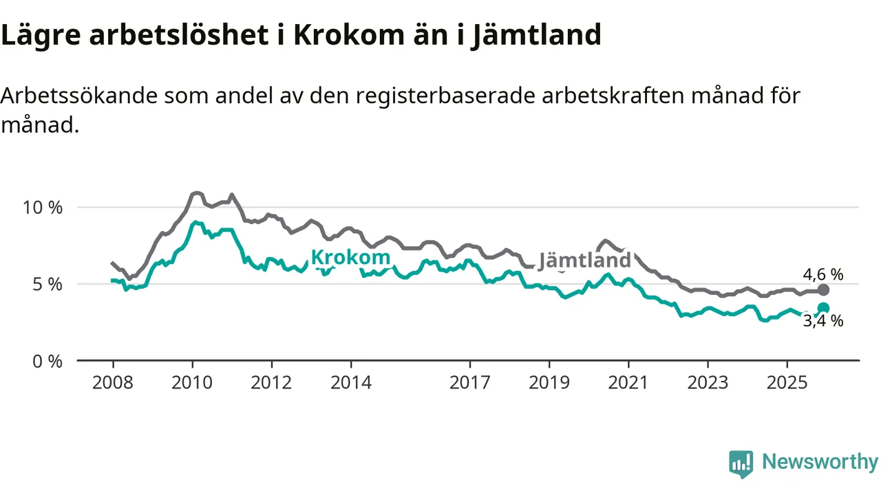 Även om arbetslösheten i Krokom alltså ökar, så ligger den fortfarande under snittet i hela Jämtlands län (3,4 procent i kommunen, jämfört med 4,6 procent i hela länet). Åre har den lägsta arbetslösheten i länet (3,3 procent), medan Strömsund har den högsta (6,4 procent).