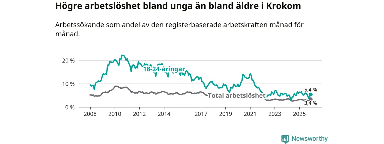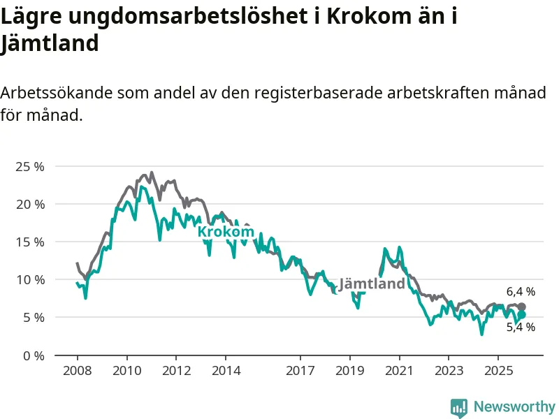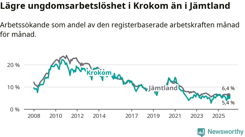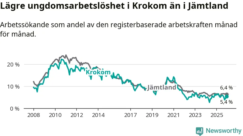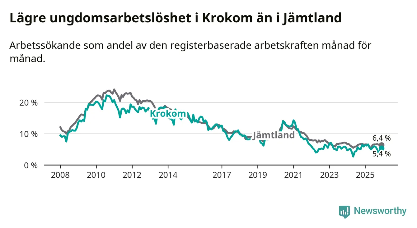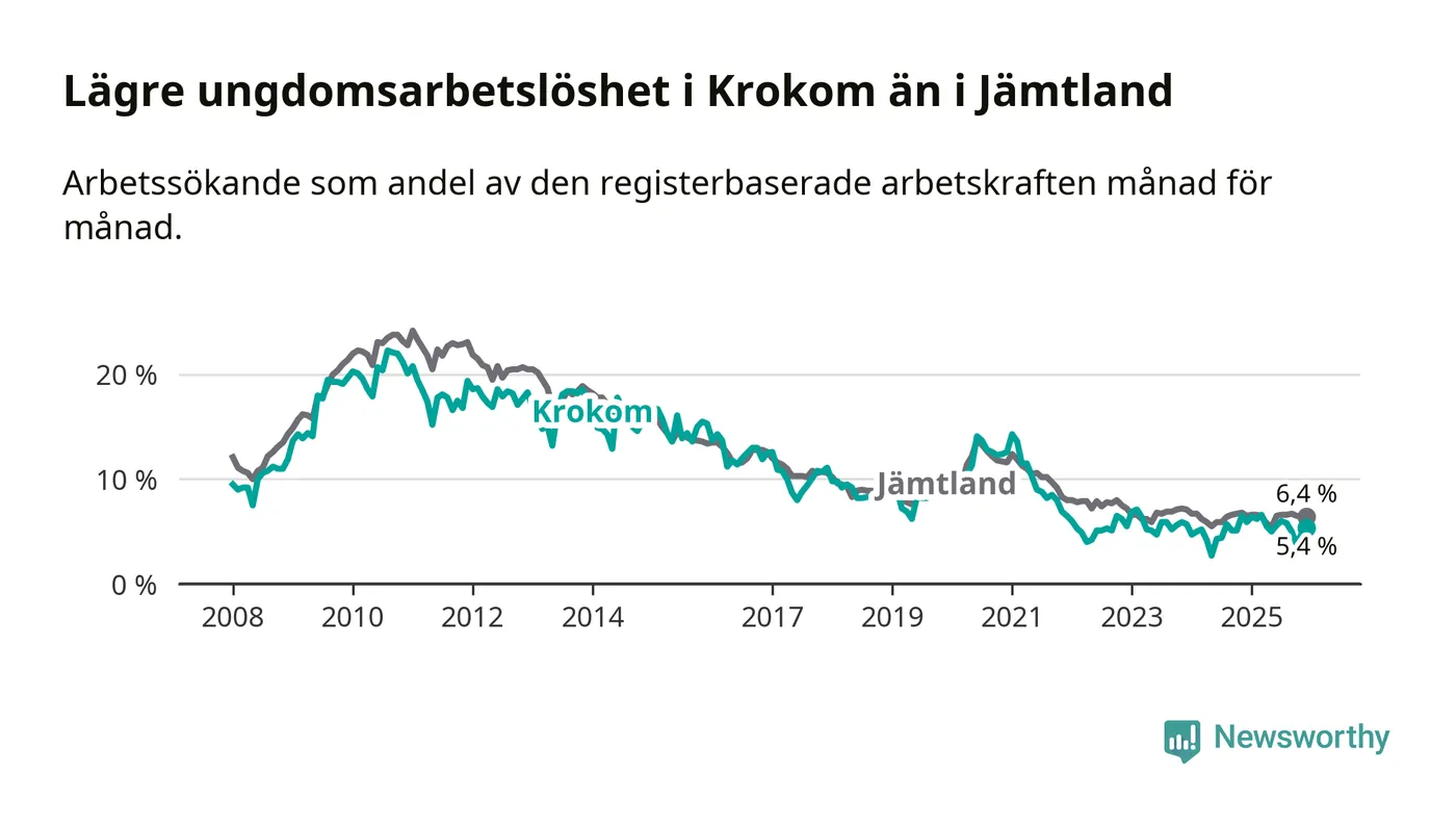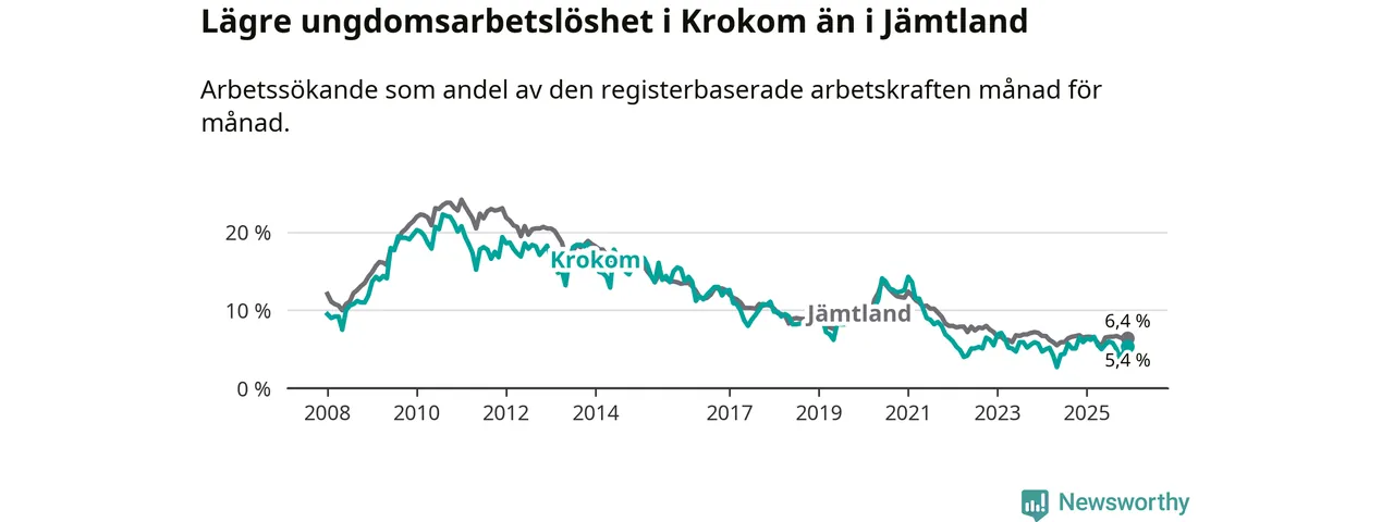 Precis som den totala arbetslösheten ligger ungdomsarbetslösheten i Krokom lägre än i Jämtland som helhet. Skillnaden mellan kommunen och länet är 1,0 procentenheter.