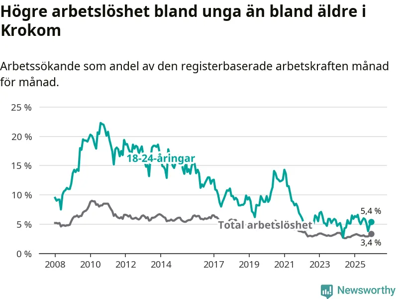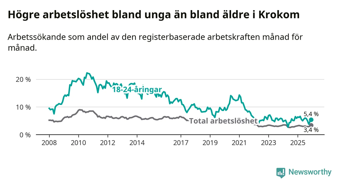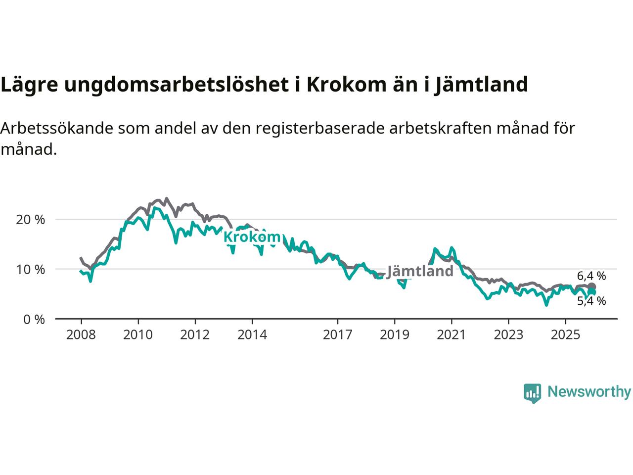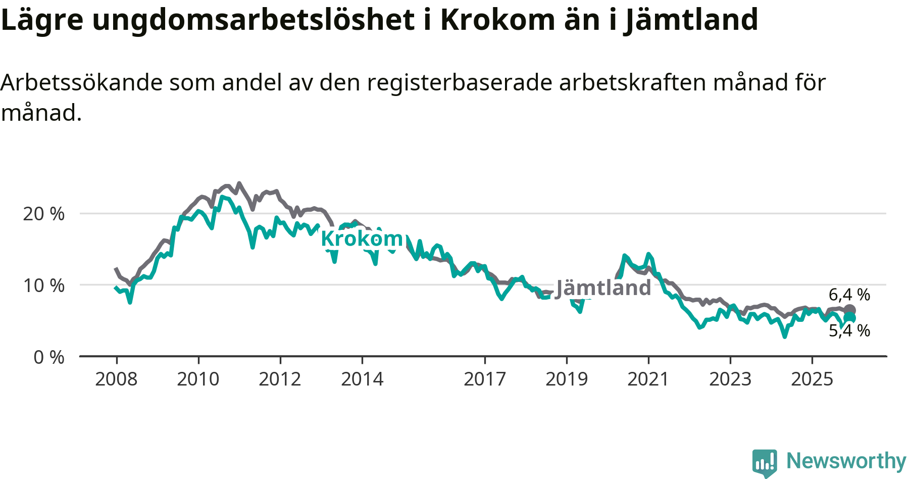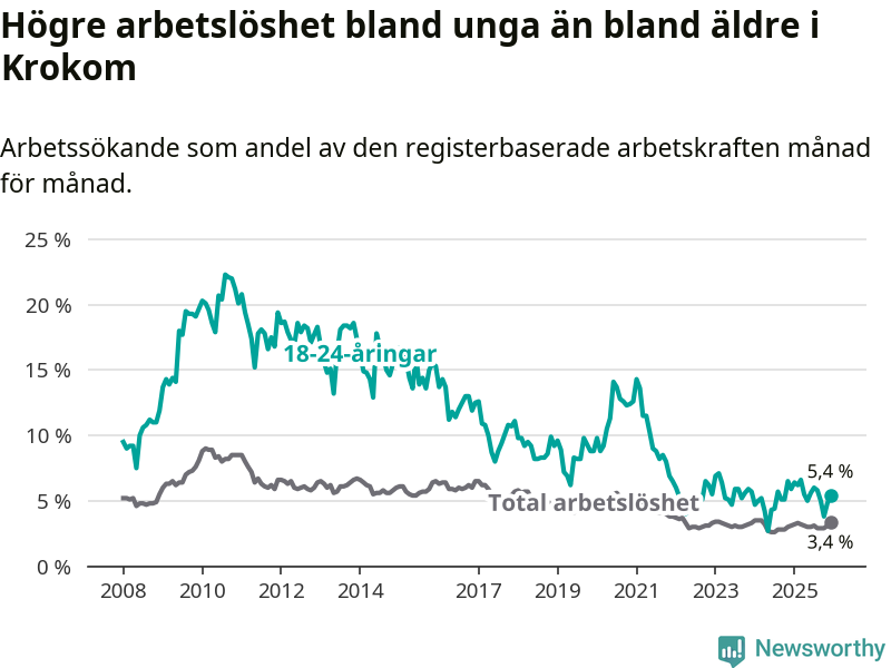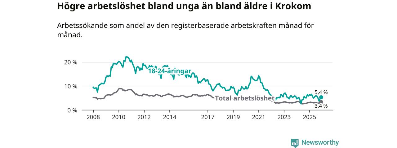 Precis som den totala arbetslösheten ligger ungdomsarbetslösheten i Krokom lägre än i Jämtland som helhet. Skillnaden mellan kommunen och länet är 1,0 procentenheter.