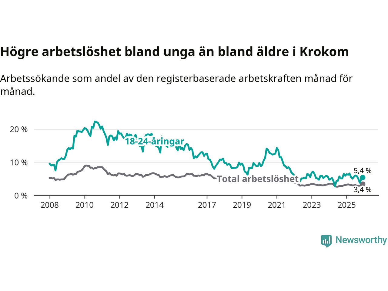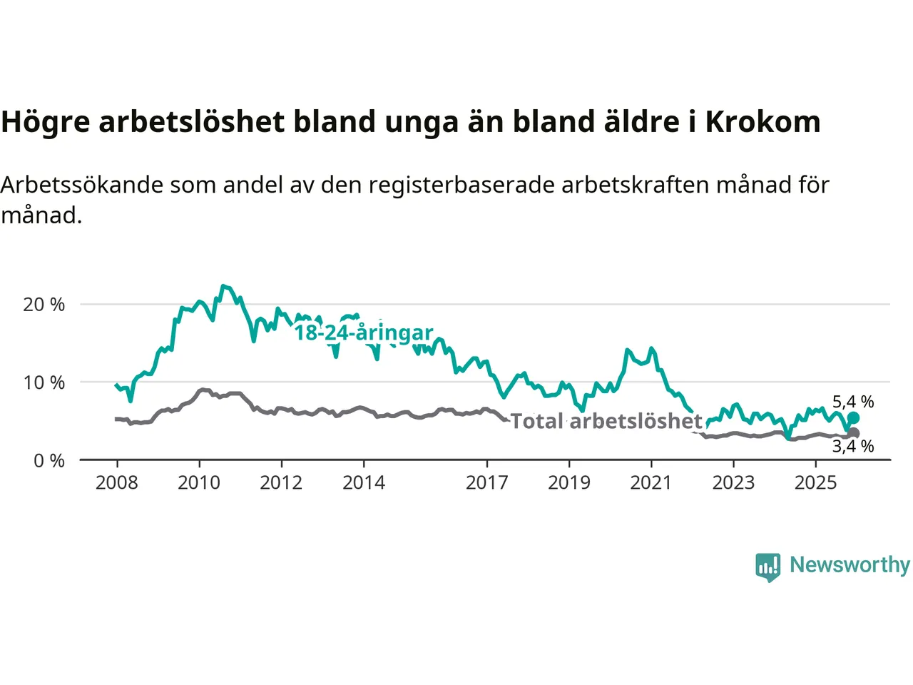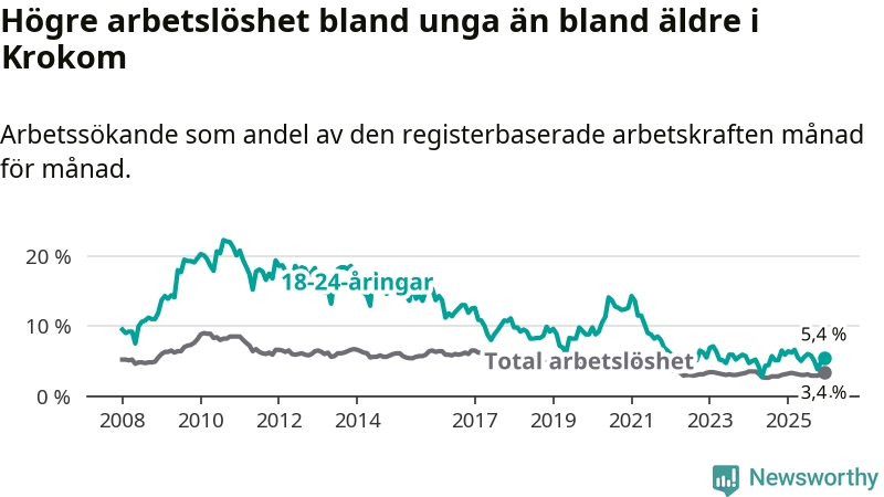 Till skillnad från den totala arbetslösheten sjunker arbetslösheten bland unga (−0,5 procentenheter). I december var 5,4 procent av 18–24-åringarna inskrivna som arbetssökande (motsvarande 36 personer). Mäter vi antalet inskrivna ser vi en minskning med ett personer på ett års sikt.