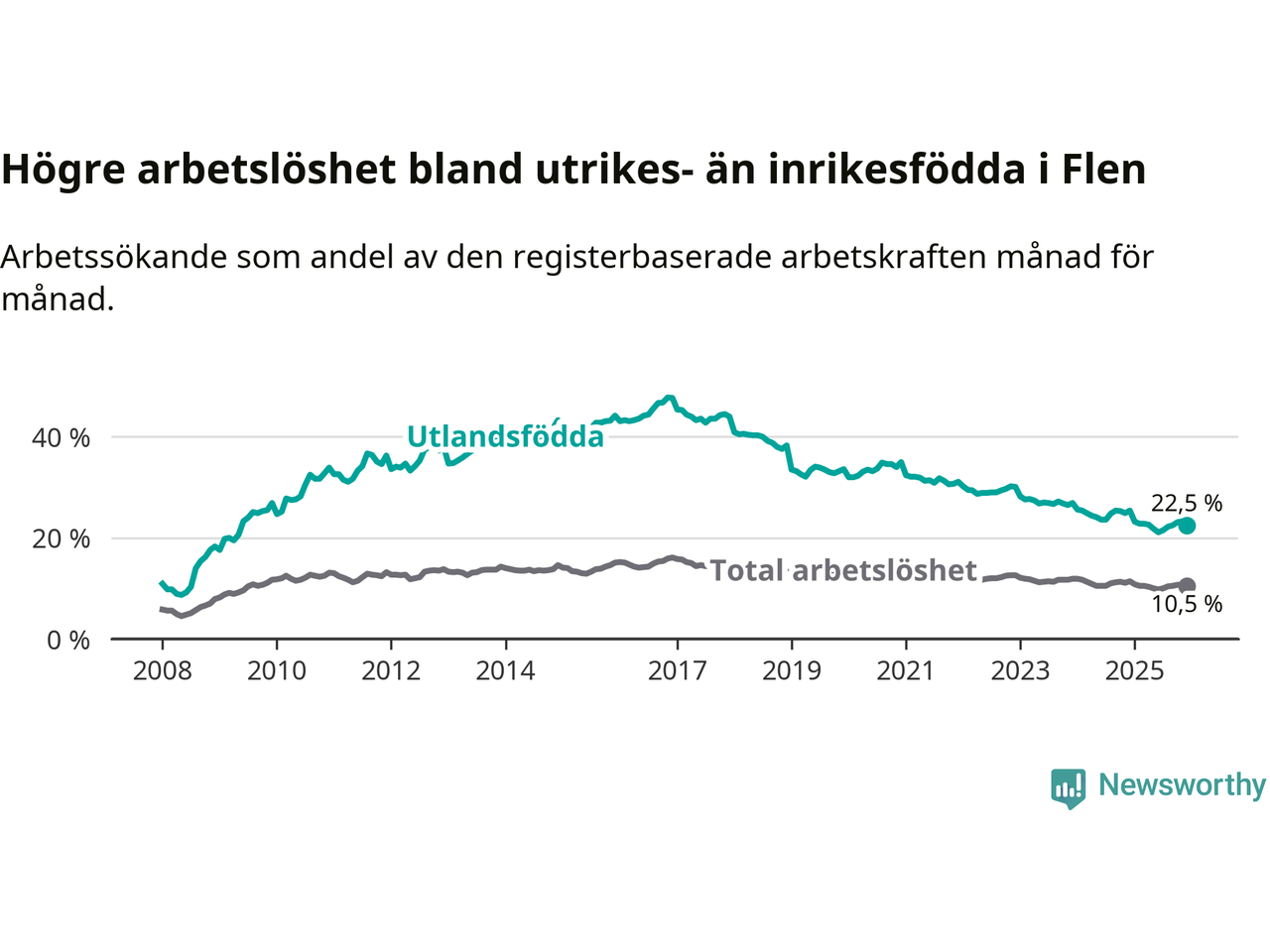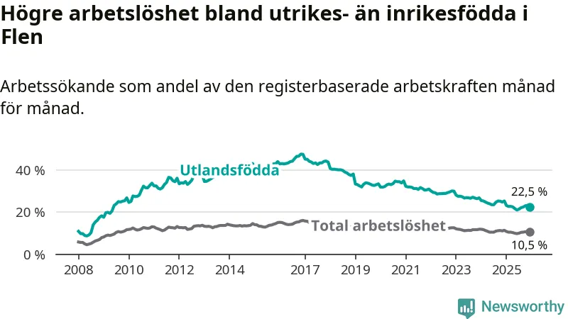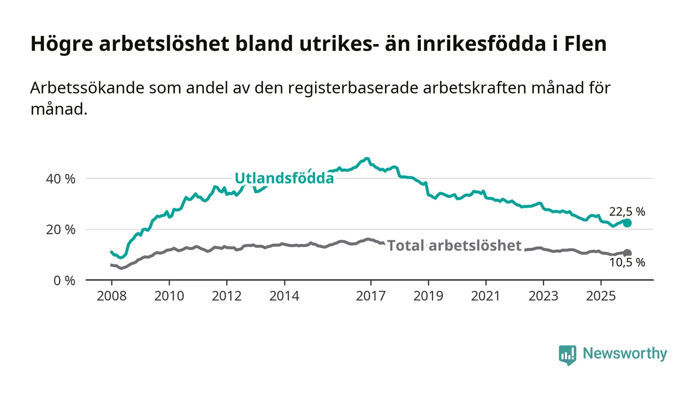 Skillnaden i arbetslöshet mellan utrikesfödda och hela befolkningen är 12,0 procentenheter i Flen. Det är en betydligt mindre skillnad än för ett år sedan (−2,0 procentenheter).