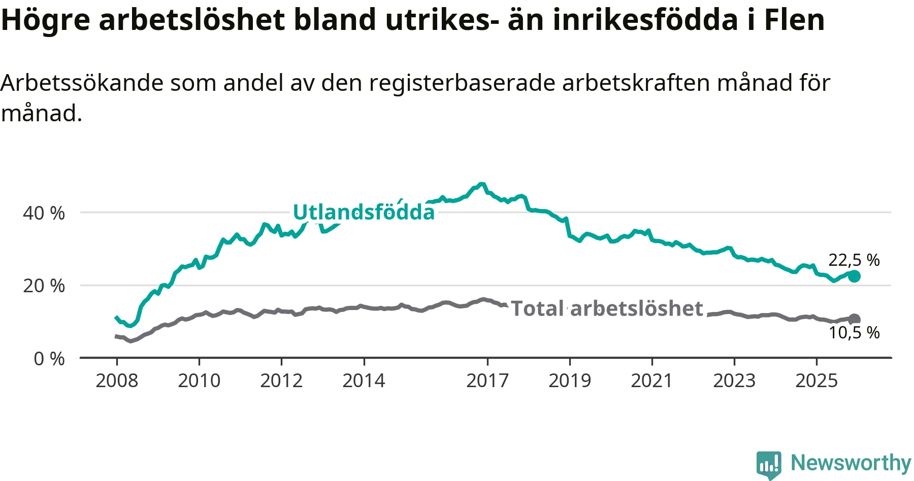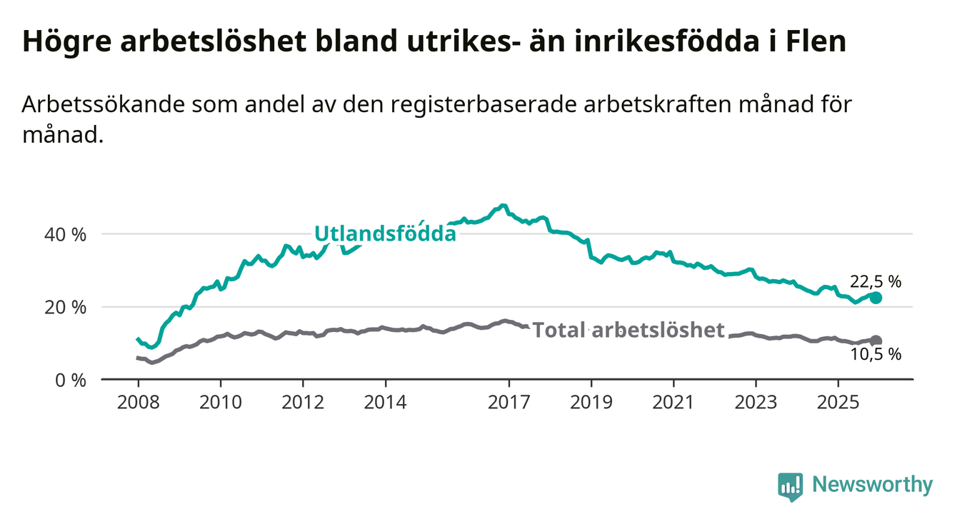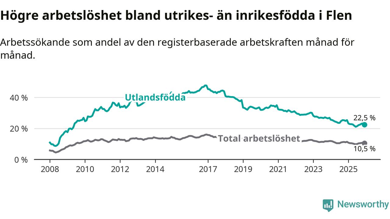 Arbetslösheten bland utlandsfödda var 22,5 procent i Flen under december månad, motsvarande 394 av 1 751 personer. Det är 2,9 procentenheter färre än vid samma tidpunkt i fjol (−62 om man räknar personer). Därmed har de utlandsföddas arbetslöshet varit lägre än vid samma tidpunkt i fjol i över fyra år i sträck. Sedan februari 2021 har arbetslösheten bland utlandsfödda minskat från 32,1 till 22,5 procent.