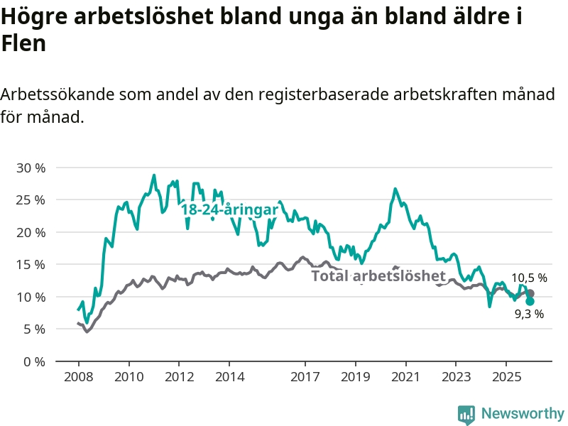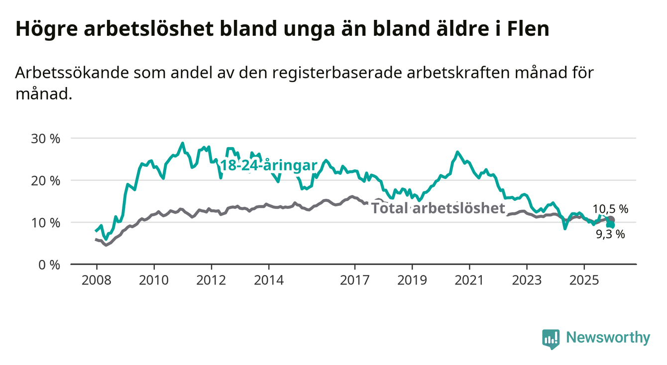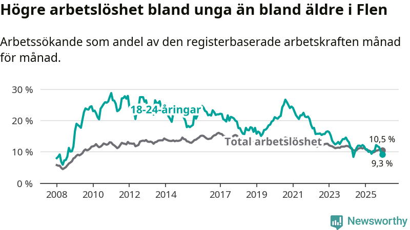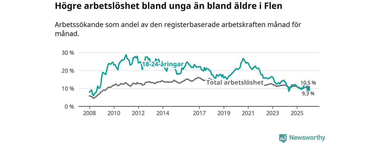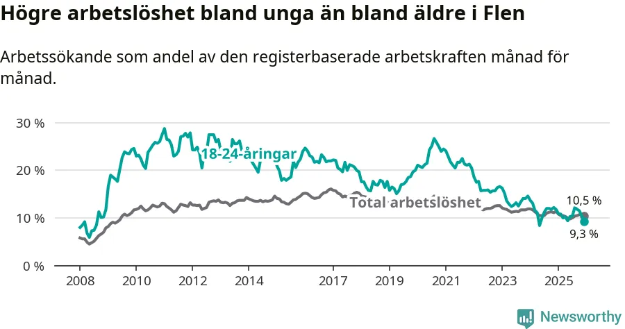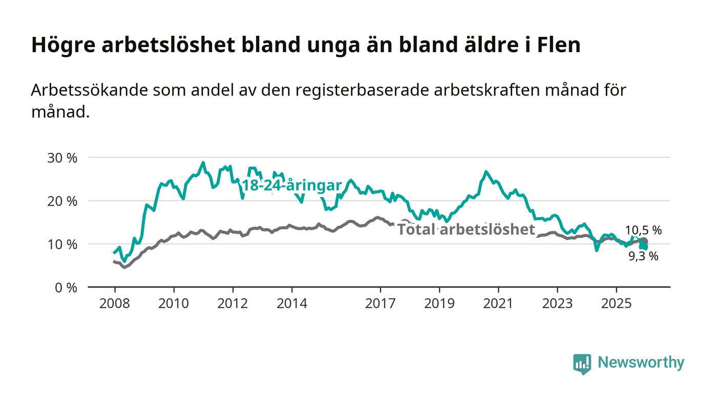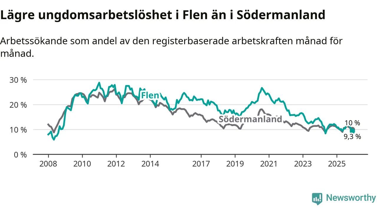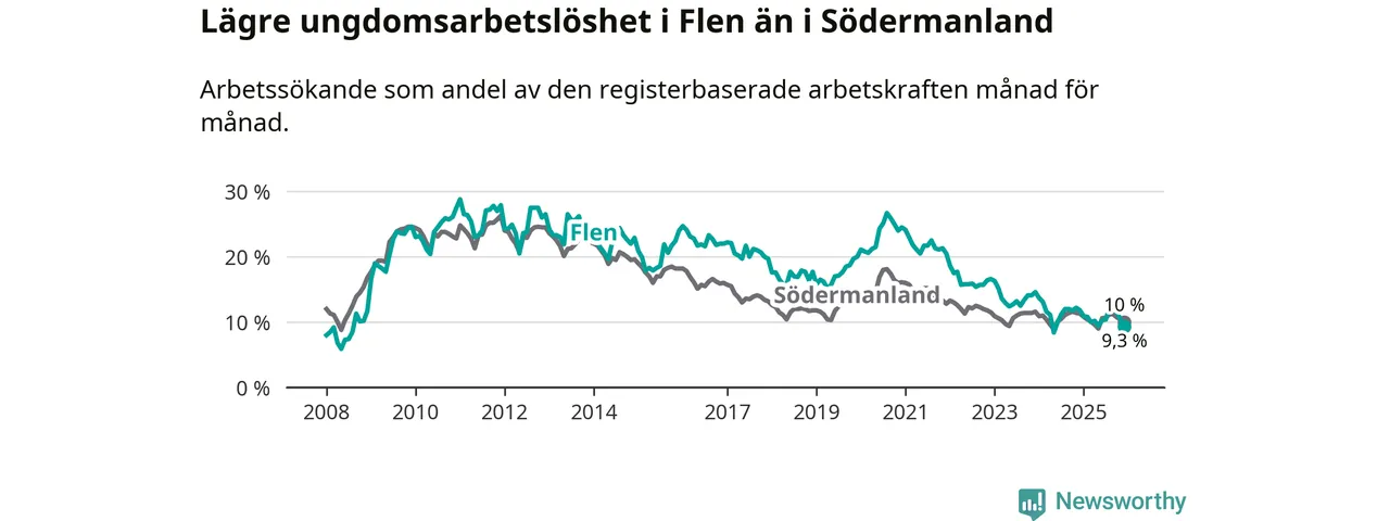 Medan Flen har högre total arbetslöshet än Södermanland, ligger ungdomsarbetslösheten 0,7 procentenheter lägre i Flen.