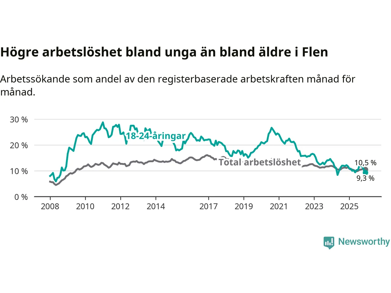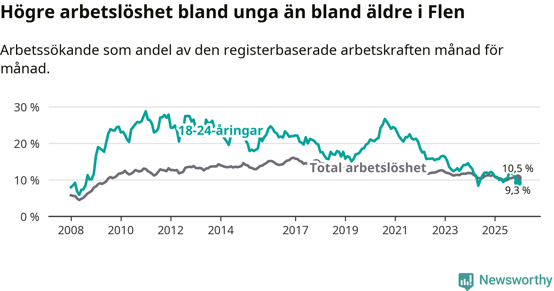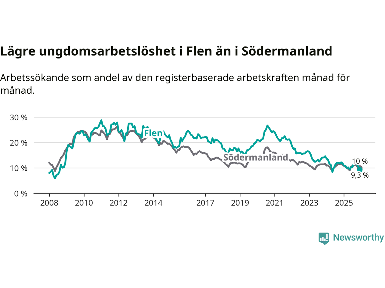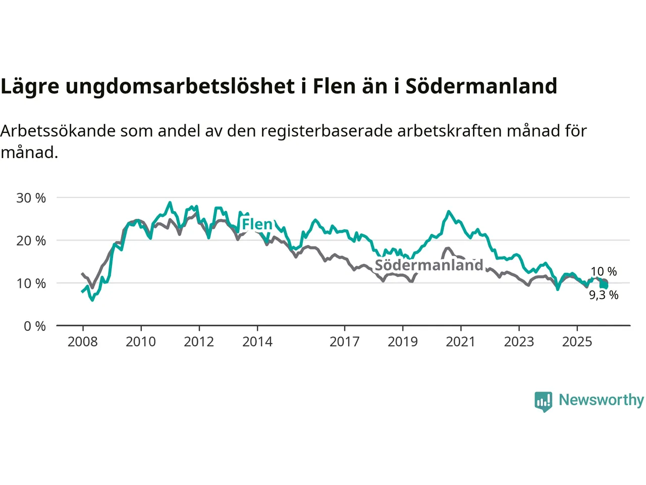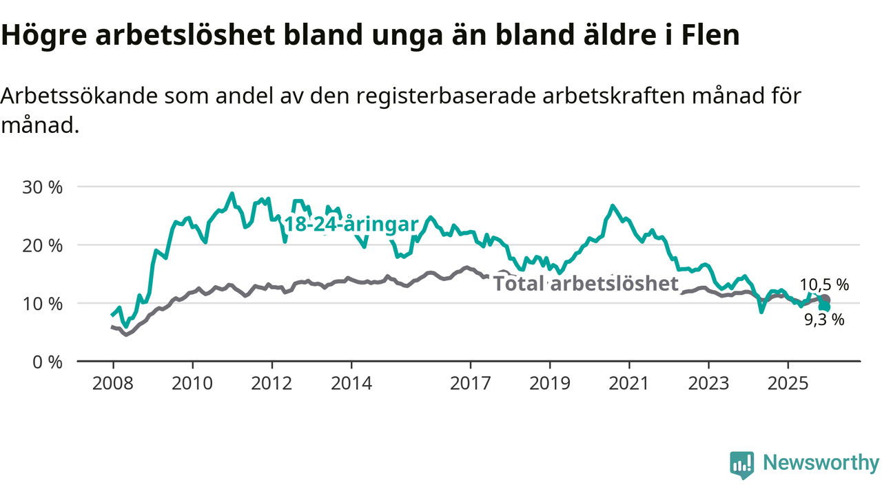Medan Flen har högre total arbetslöshet än Södermanland, ligger ungdomsarbetslösheten 0,7 procentenheter lägre i Flen.