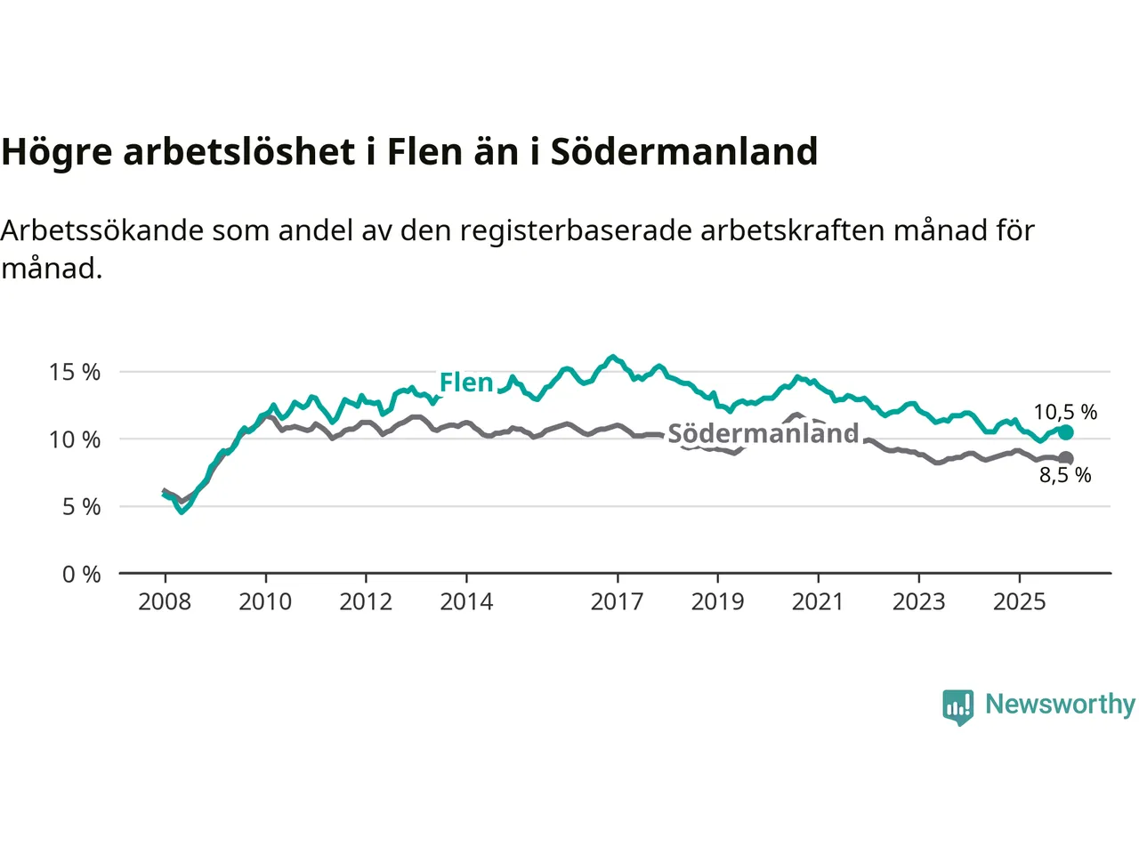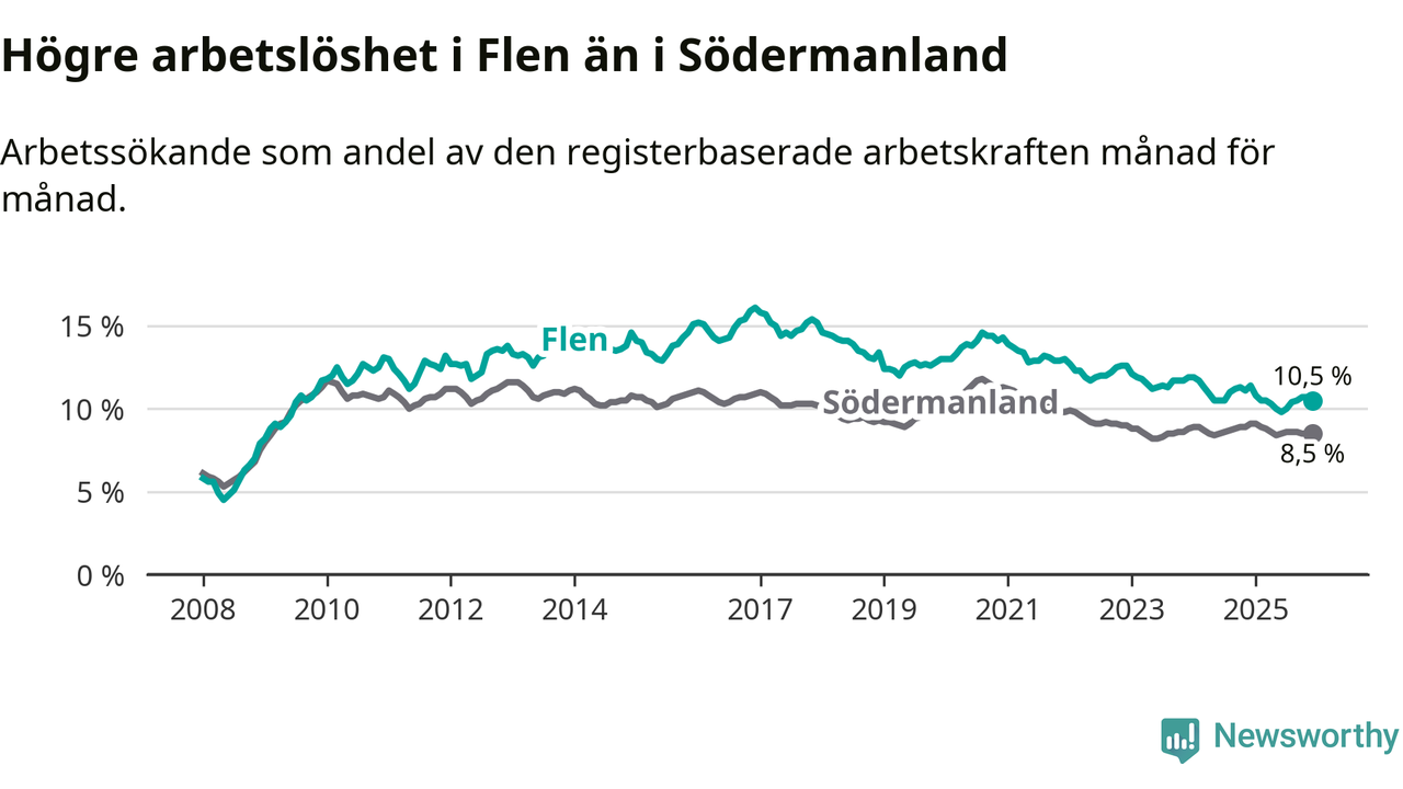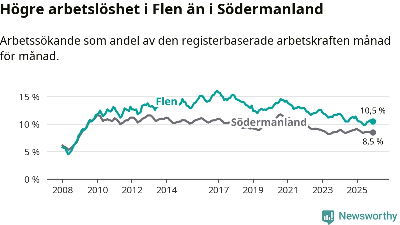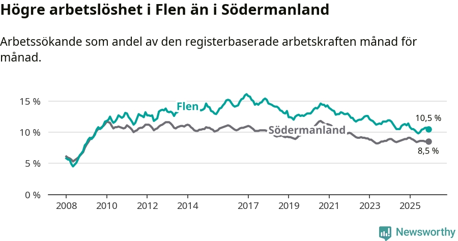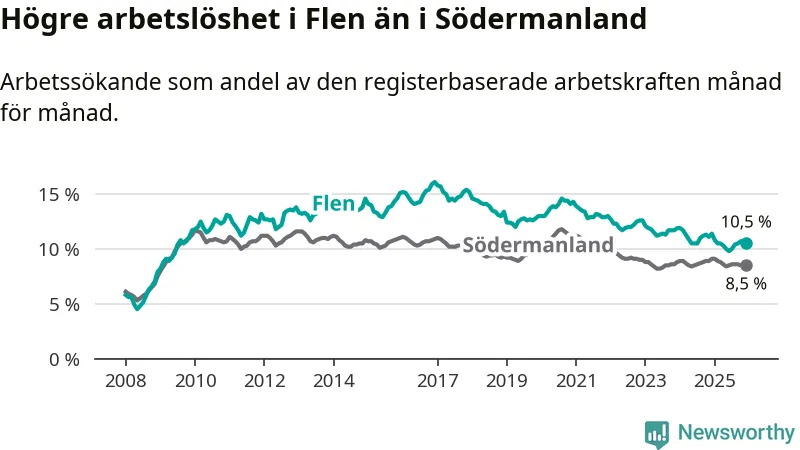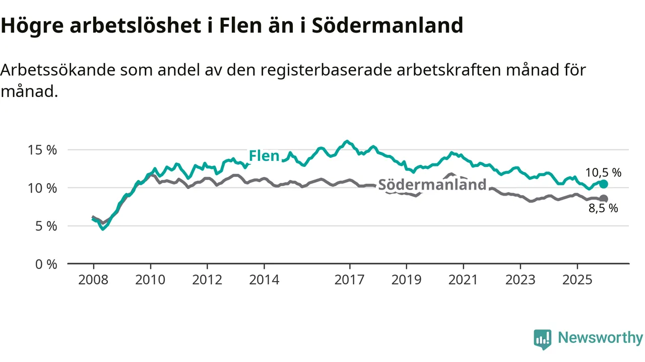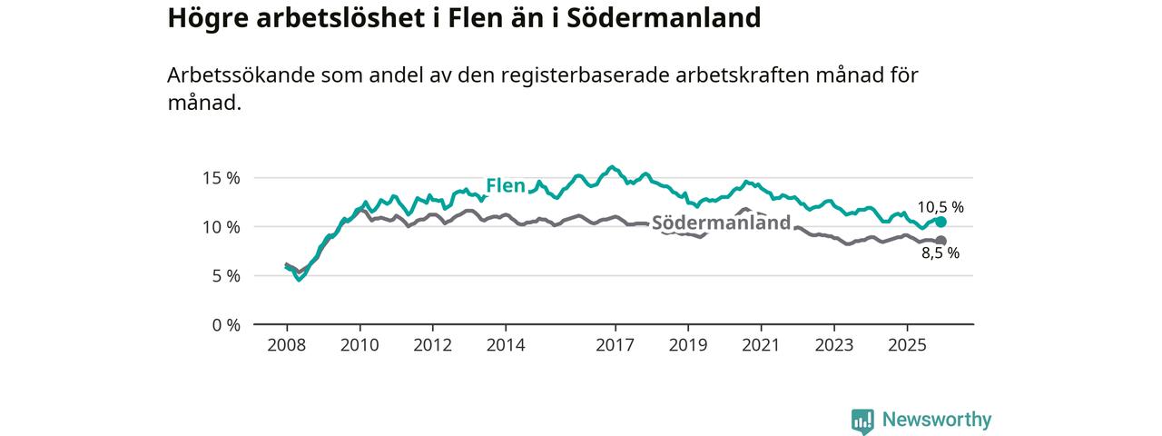 Under december månad rapporterade Flens kommun en total arbetslöshet på 10,5 procent. Det är en minskning jämfört med samma tidpunkt i fjol (−0,9 procentenheter). Även i Södermanlands län sjunker arbetslösheten .
