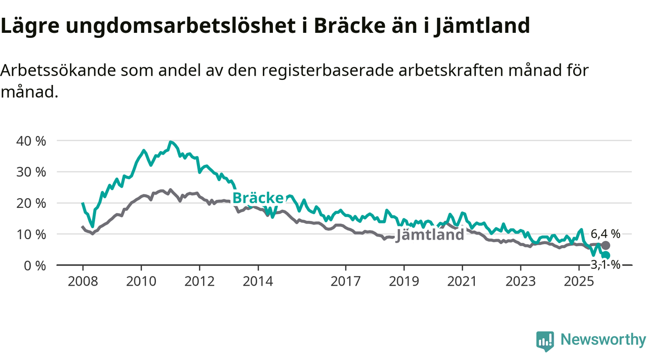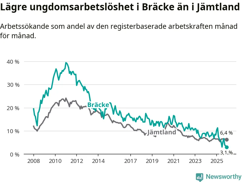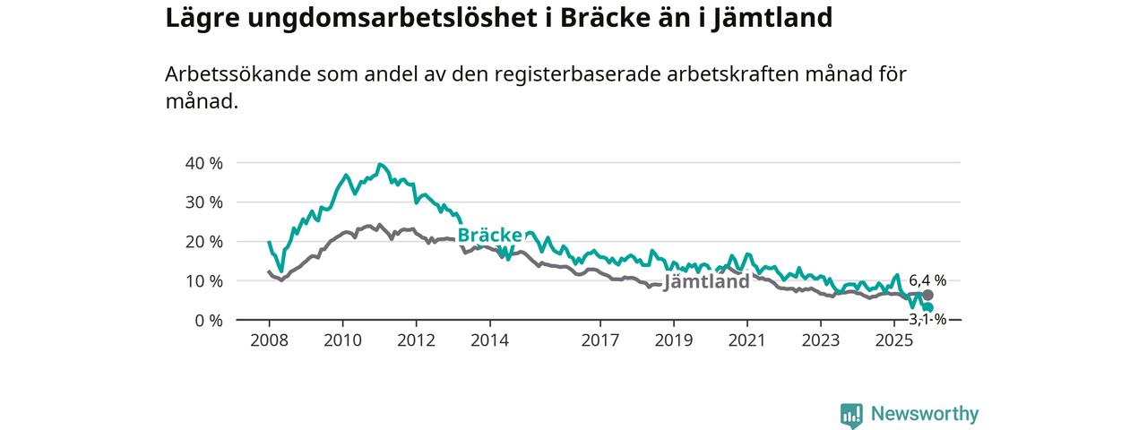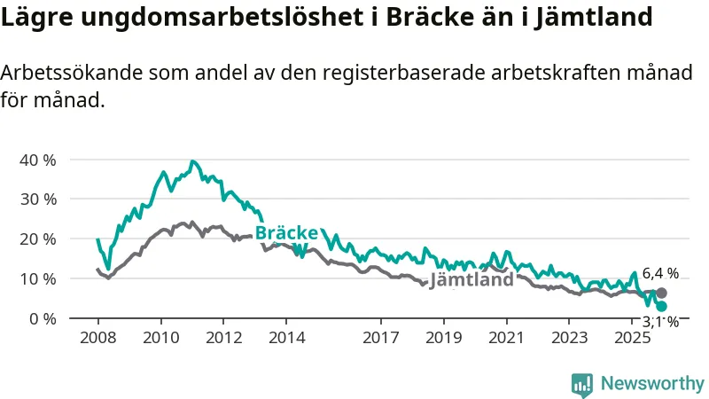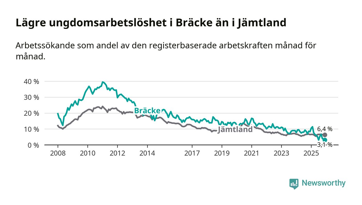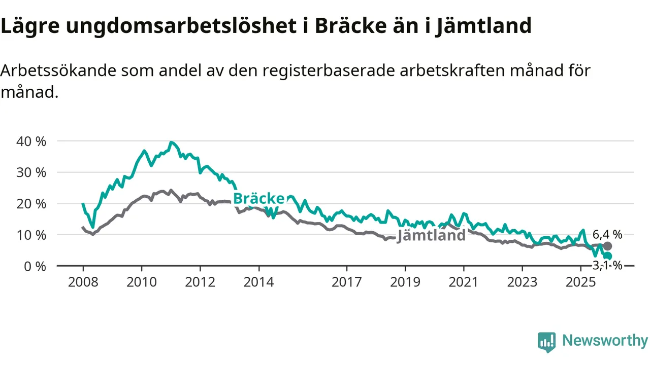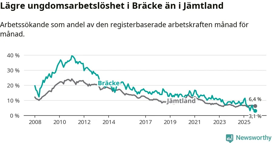 I och med den senaste månadens nedgång har de ungas arbetslöshet i Bräcke sjunkit tio månader i följd (ner från 11,4 procent i februari 2025 till 3,1 procent nu).