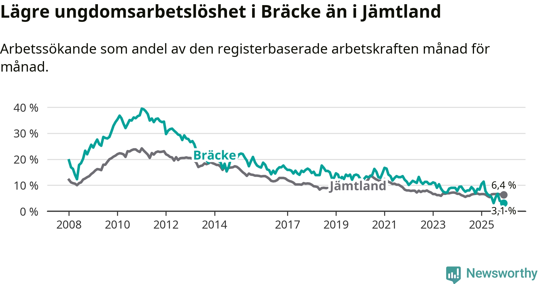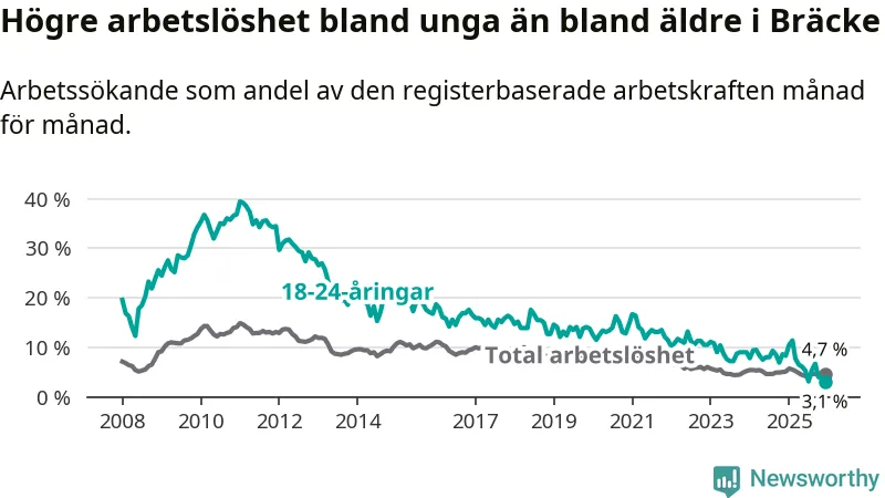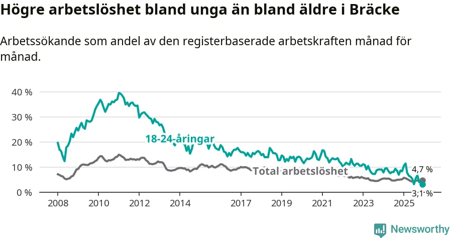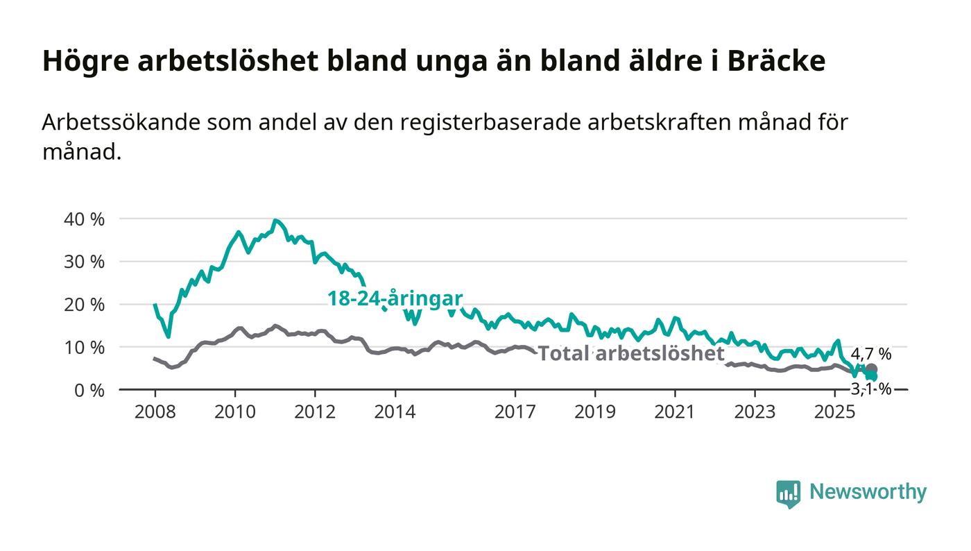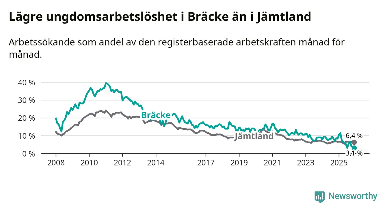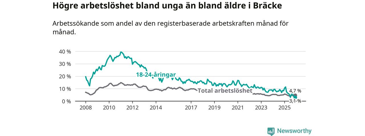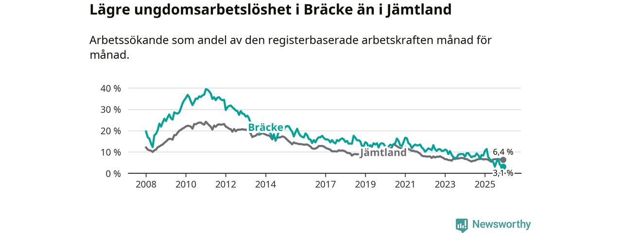 I och med den senaste månadens nedgång har de ungas arbetslöshet i Bräcke sjunkit tio månader i följd (ner från 11,4 procent i februari 2025 till 3,1 procent nu).