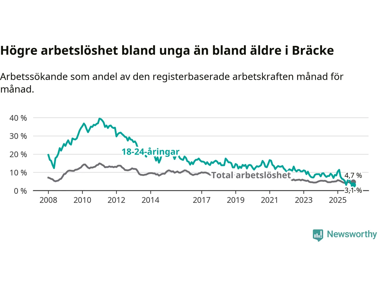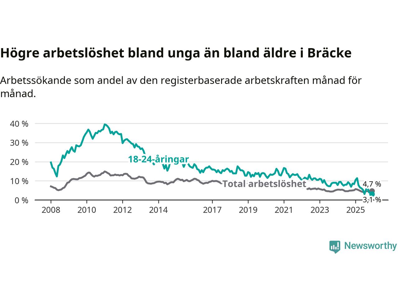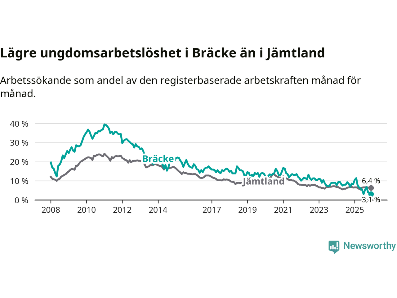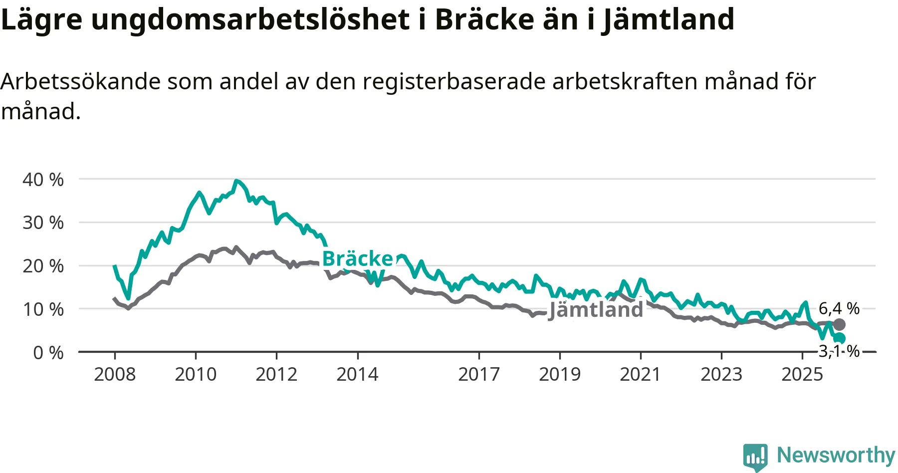 I och med den senaste månadens nedgång har de ungas arbetslöshet i Bräcke sjunkit tio månader i följd (ner från 11,4 procent i februari 2025 till 3,1 procent nu).