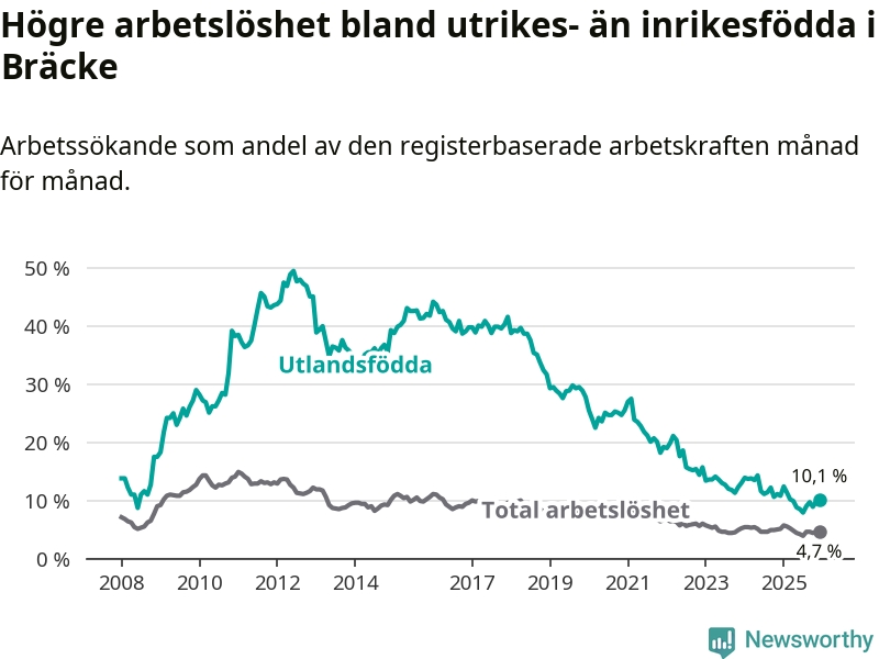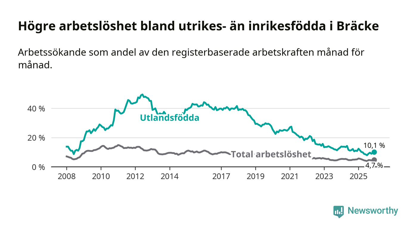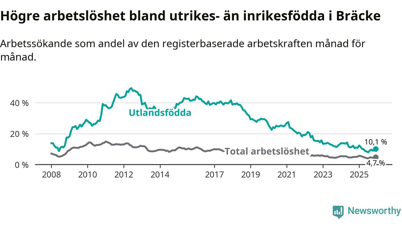 Arbetslösheten bland utlandsfödda var 10,1 procent i Bräcke under december månad, motsvarande 39 av 386 personer. Det är 0,7 procentenheter färre än vid samma tidpunkt i fjol (−1 om man räknar personer). Därmed är de utlandsföddas arbetslöshet lägre än vid samma tidpunkt i fjol för 15:e månaden i följd. Sedan september 2024 har arbetslösheten bland utlandsfödda minskat från 12,2 till 10,1 procent.