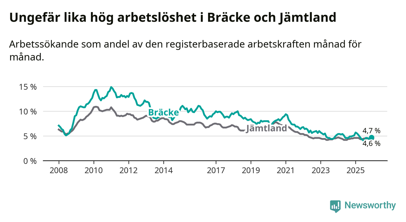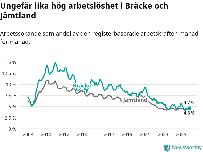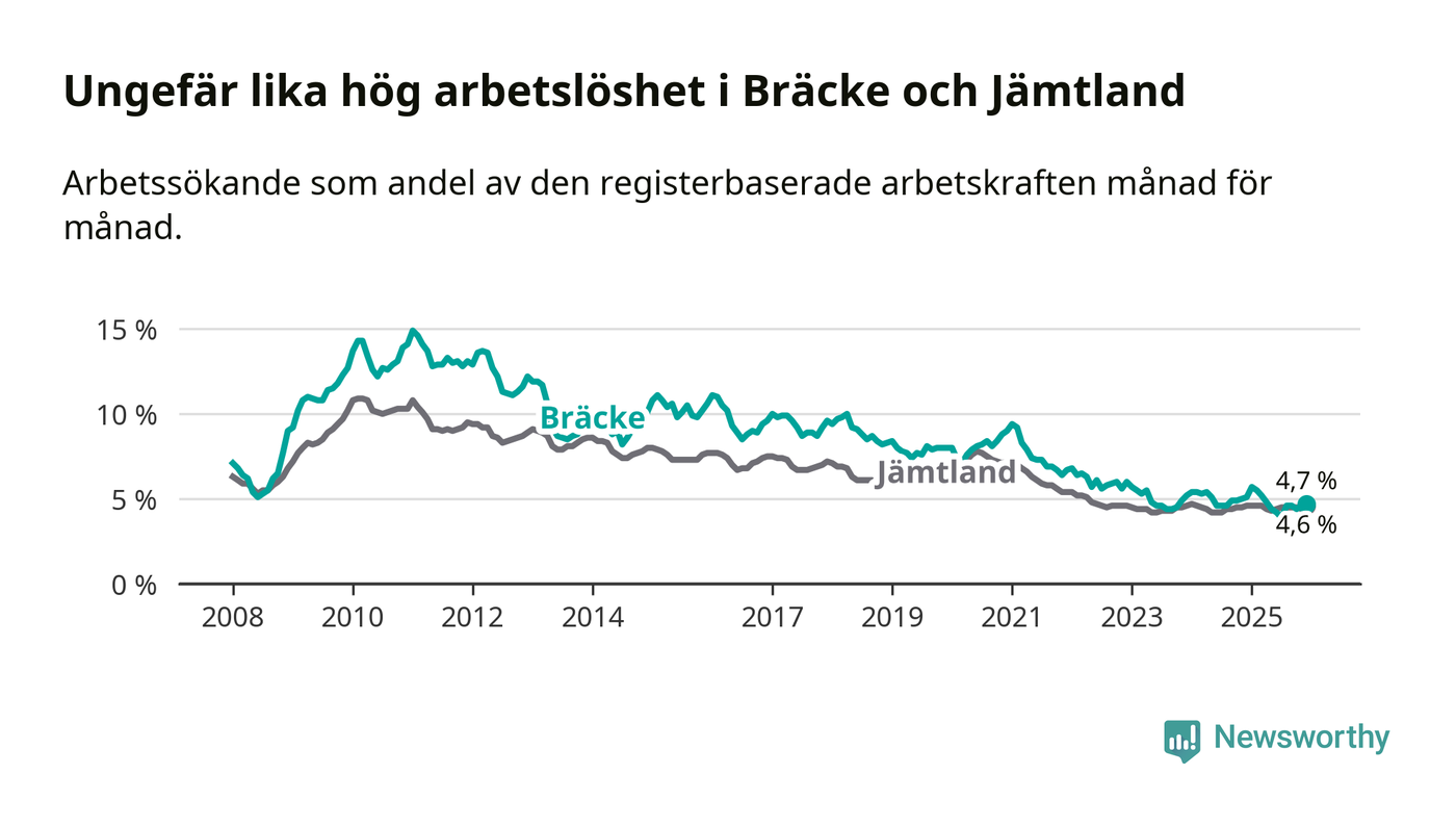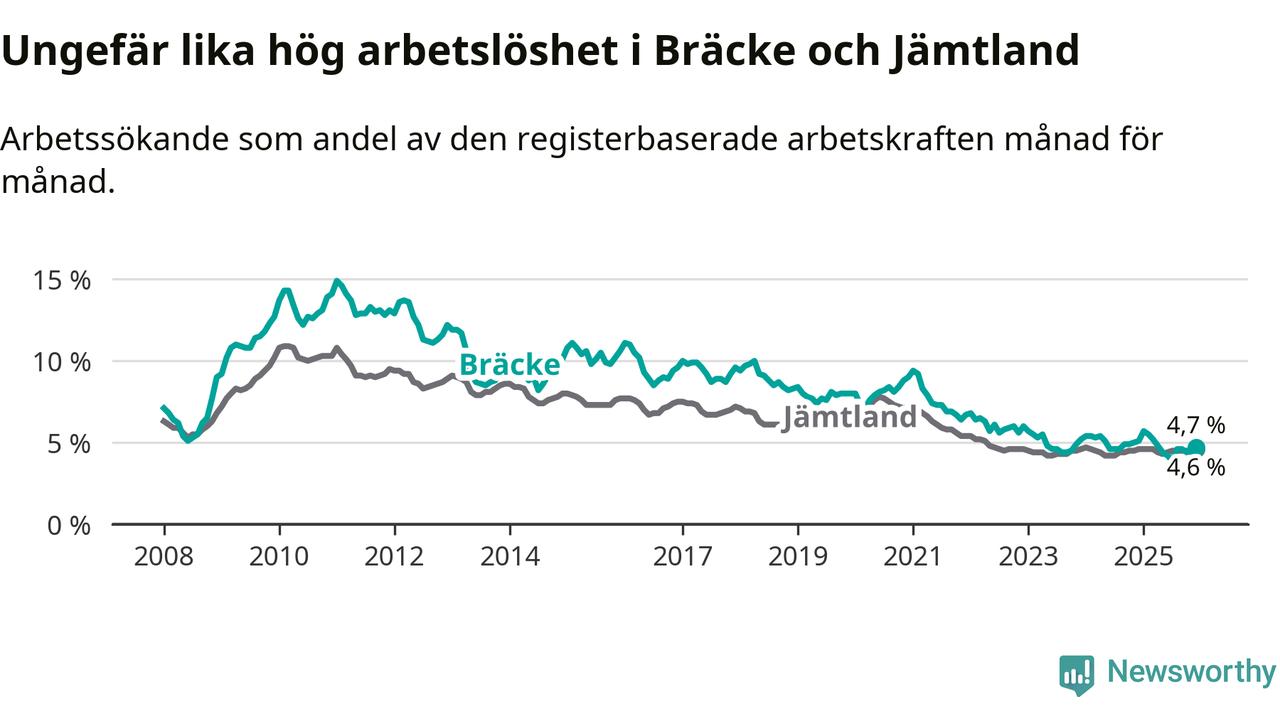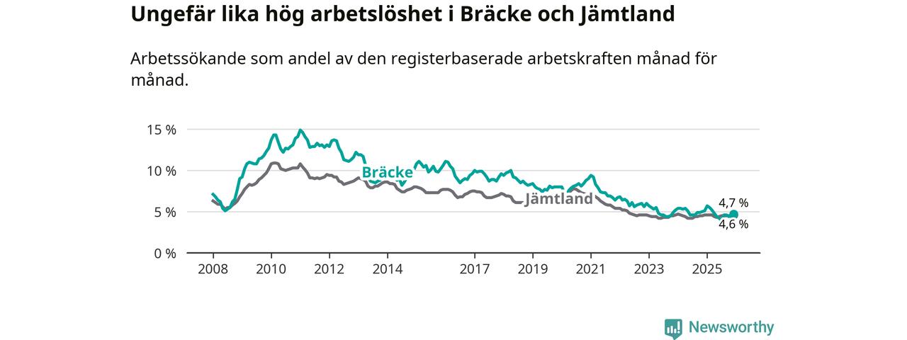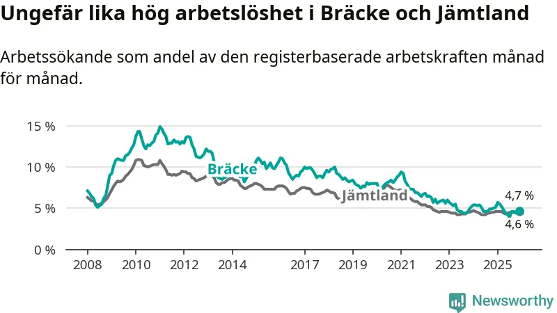 Under december månad rapporterade Bräcke kommun en total arbetslöshet på 4,7 procent. Det är en minskning jämfört med samma tidpunkt i fjol (−0,4 procentenheter). I Jämtlands län däremot står arbetslösheten stilla.
