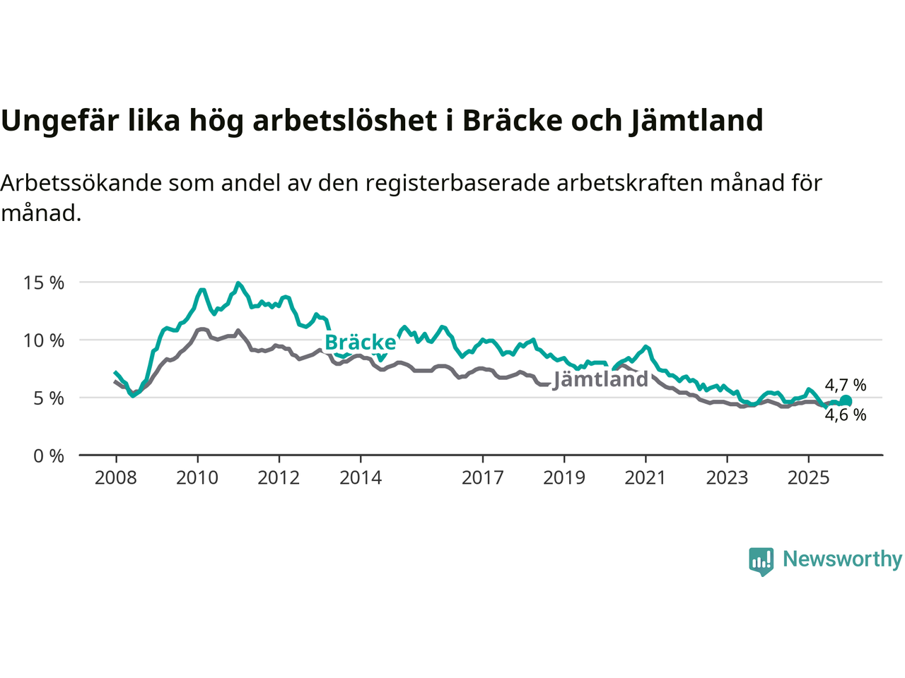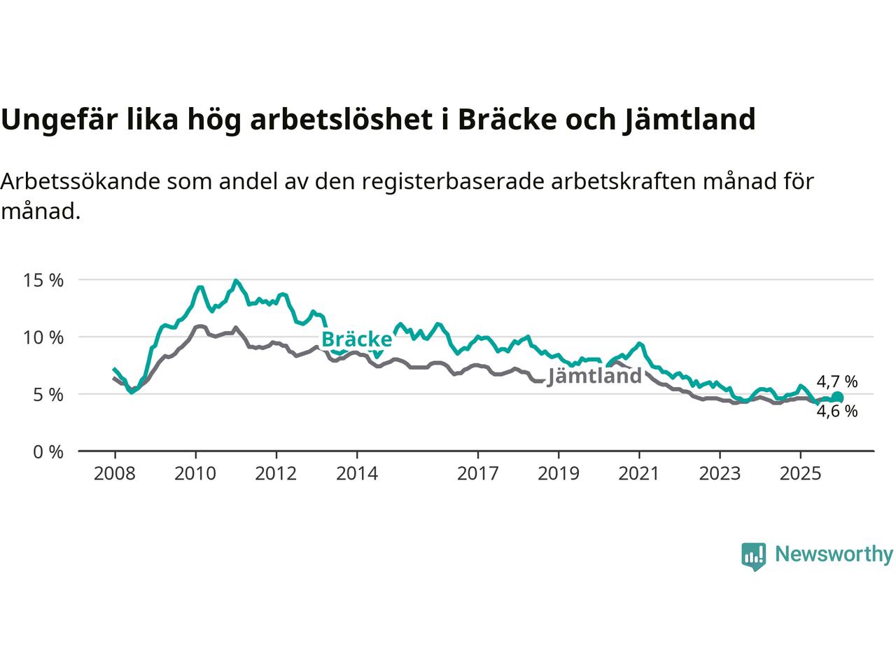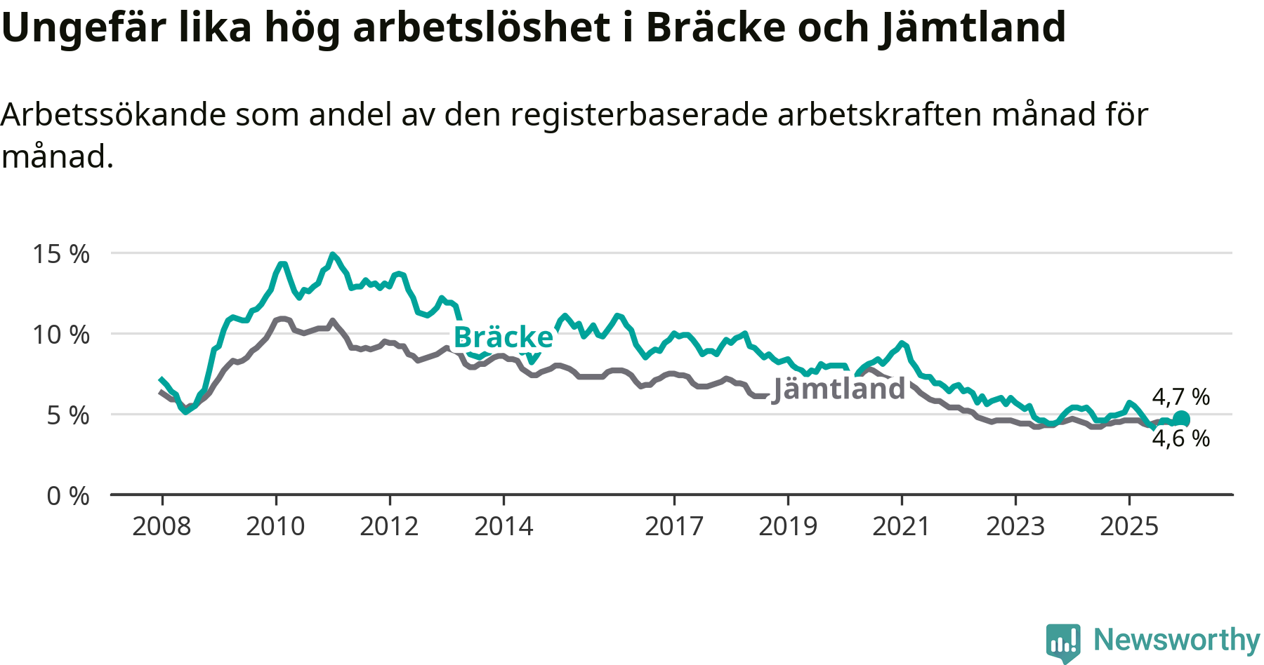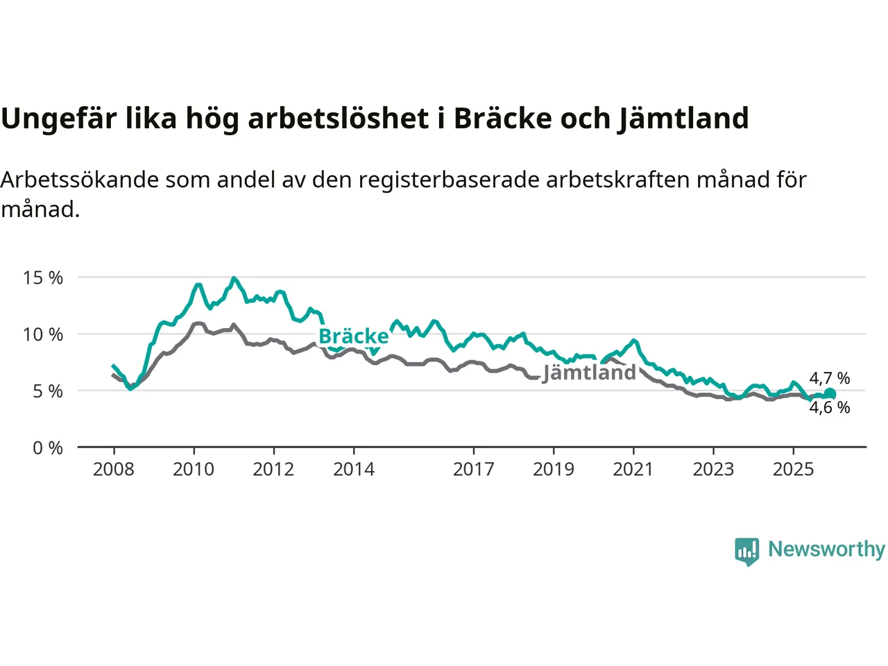 Under december månad rapporterade Bräcke kommun en total arbetslöshet på 4,7 procent. Det är en minskning jämfört med samma tidpunkt i fjol (−0,4 procentenheter). I Jämtlands län däremot står arbetslösheten stilla.