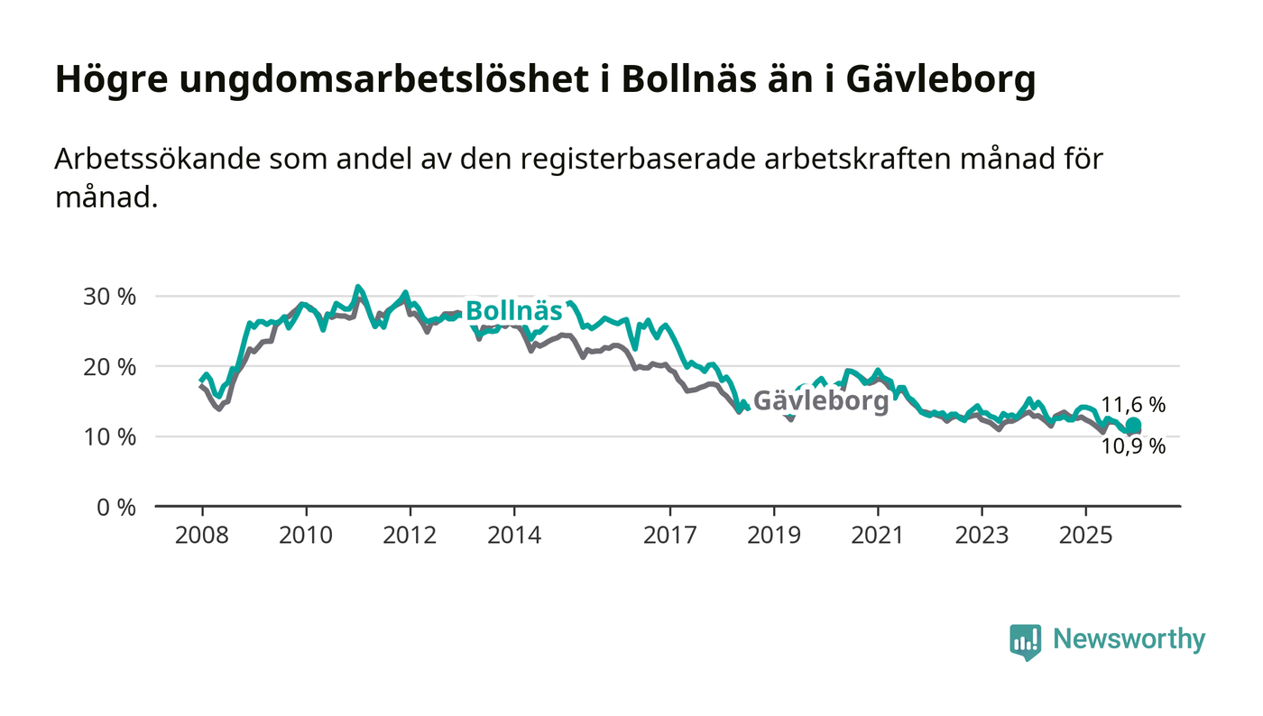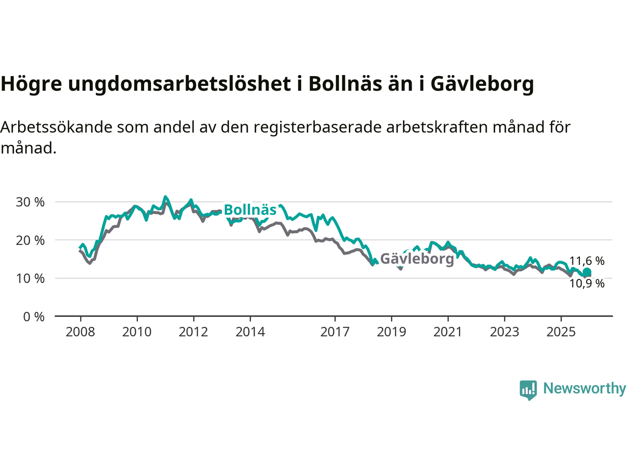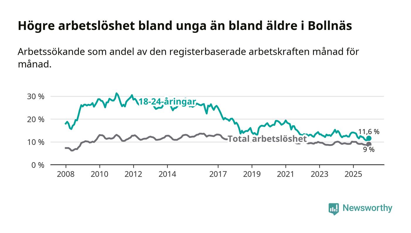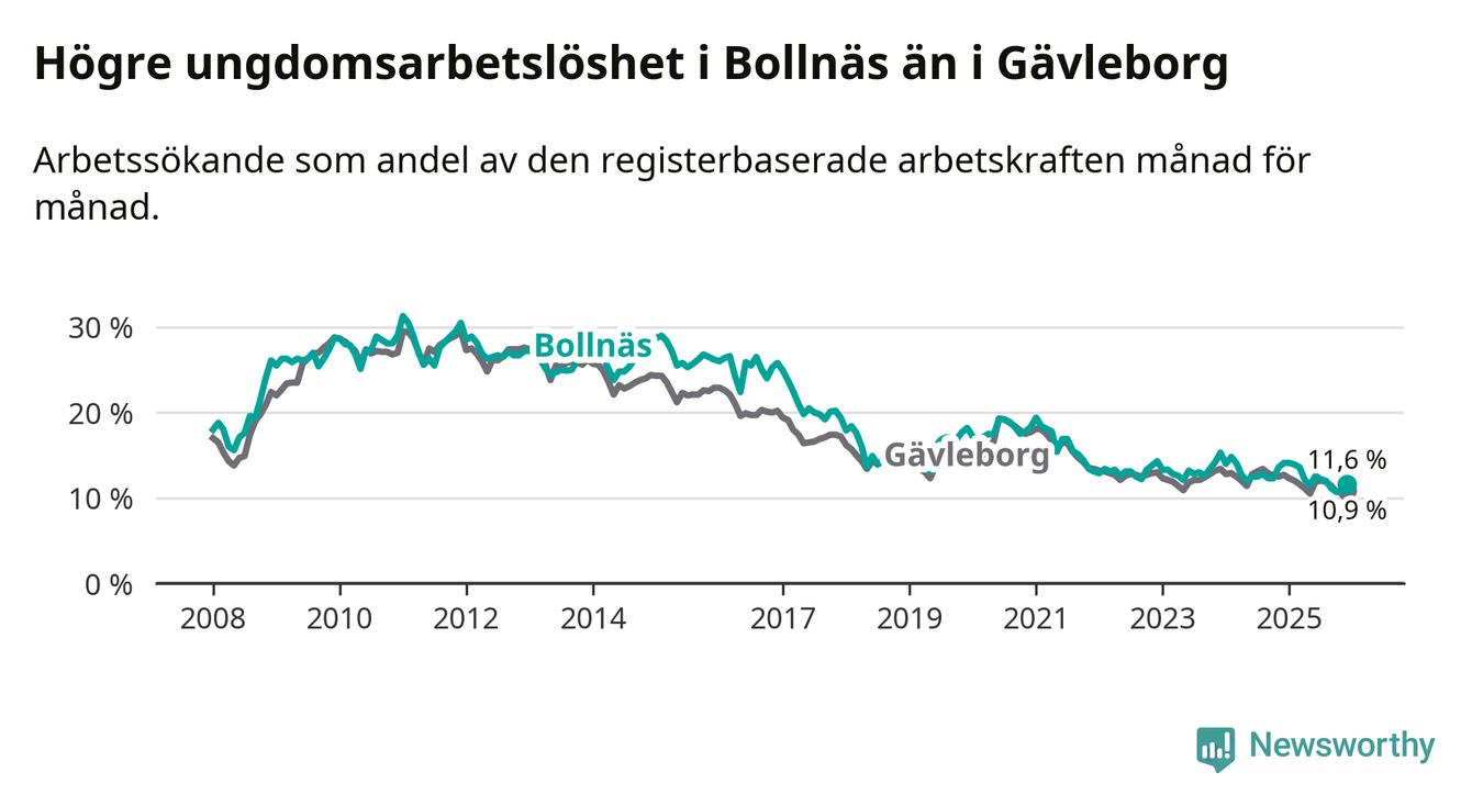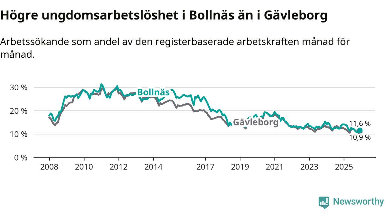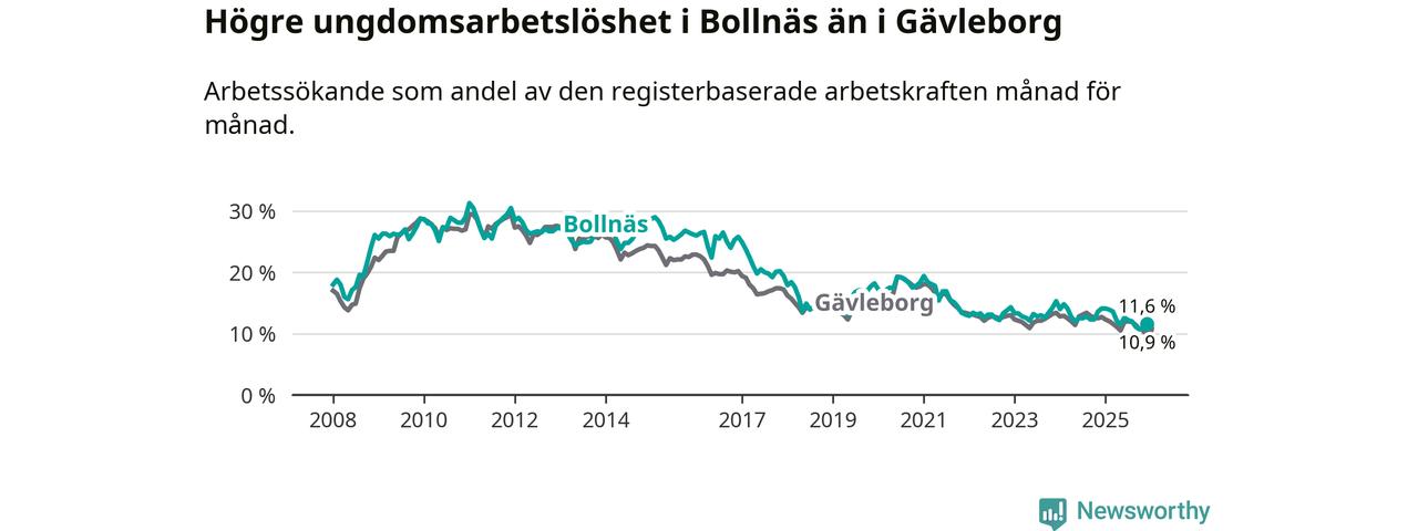 Precis som den totala arbetslösheten ligger ungdomsarbetslösheten i Bollnäs högre än i Gävleborg som helhet. Skillnaden mellan kommunen och länet är 0,7 procentenheter.