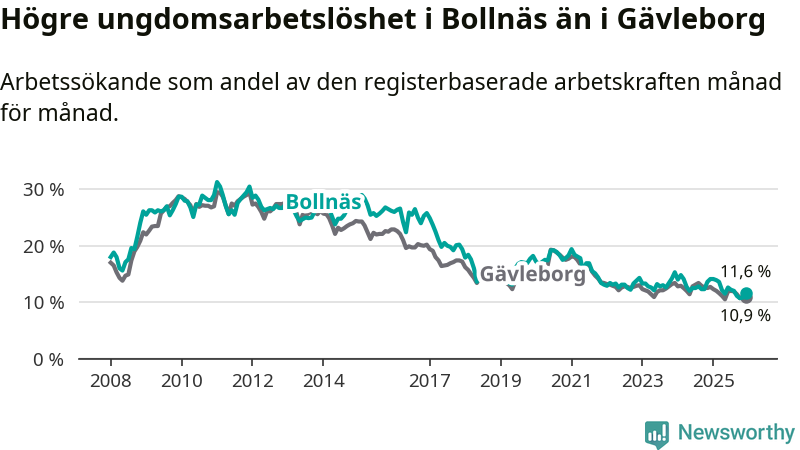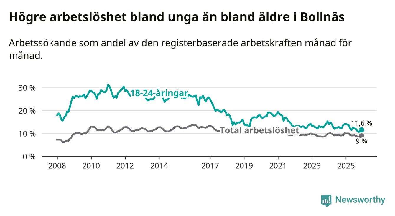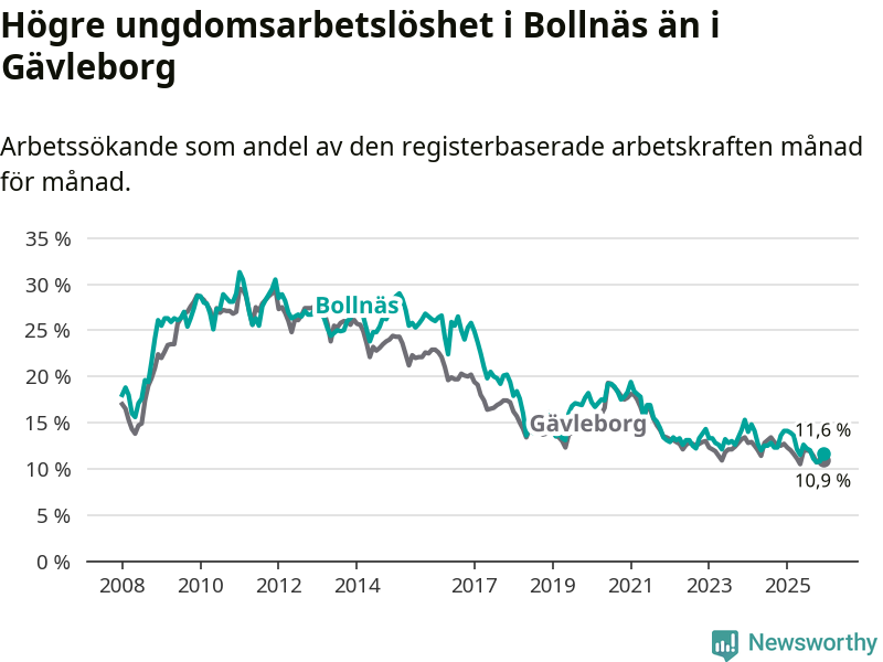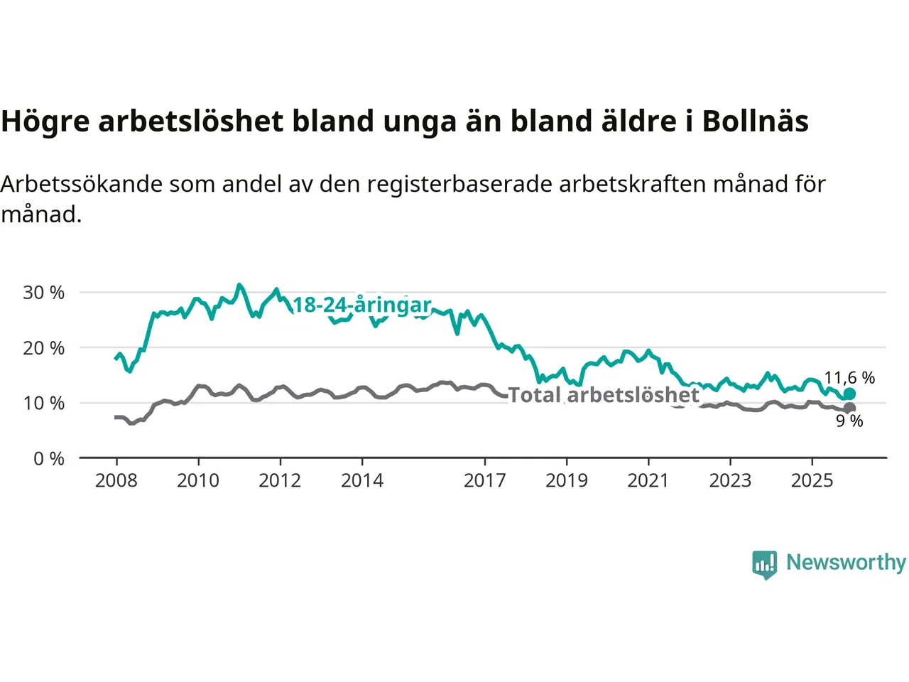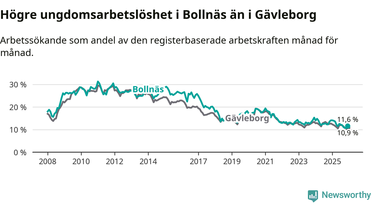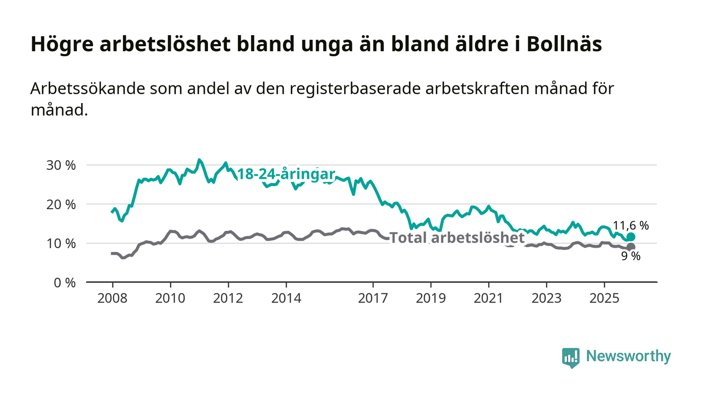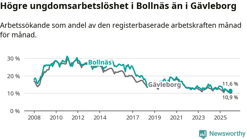Precis som den totala arbetslösheten ligger ungdomsarbetslösheten i Bollnäs högre än i Gävleborg som helhet. Skillnaden mellan kommunen och länet är 0,7 procentenheter.