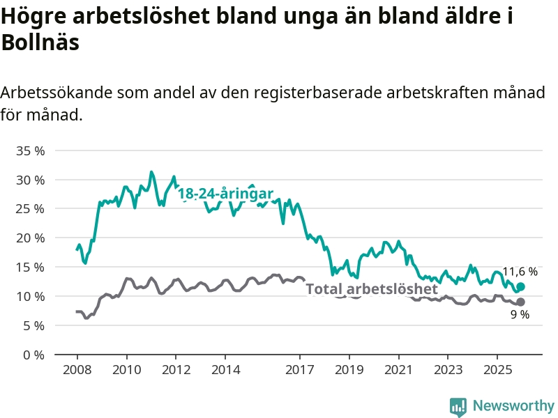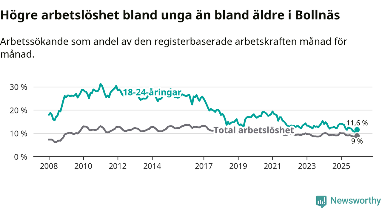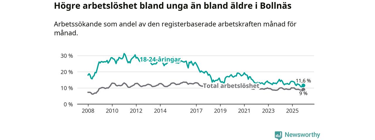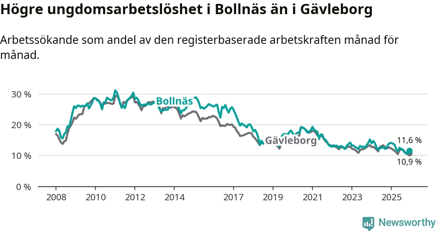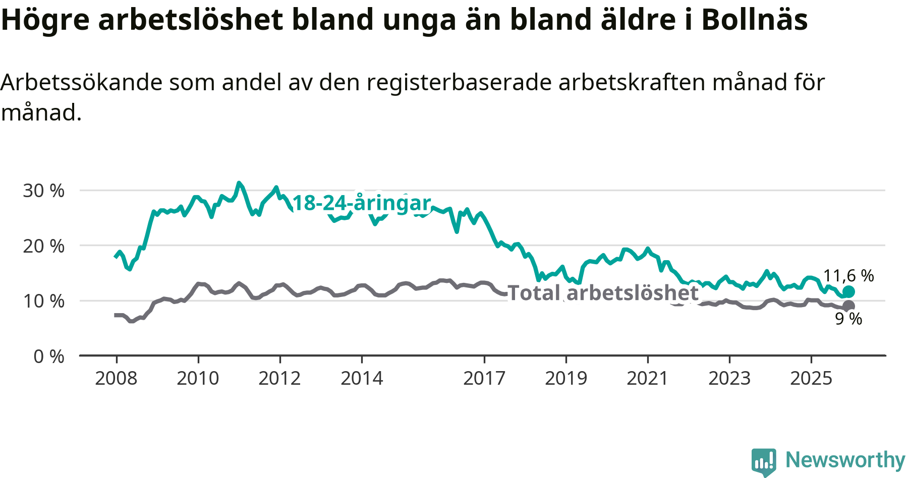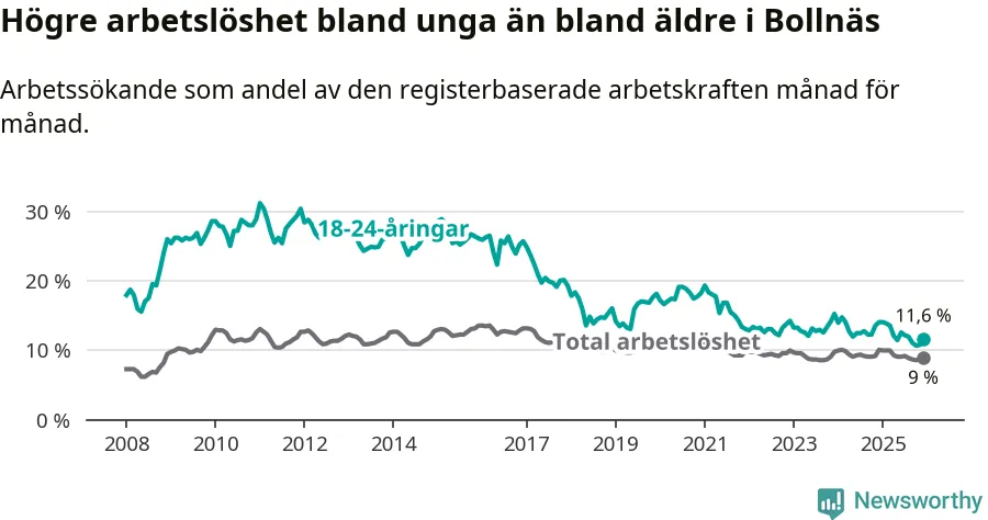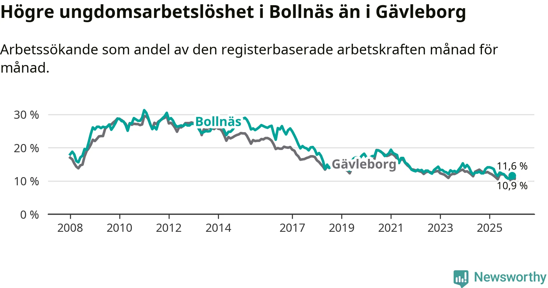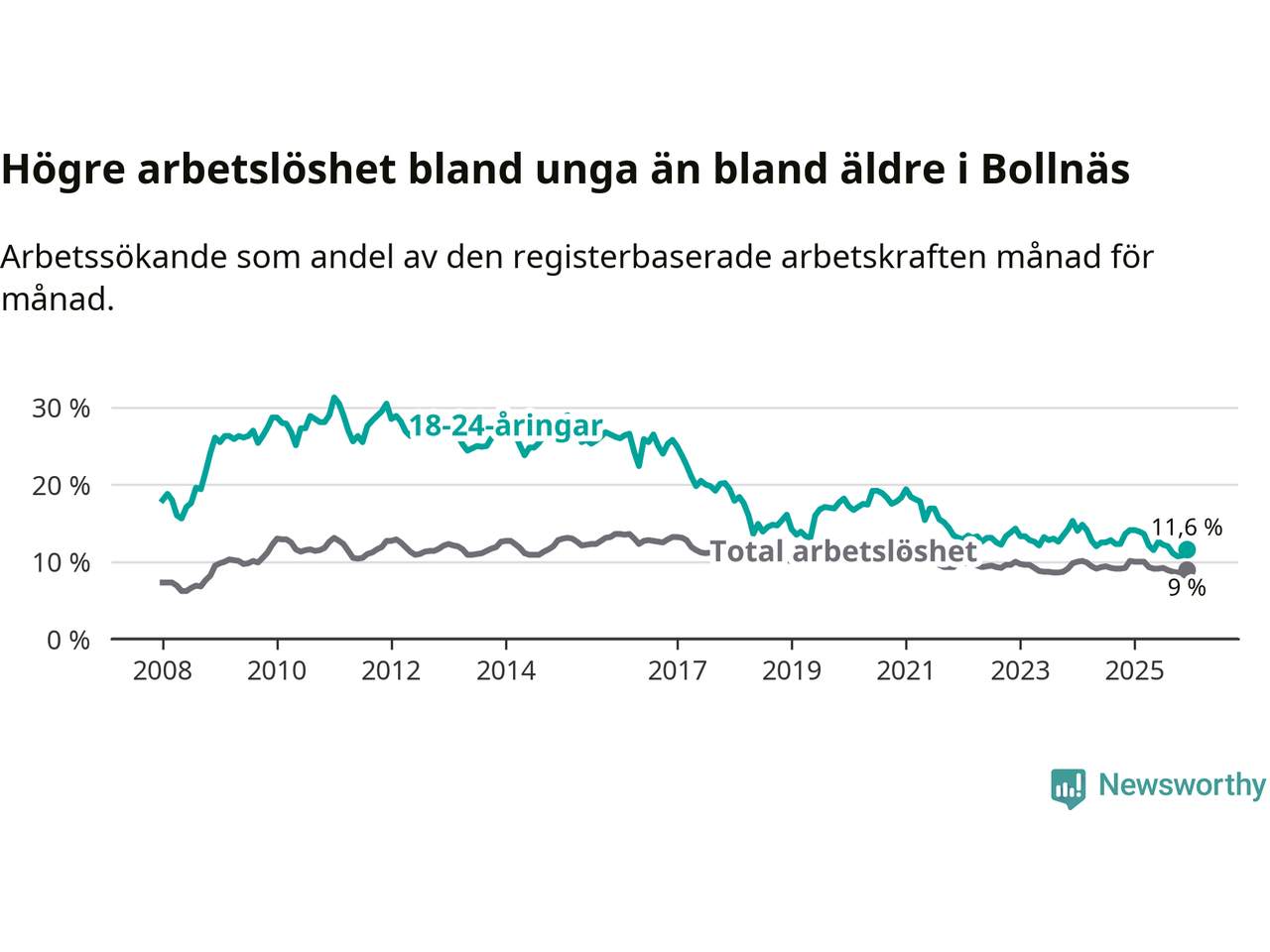 Precis som den totala arbetslösheten ligger ungdomsarbetslösheten i Bollnäs högre än i Gävleborg som helhet. Skillnaden mellan kommunen och länet är 0,7 procentenheter.