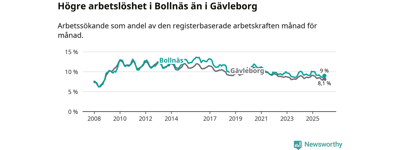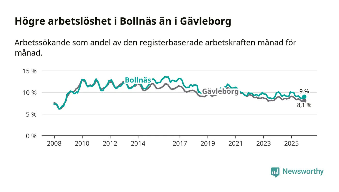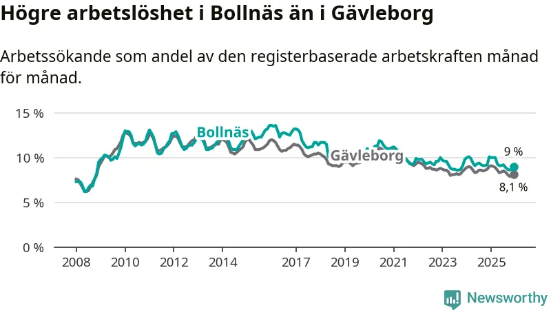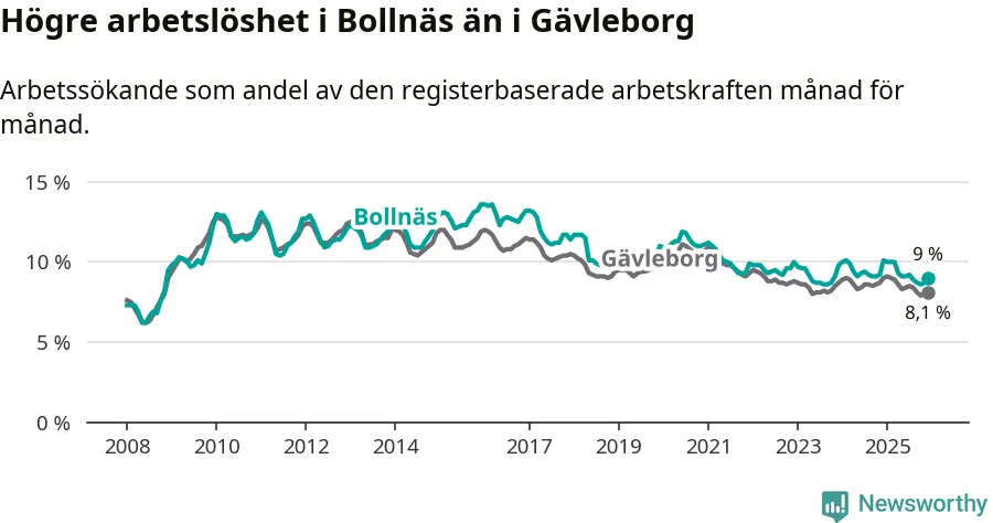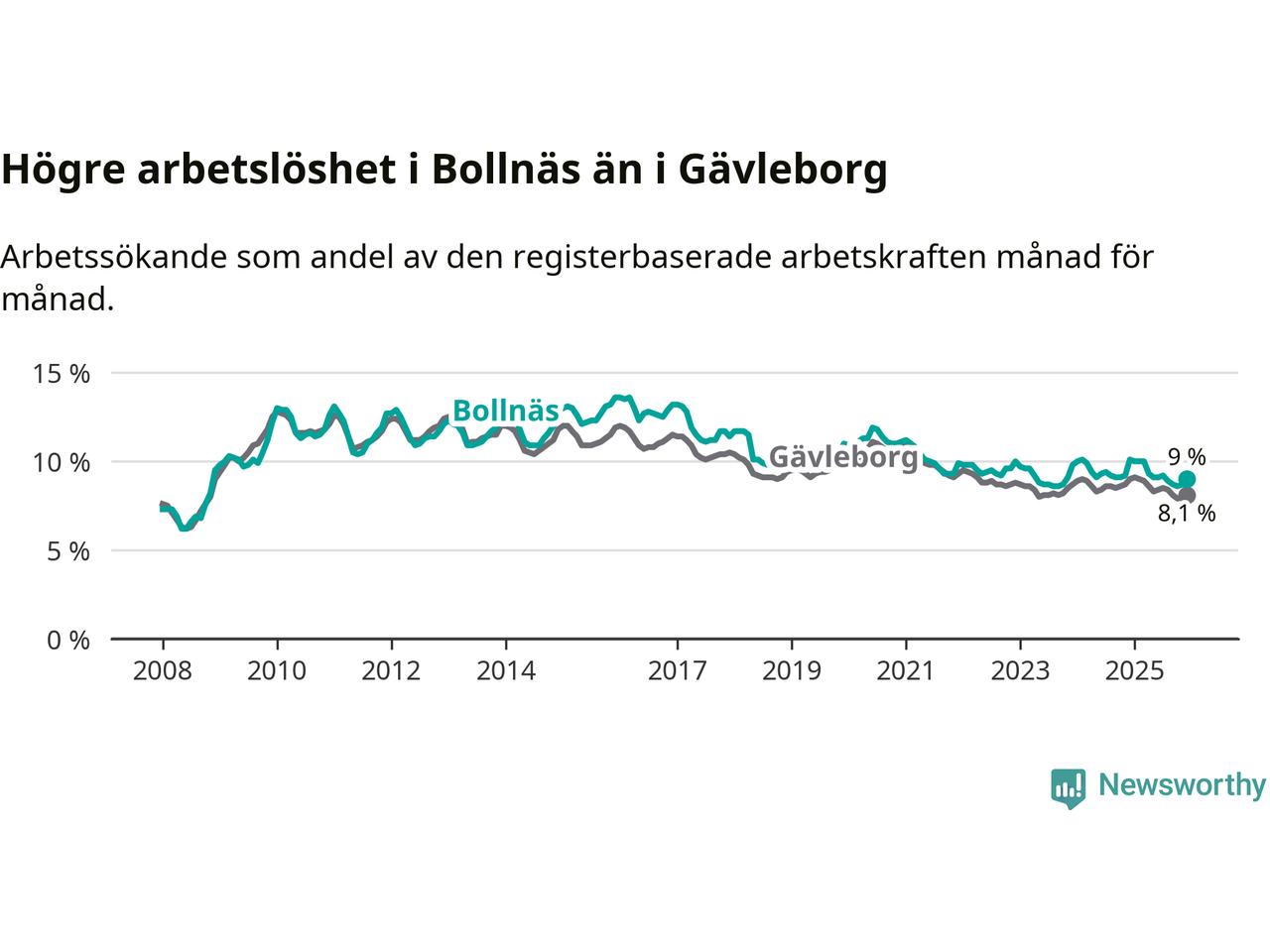 Även om arbetslösheten i Bollnäs alltså minskar, så ligger den fortfarande över snittet i hela Gävleborgs län (9,0 procent i kommunen, jämfört med 8,1 procent i hela länet). Hudiksvall har den lägsta arbetslösheten i länet (6,0 procent), medan Söderhamn har den högsta (9,1 procent). För att Bollnäs skulle komma ner i samma arbetslöshetsnivå som Hudiksvall skulle 360 personer behöva sysselsättas.