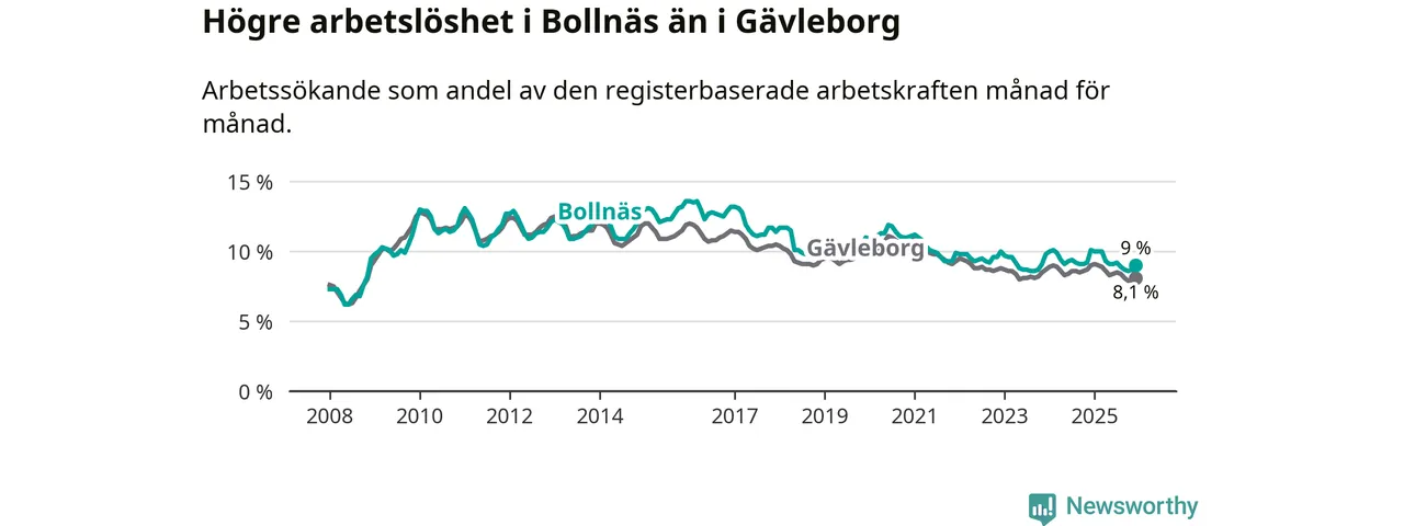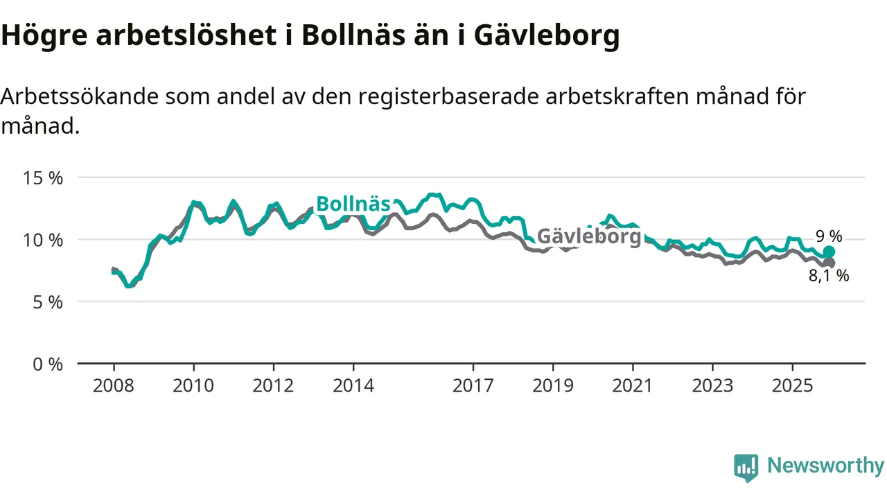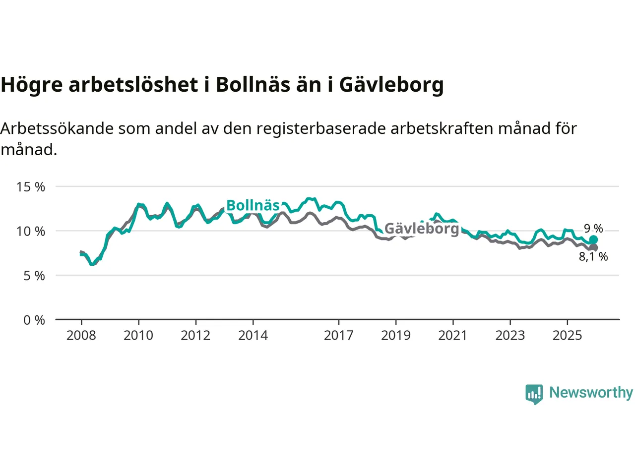 Under december månad rapporterade Bollnäs kommun en total arbetslöshet på 9,0 procent. Det är en minskning jämfört med samma tidpunkt i fjol (−1,1 procentenheter). Även i Gävleborgs län sjunker arbetslösheten .